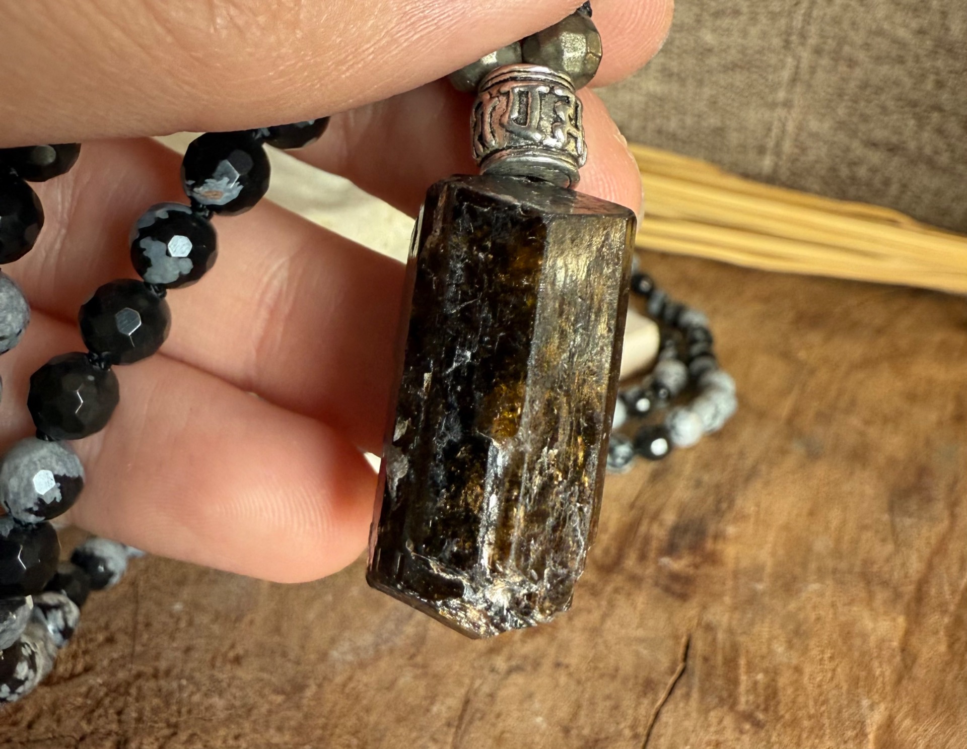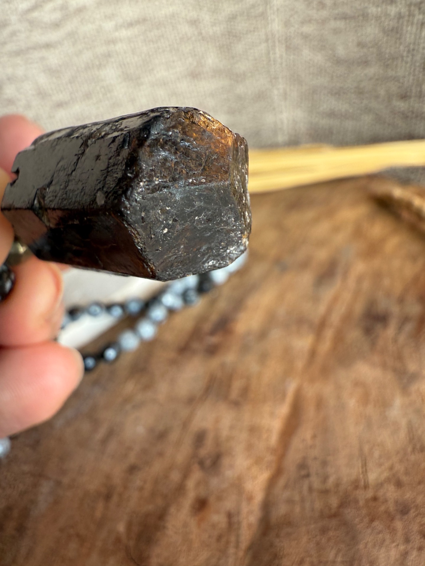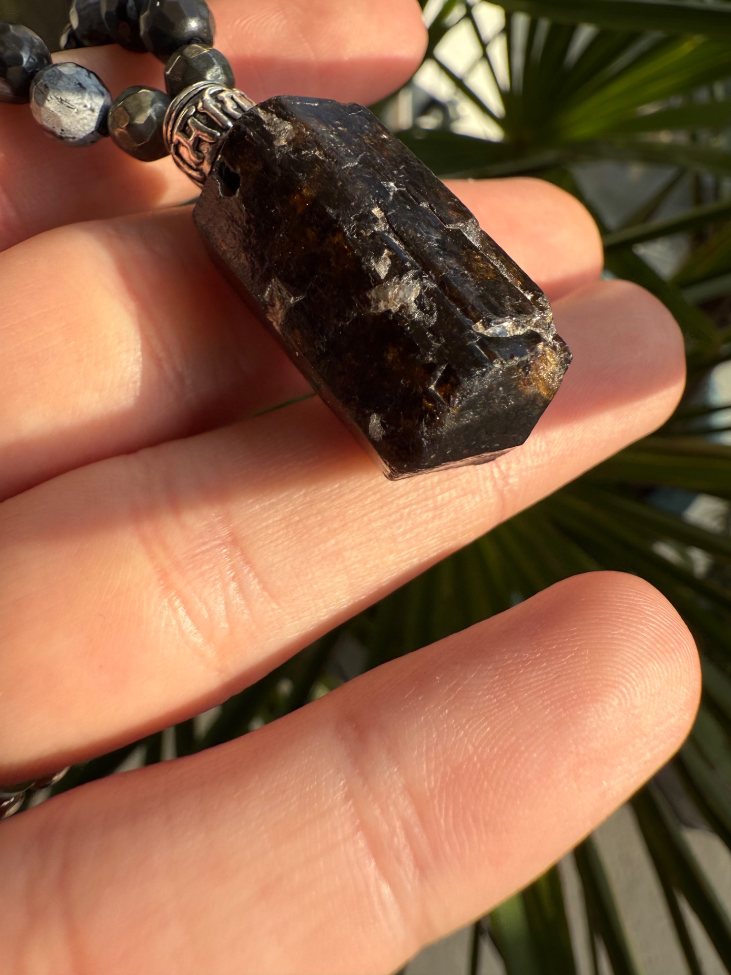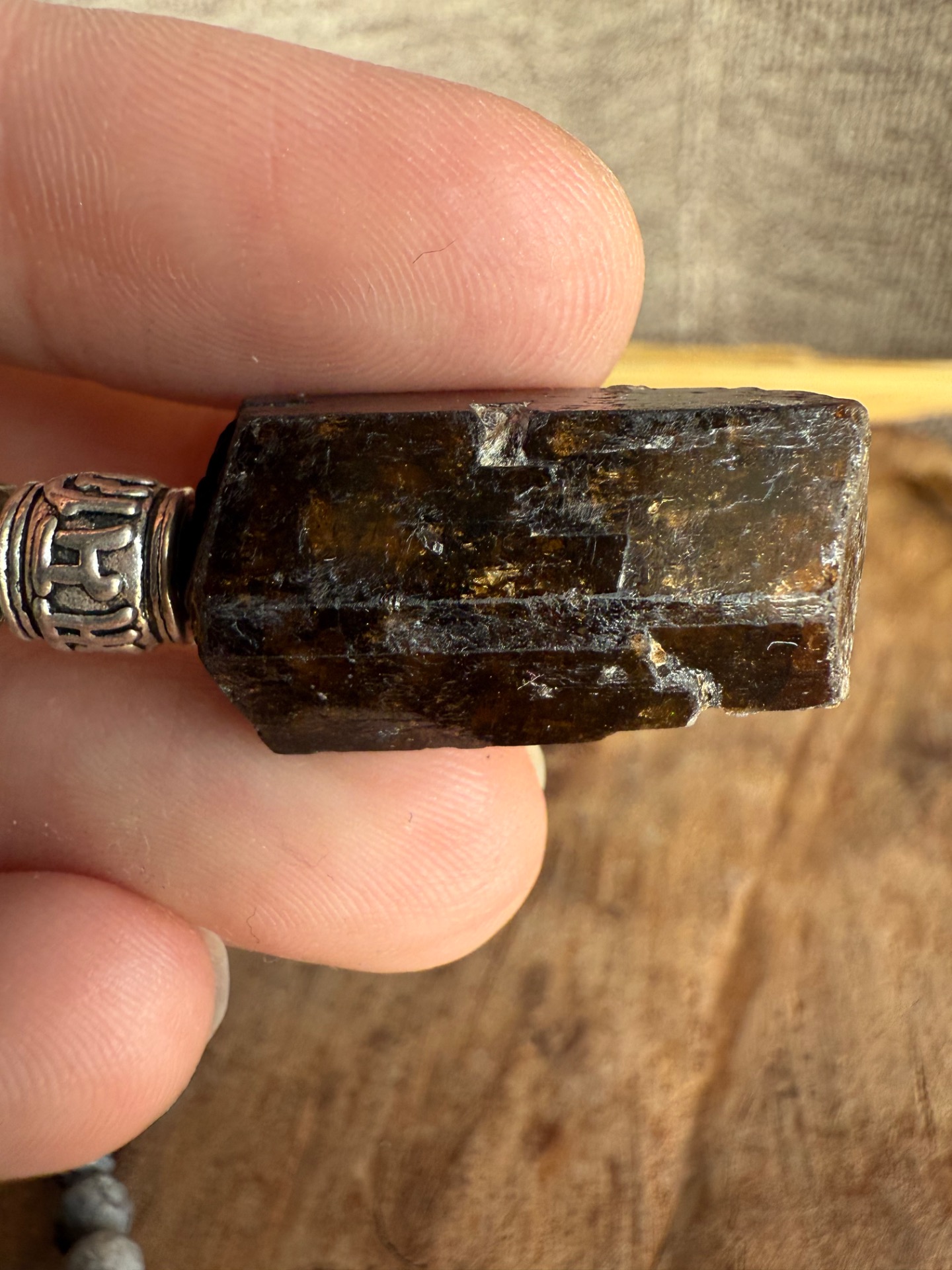 Dominantou náhrdelníka je surový kryštál Green Tourmaline, ktorý si zachováva svoju autentickú prírodnú podobu. Nad ním sa nachádza tibetská korálka doplnená o dva kamene Pyritu, ktoré symbolicky predstavujú silu, ochranu a stabilitu.
