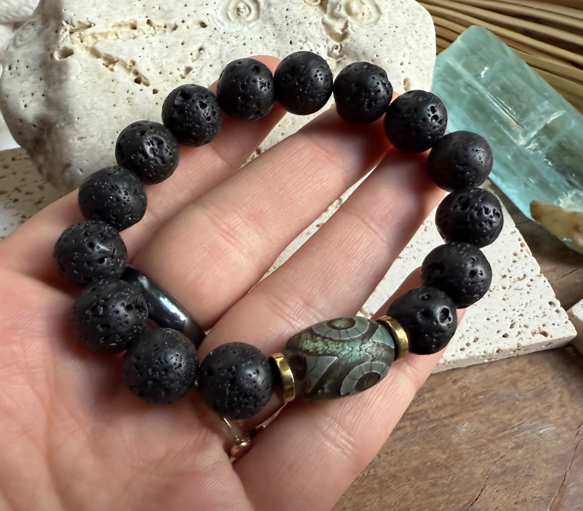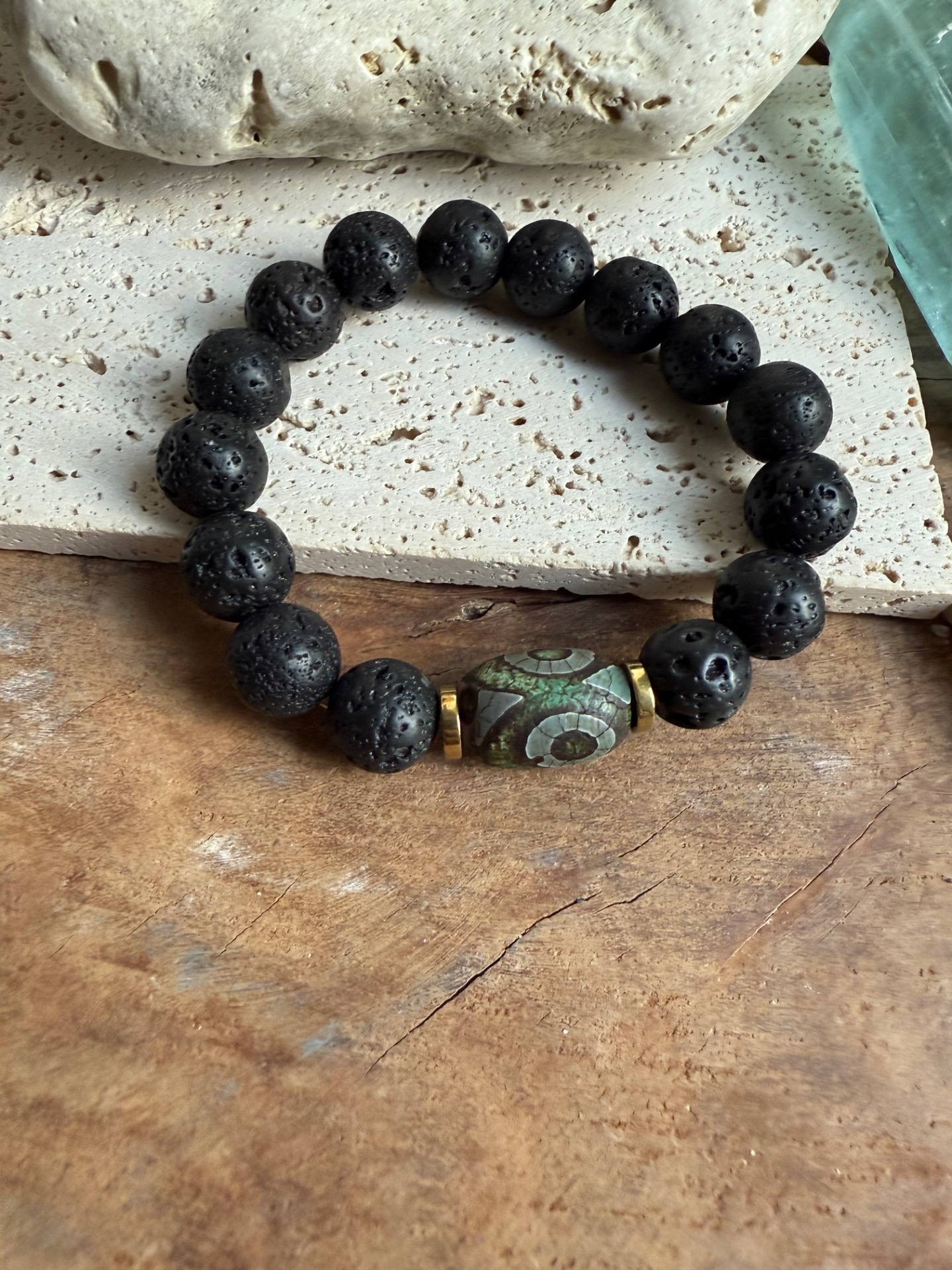 Prineste do svojho života novú energiu a pozitívnu zmenu s týmto unikátnym unisex náramkom, ktorý spája lávový kameň a Dzi achát. Každý kameň nesie svoj vlastný význam a spoločne podporujú osobný rast, odvahu a prílev šťastia.