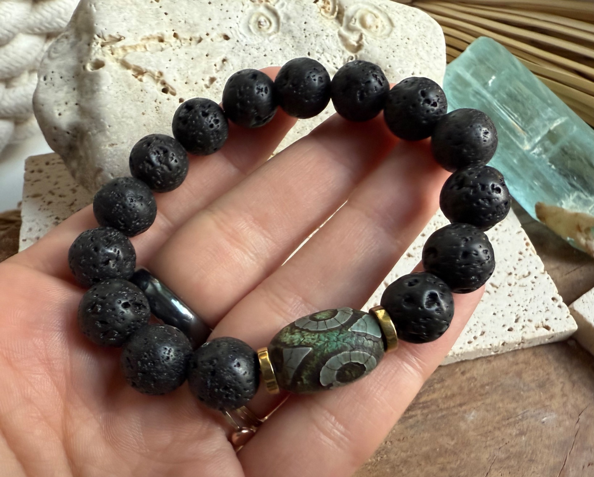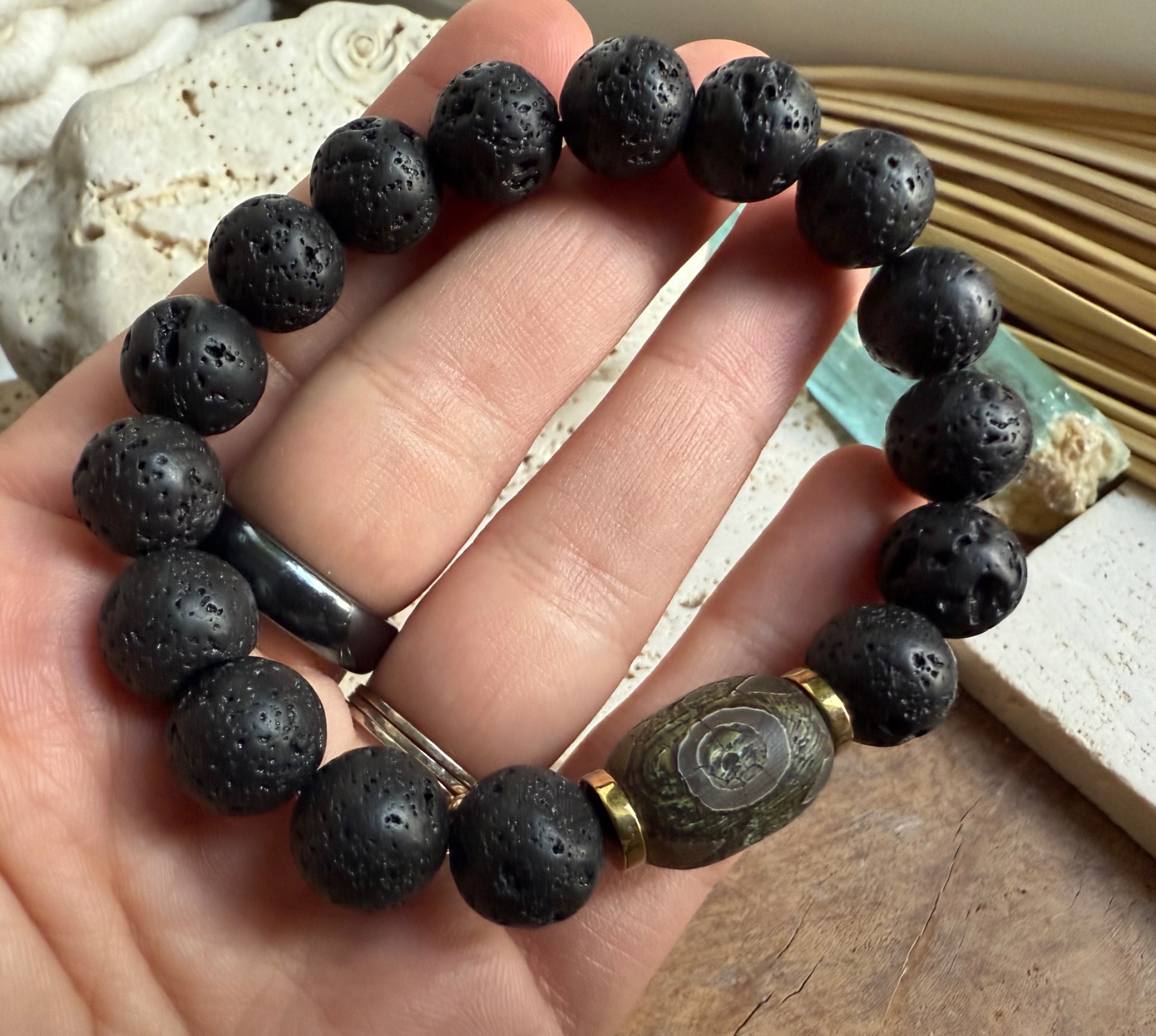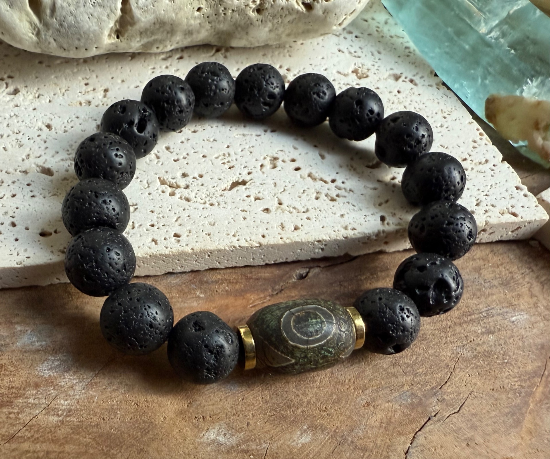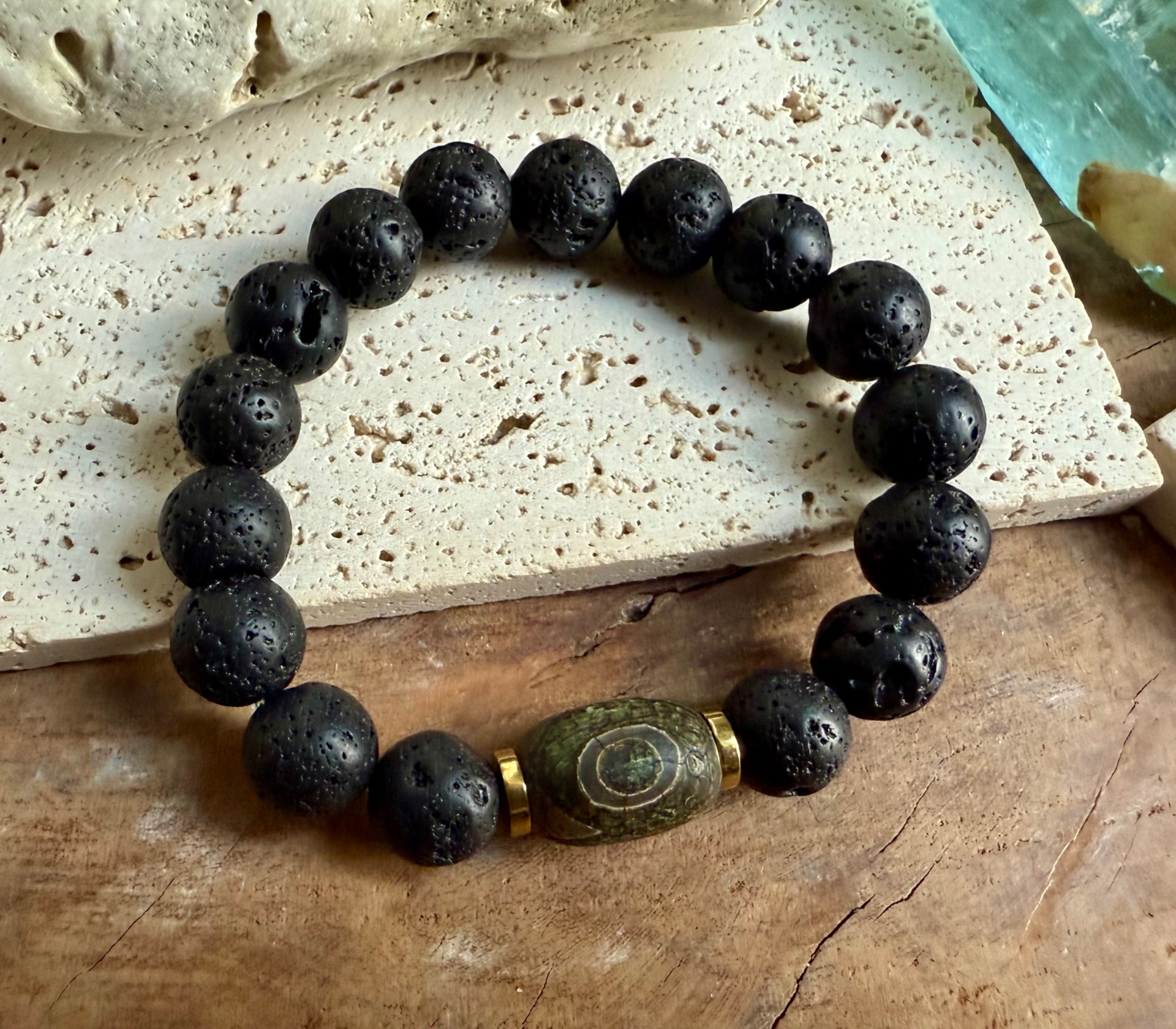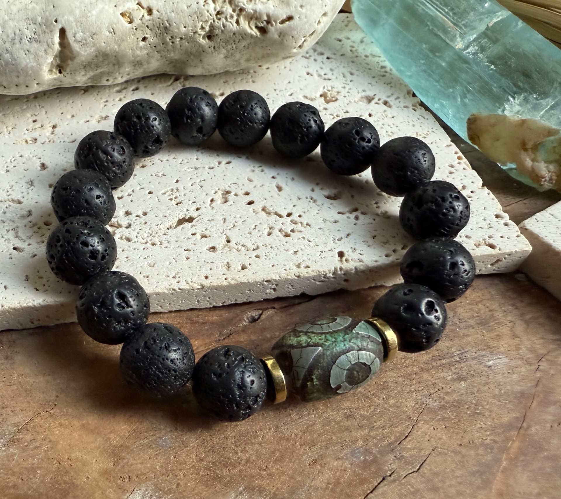 Unisex náramok z minerálov – lávový kameň 12mm + Dzi achát – Šťastná zmena