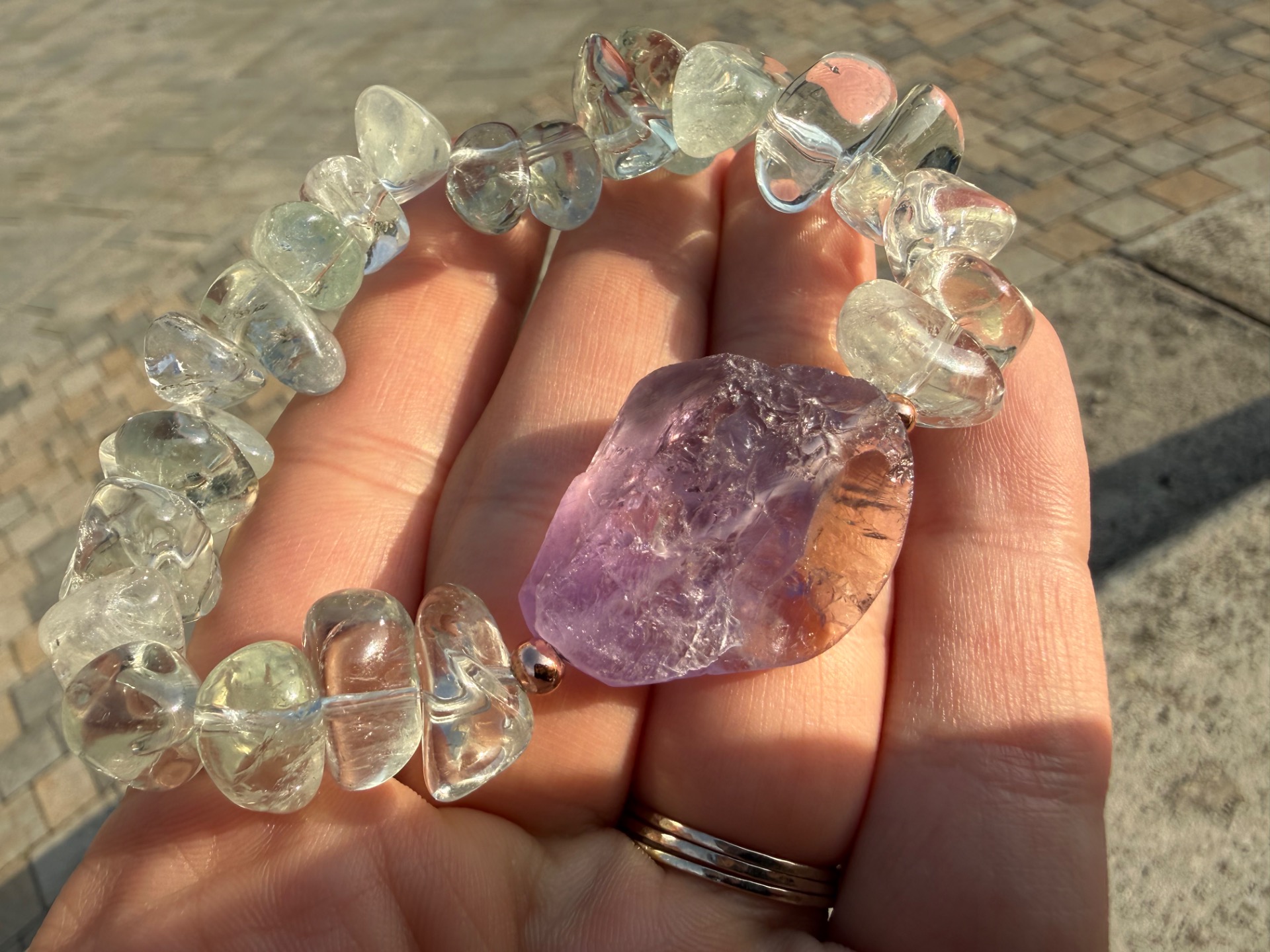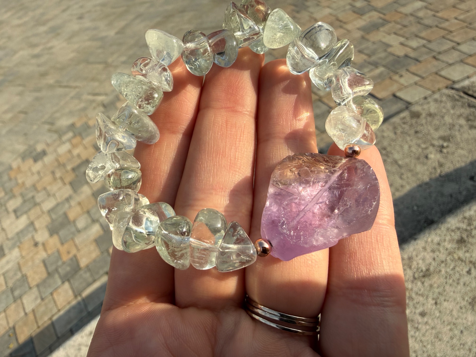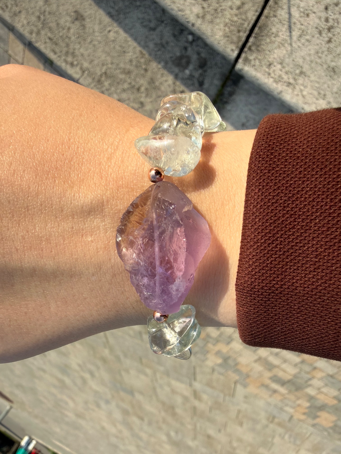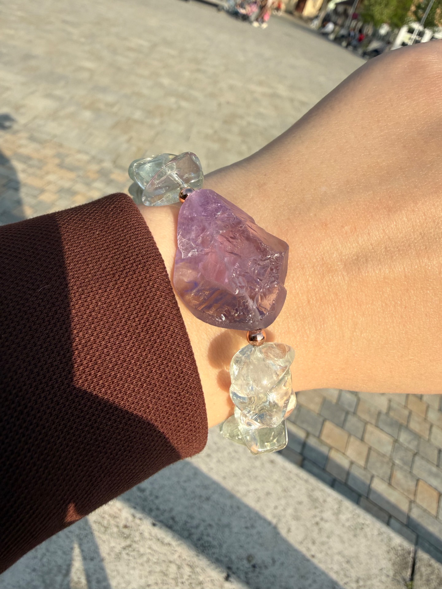 Každý kus je originál. Surový ametyst má vždy jedinečný tvar a štruktúru, čo zaručuje, že nenájdete dva rovnaké náramky. Kombinácia minerálov nie je náhodná – nesie v sebe hlboký význam a zámer. Prasiolit v tejto kvalite patrí medzi vzácnejšie kamene, čo robí tento šperk ešte hodnotnejším.