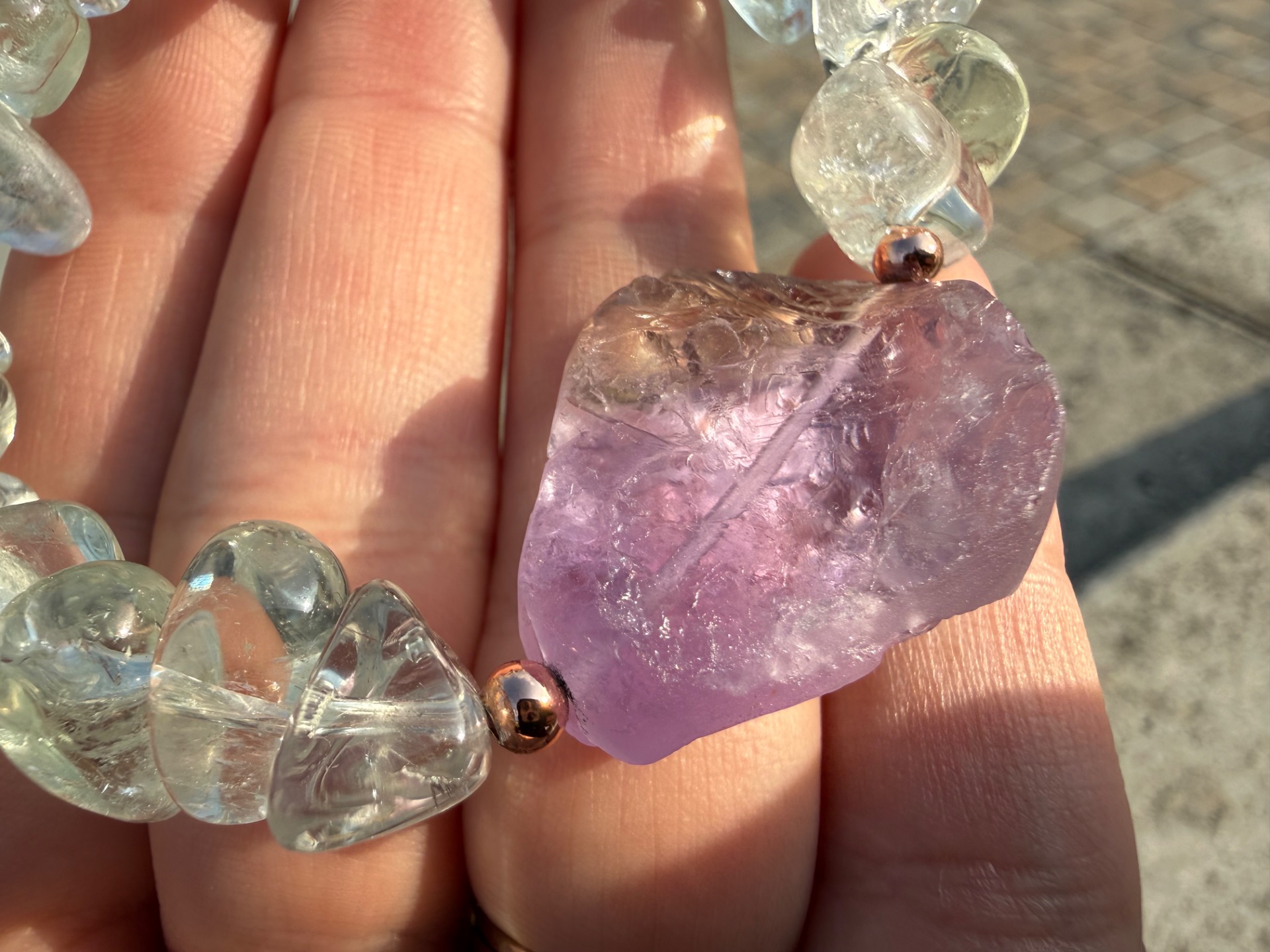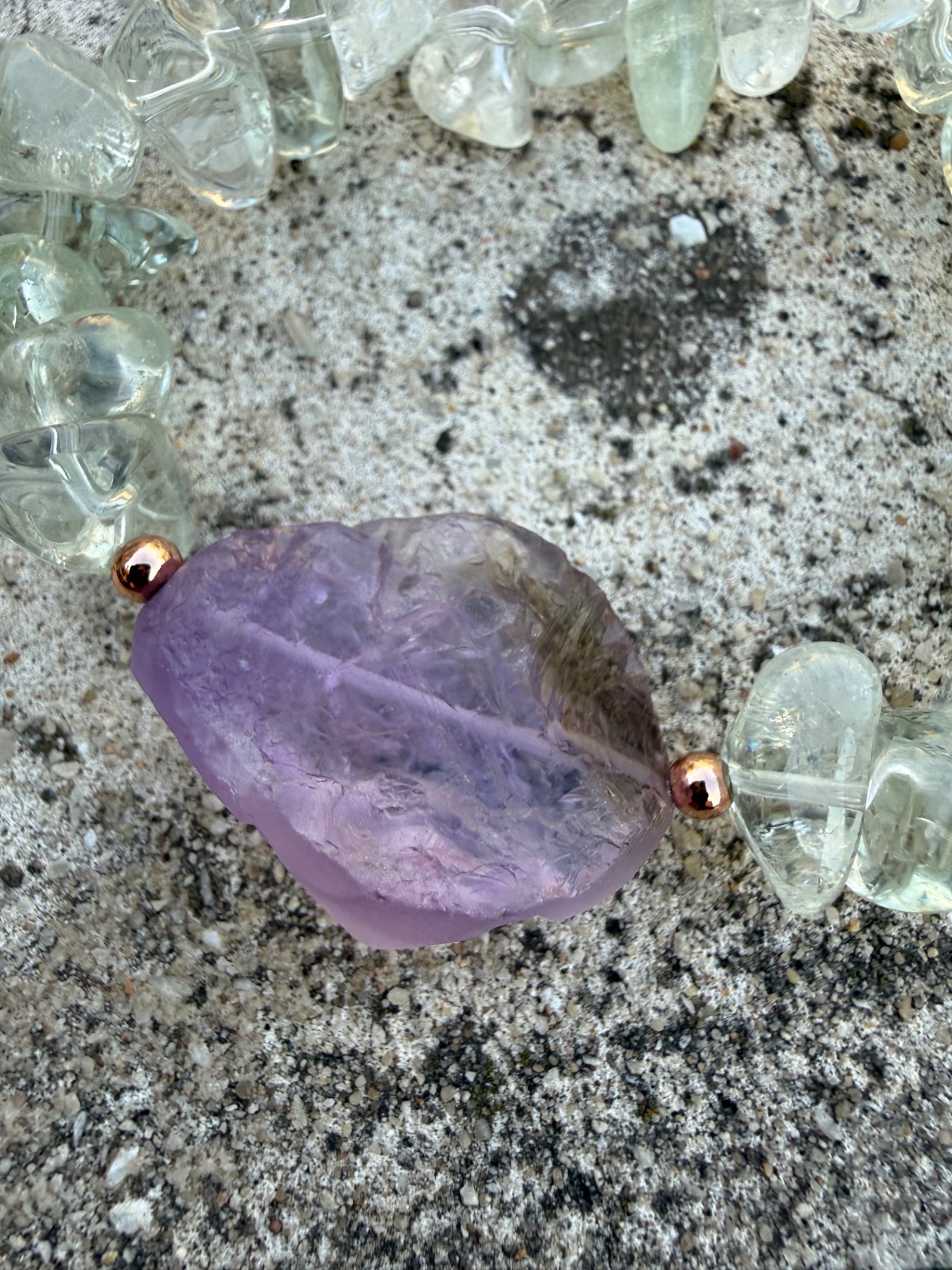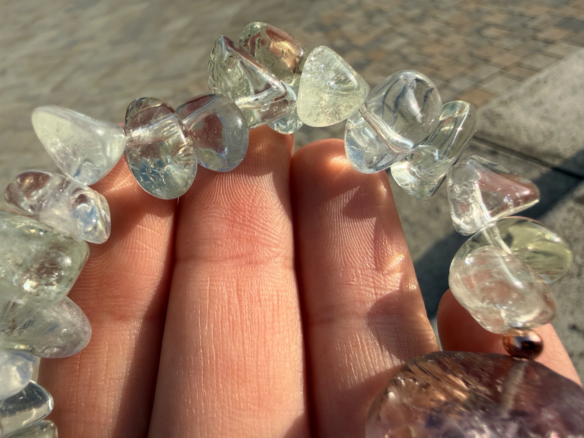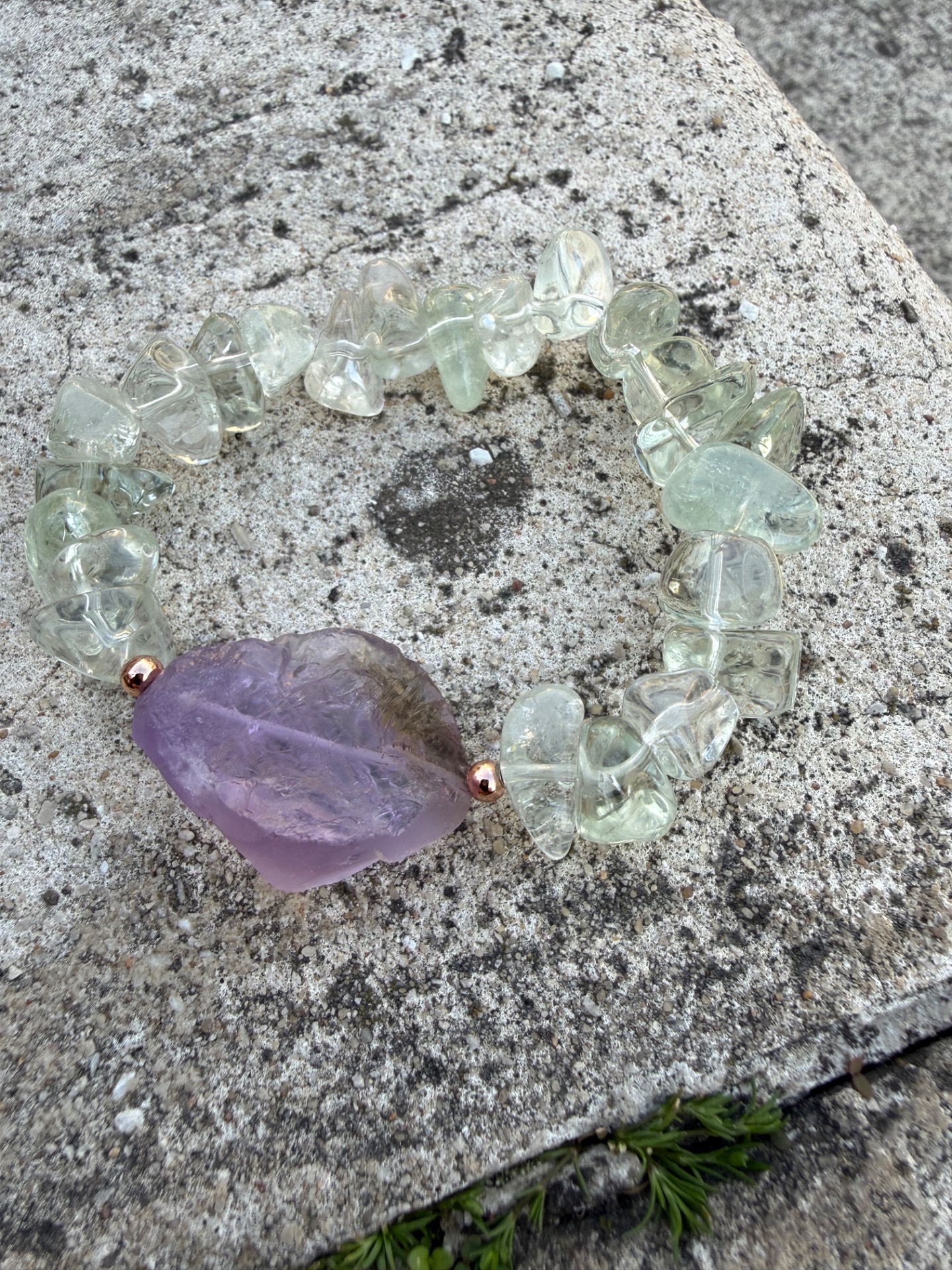 Každý kus je originál. Surový ametyst má vždy jedinečný tvar a štruktúru, čo zaručuje, že nenájdete dva rovnaké náramky. Kombinácia minerálov nie je náhodná – nesie v sebe hlboký význam a zámer. Prasiolit v tejto kvalite patrí medzi vzácnejšie kamene, čo robí tento šperk ešte hodnotnejším.