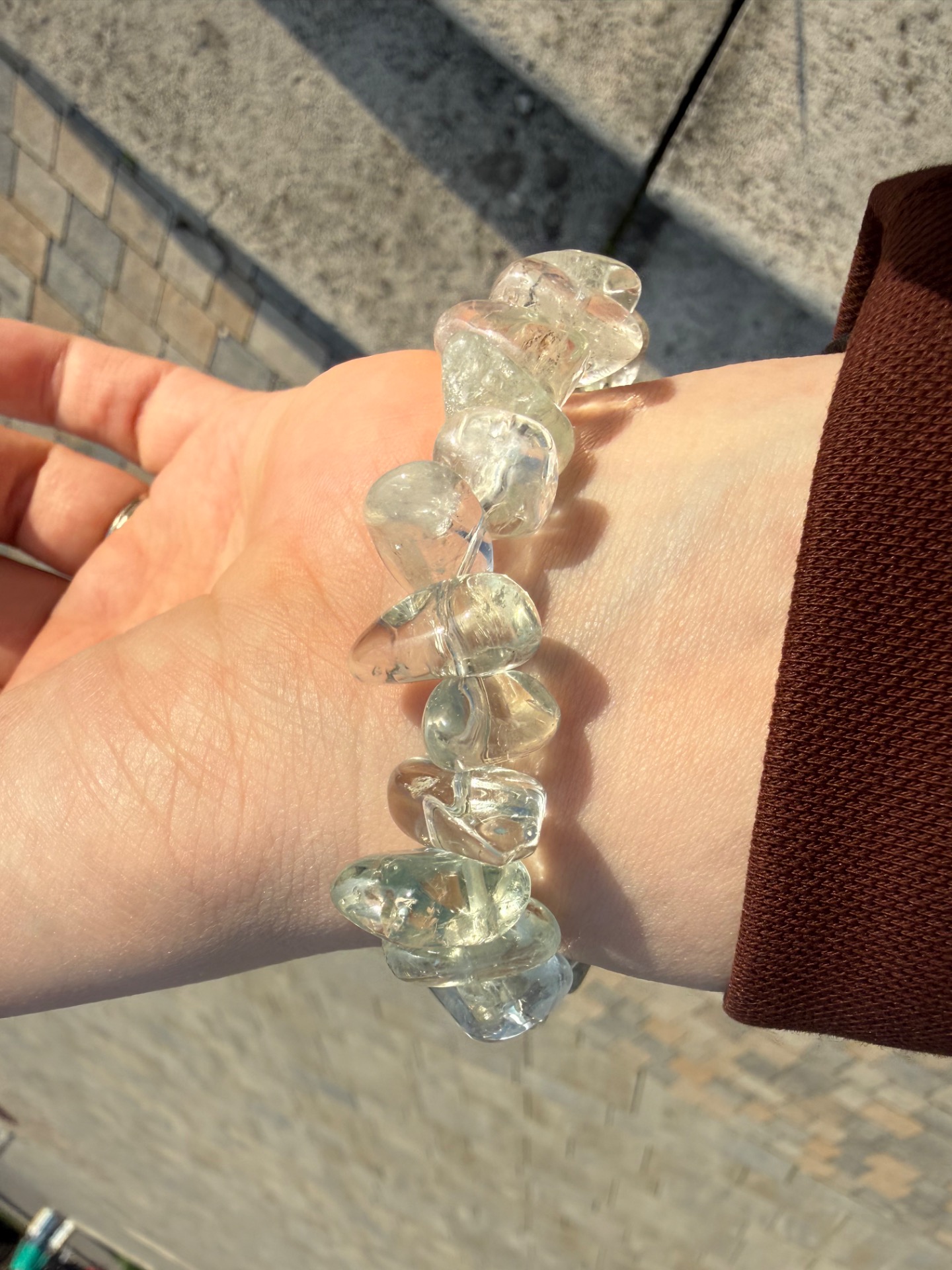 Tento jedinečný náramok spája vzácny prasiolit – zelený klenot vzniknutý transformáciou ametystu – so surovým ametystom, ktorý si zachoval svoju prirodzenú, nedotknutú silu. Je to spojenie dvoch energií jednej podstaty, zachytených v rôznych fázach vývoja. Jemnosť a hĺbka. Pokoj a vedomie. Srdce a myseľ.
