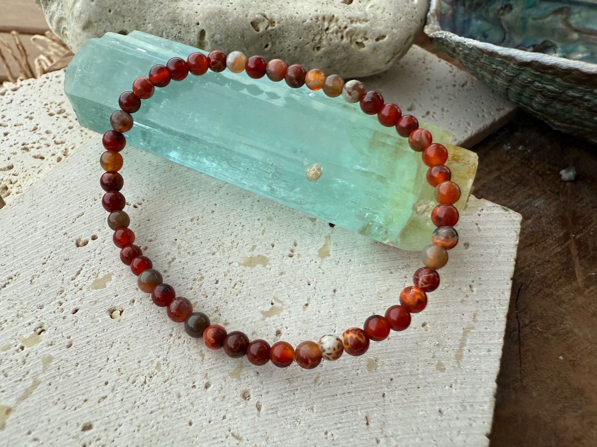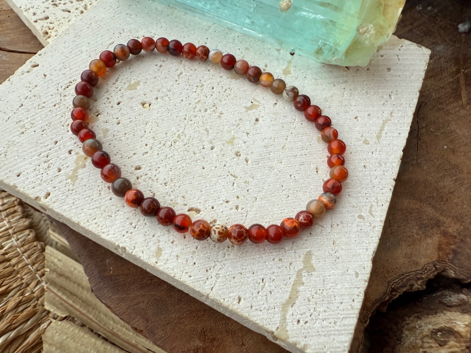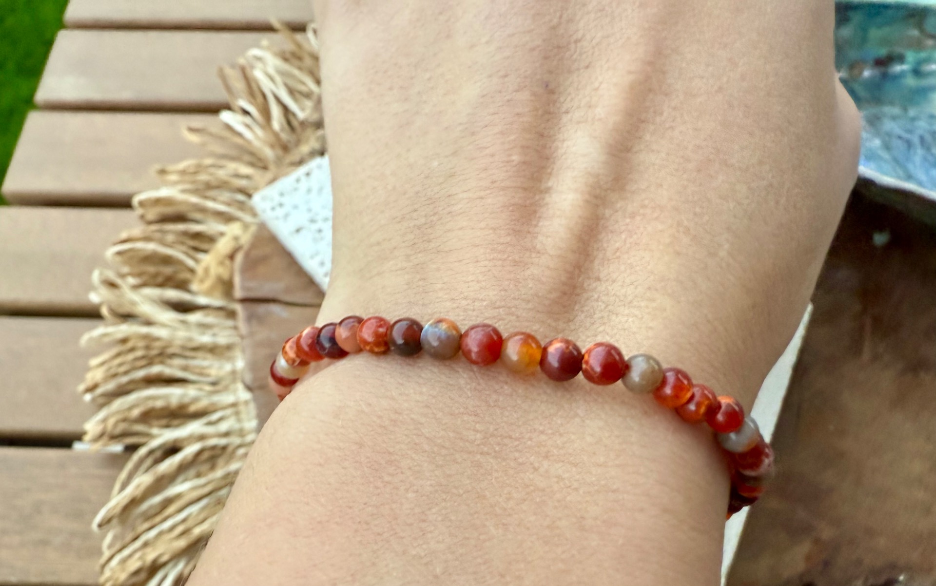 Jemný náramok z hladkých mini korálok prírodného červeného achátu pôsobí teplo, stabilne a energicky. Jeho zemité červené odtiene symbolizujú vitalitu, uzemnenie a spojenie so Zemou. Náramok je navlečený na kvalitnej elastickej gumičke a je ideálny na každodenné nosenie.