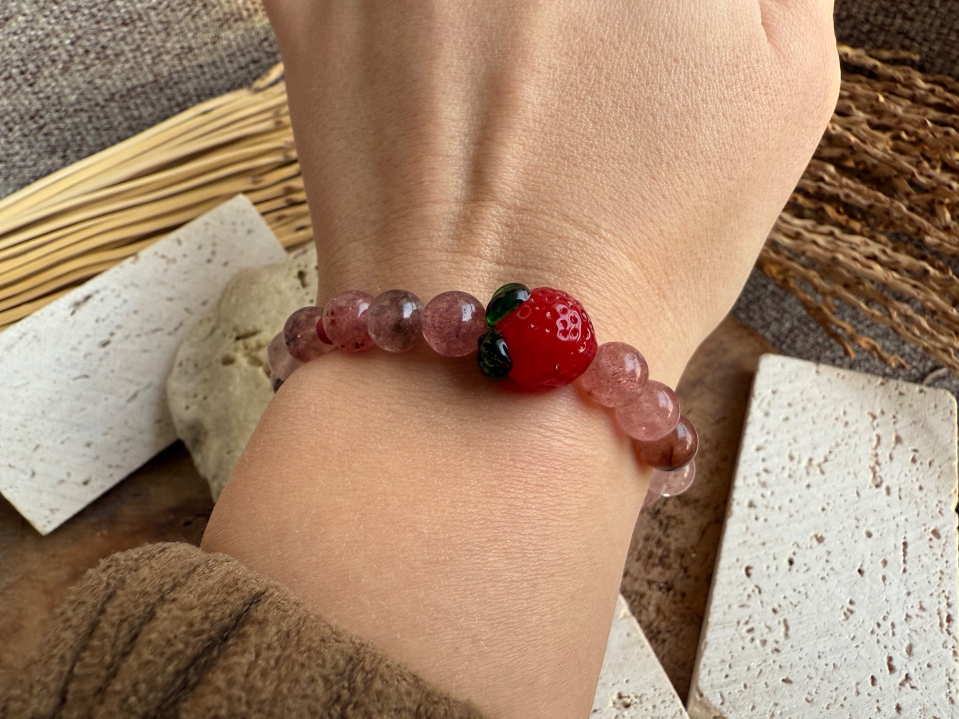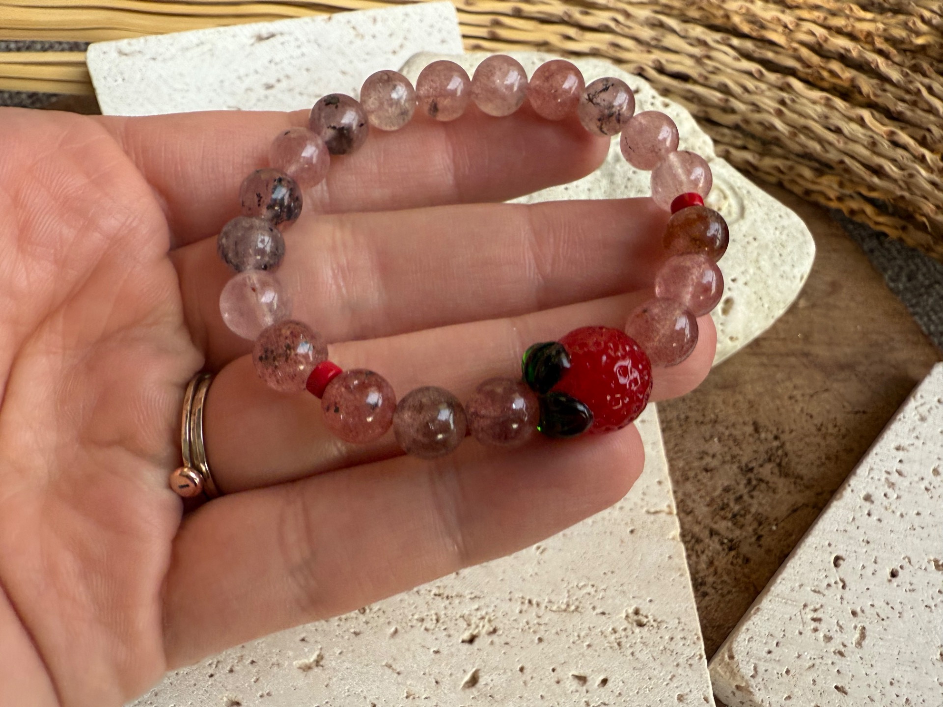 Tento náramok z jahodového kremeňa v sebe nesie jemnú, sladkú a láskavú energiu. Jeho nežné ružovo-červené tóny s prirodzeným iskrením pripomínajú zrelú jahodu a symbolizujú radosť, ženskosť, vášeň a otvorené srdce. Komponent v tvare jahody dodáva šperku hravý, romantický a originálny charakter, vďaka čomu sa stáva krásnym talizmanom aj výrazným doplnkom.