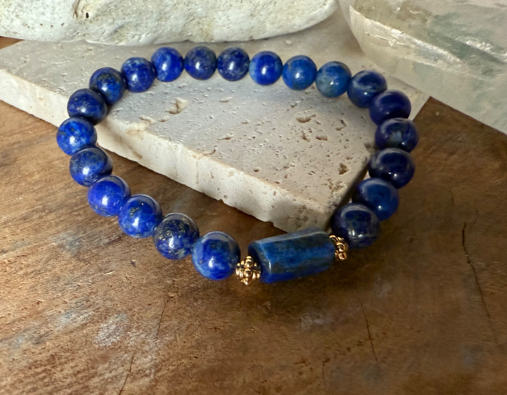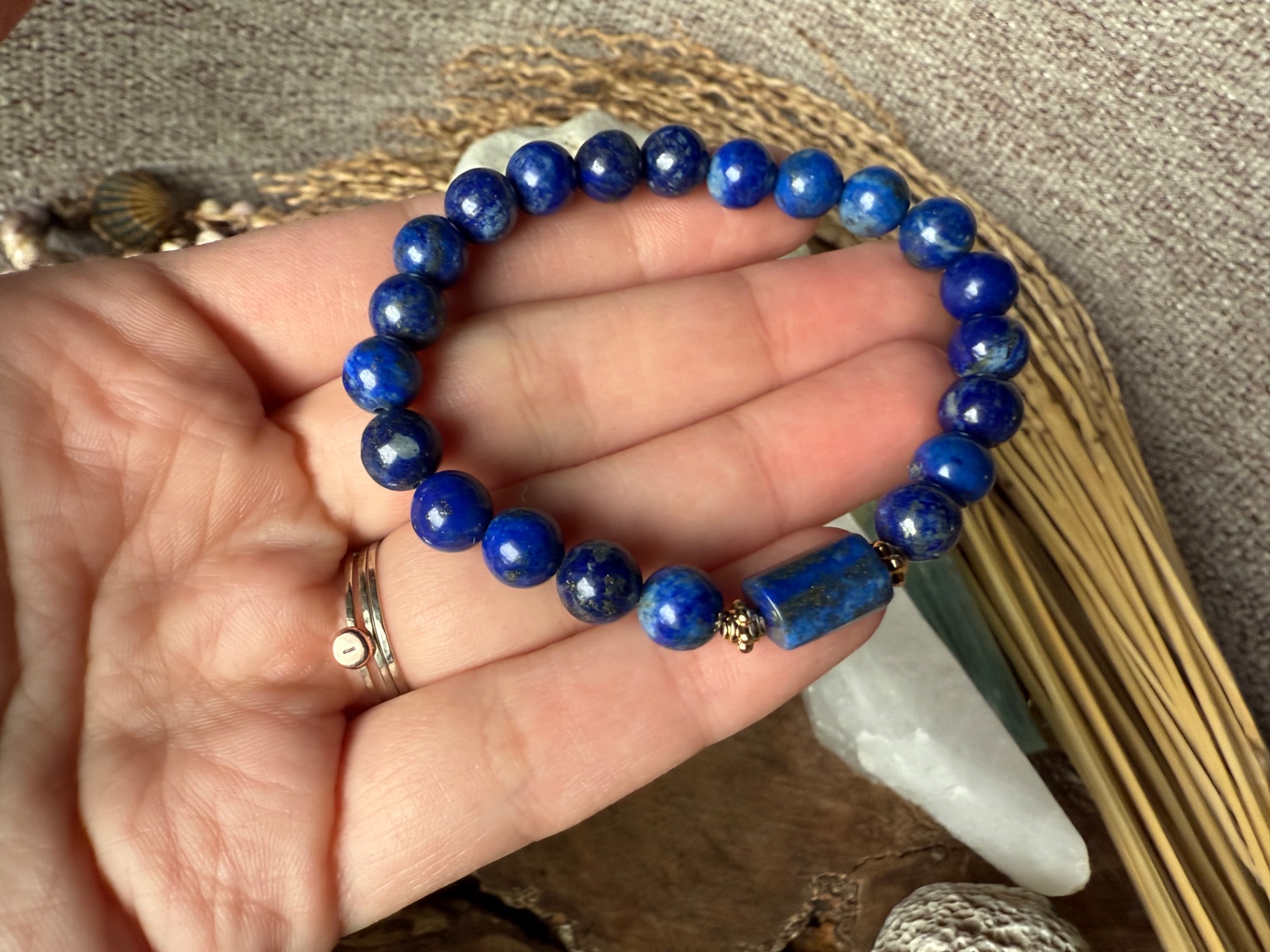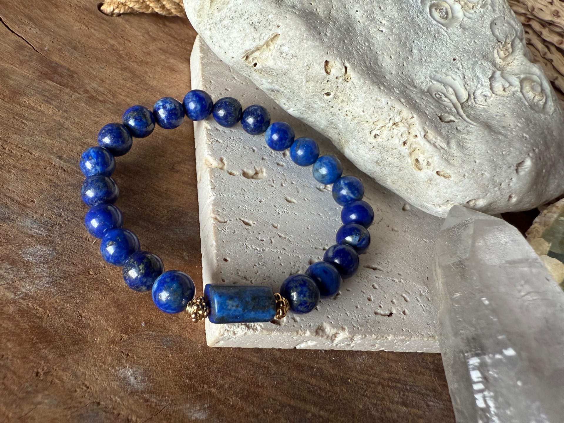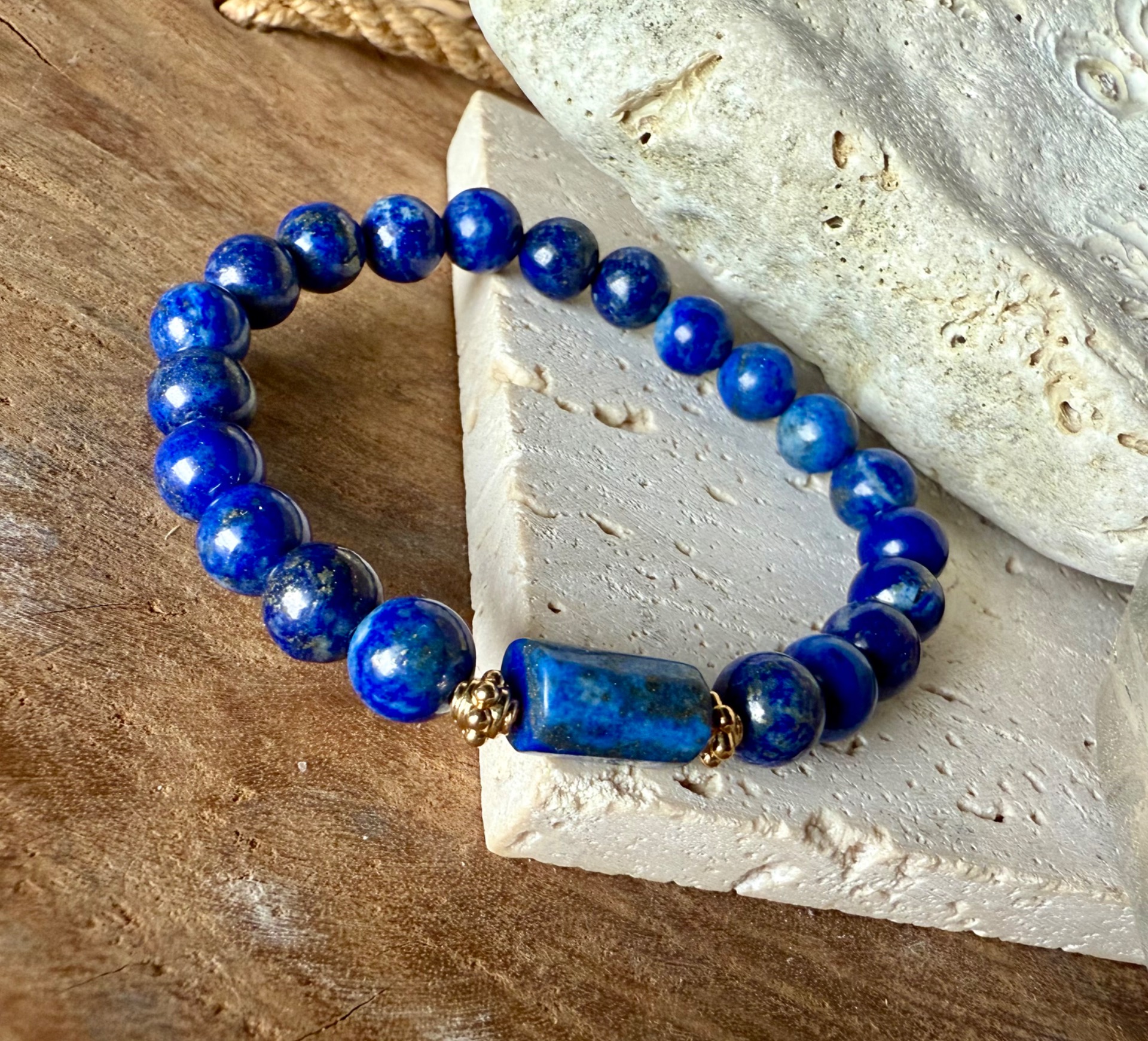 Náramok z prírodného lapisu lazuli v prevedení 8 mm zaujme svojou hlbokou modrou farbou, ktorá je odpradávna symbolom múdrosti, pravdy a vnútornej sily. Dominantným prvkom je plochý kúsok lapisu lazuli v prednej časti, ktorý je jemne oddelený bižutérnymi zlatými komponentmi, čím vzniká elegantný a vyvážený dizajn.
