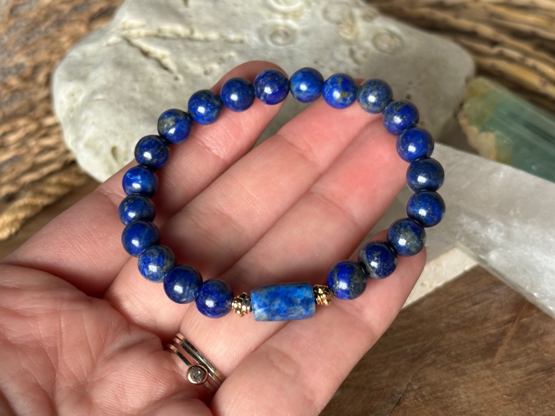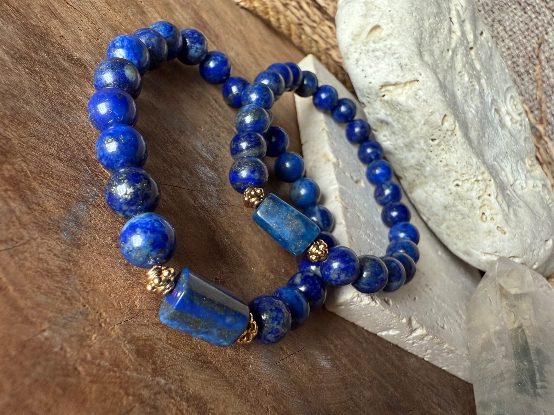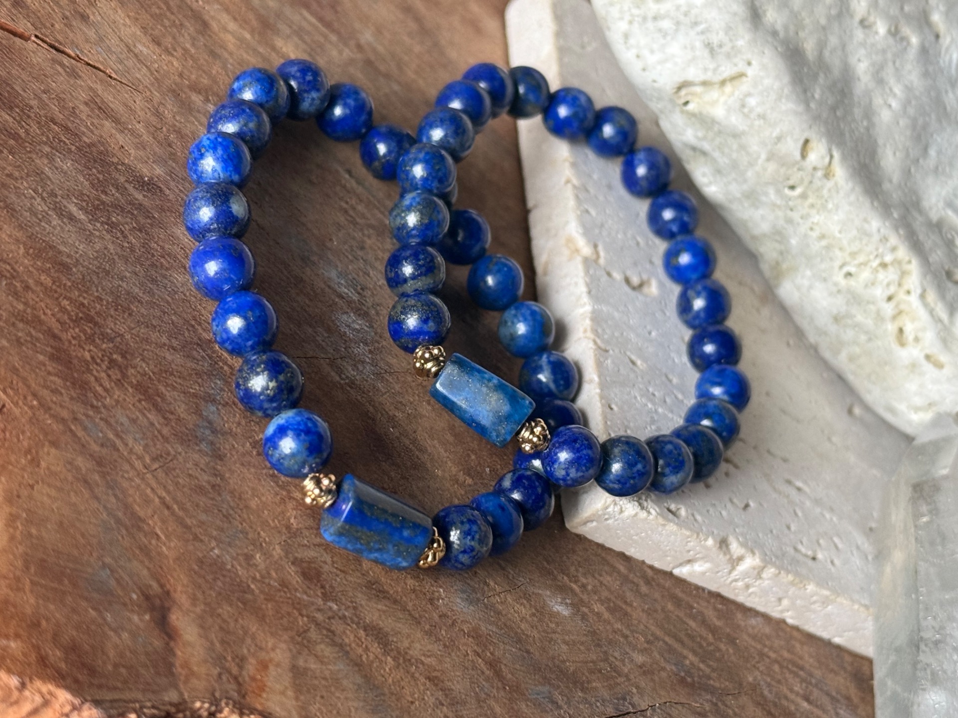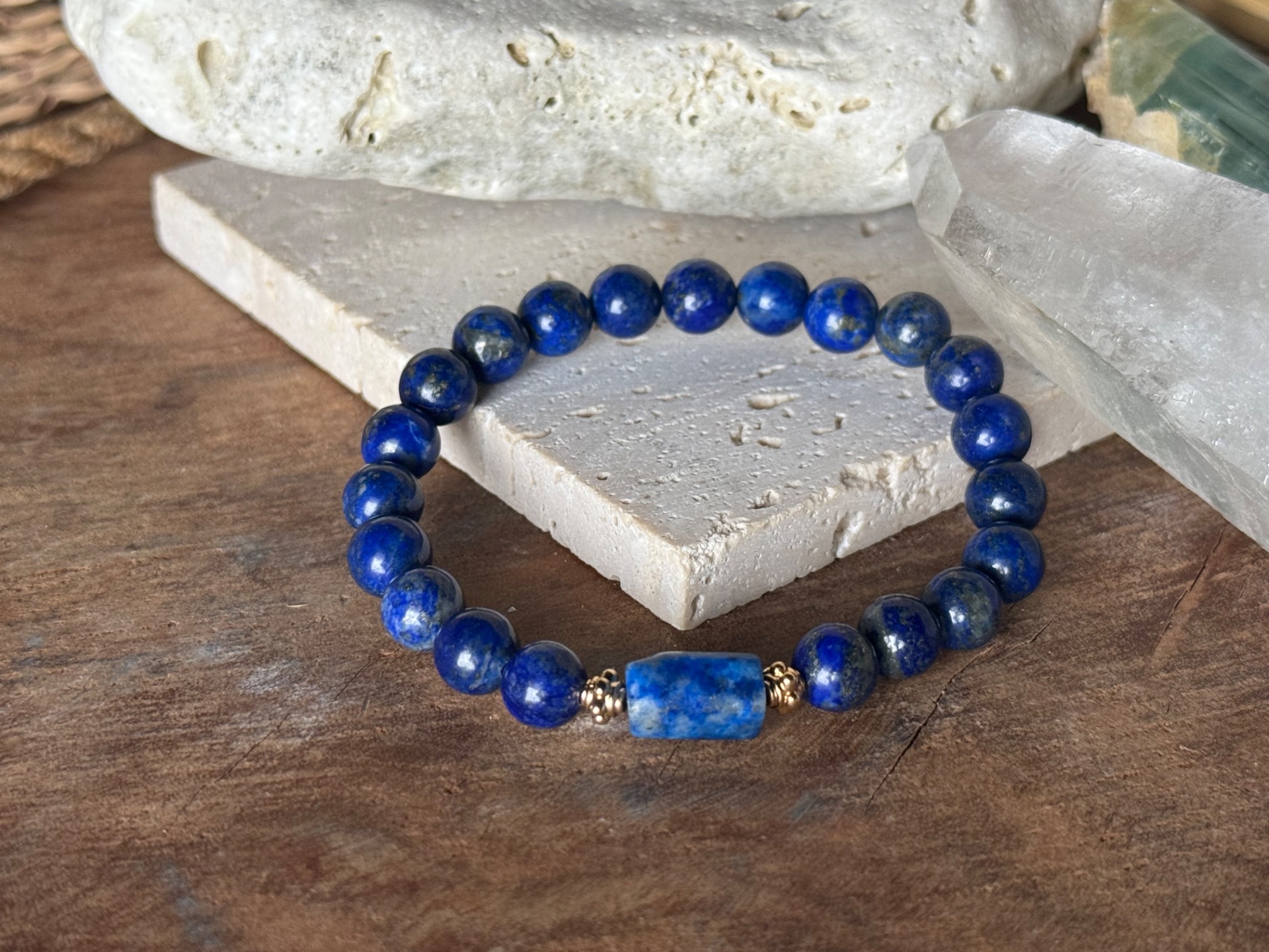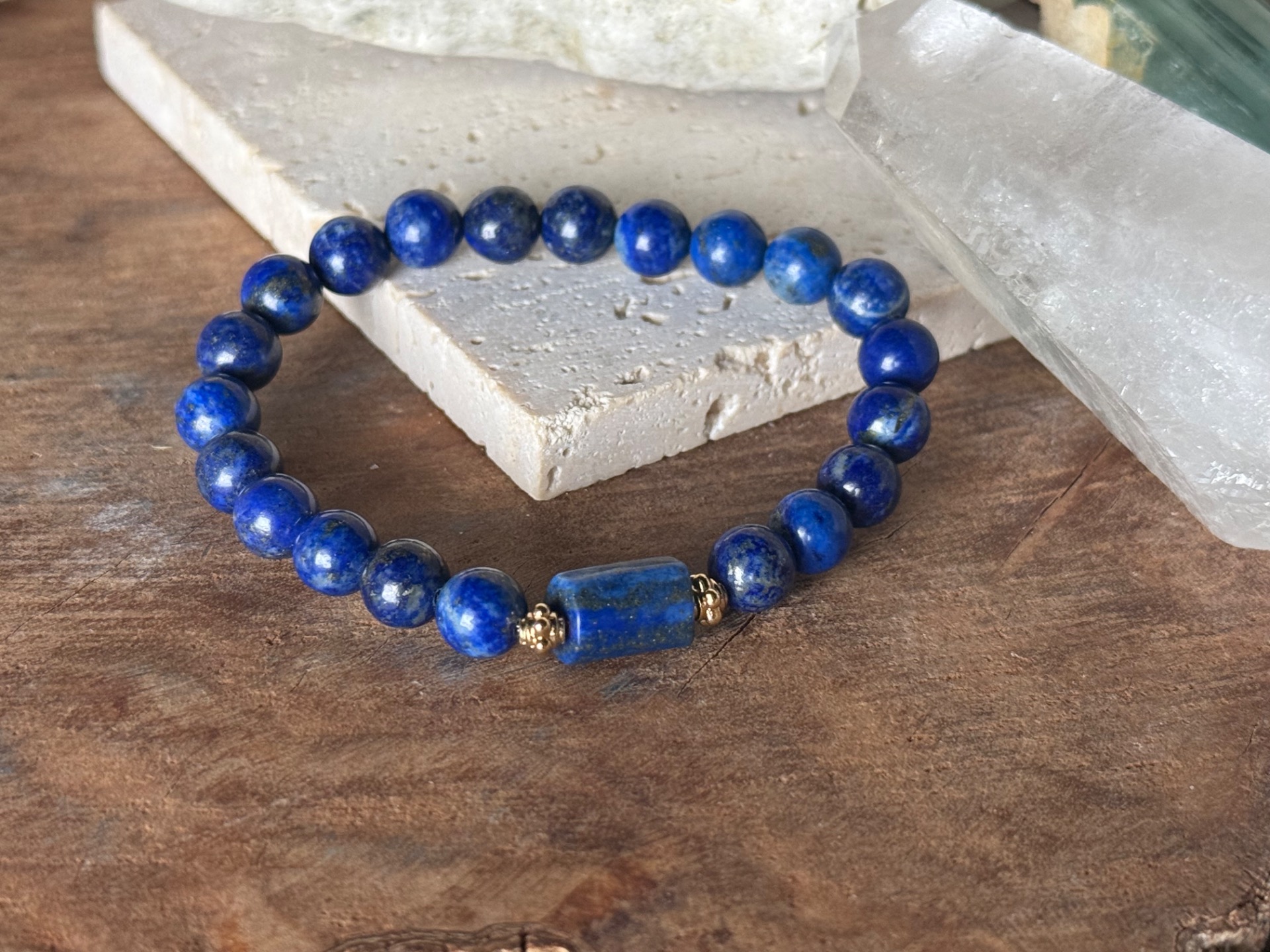 Náramok z prírodného lapisu lazuli v prevedení 8 mm zaujme svojou hlbokou modrou farbou, ktorá je odpradávna symbolom múdrosti, pravdy a vnútornej sily. Dominantným prvkom je plochý kúsok lapisu lazuli v prednej časti, ktorý je jemne oddelený bižutérnymi zlatými komponentmi, čím vzniká elegantný a vyvážený dizajn.