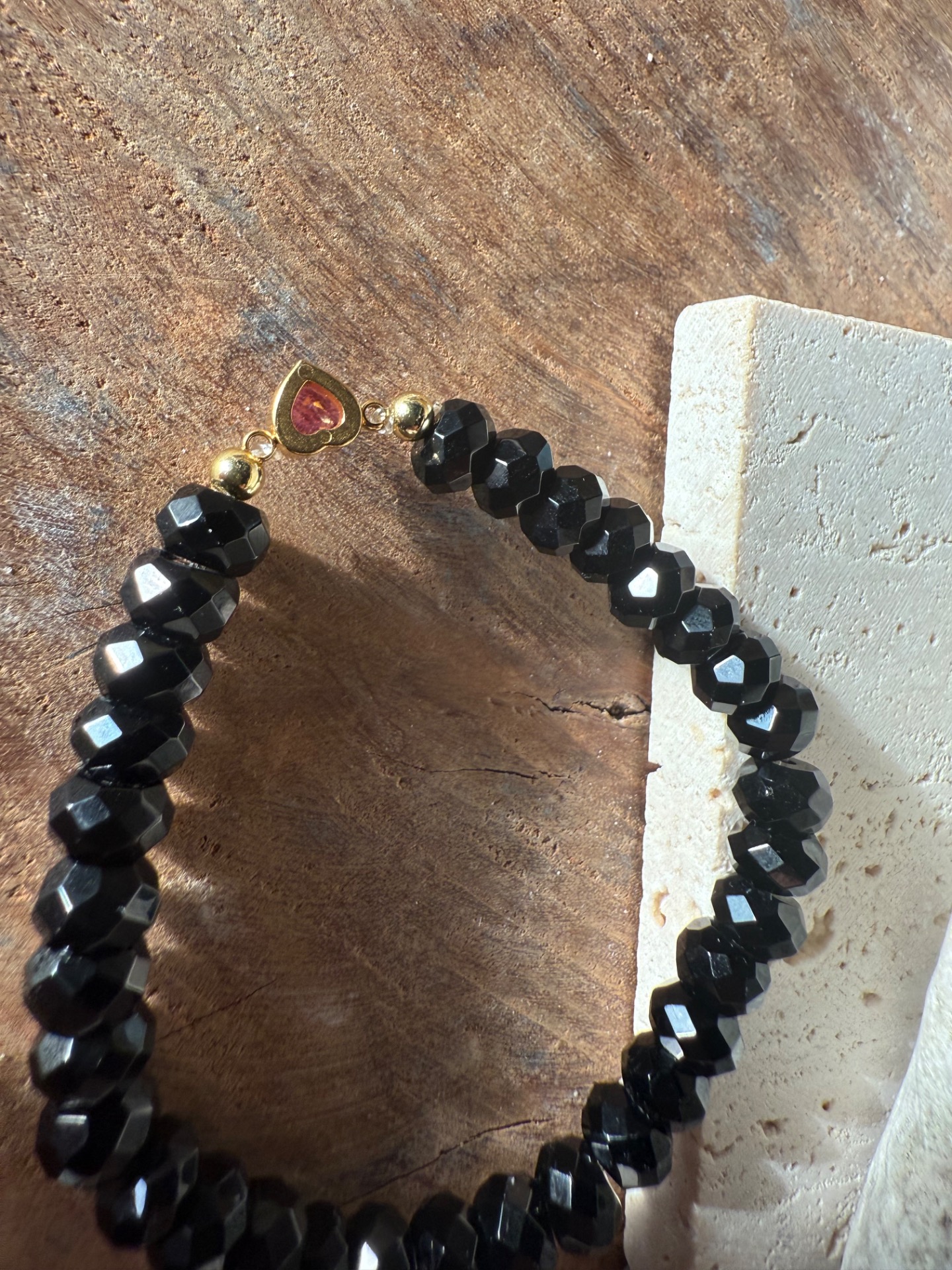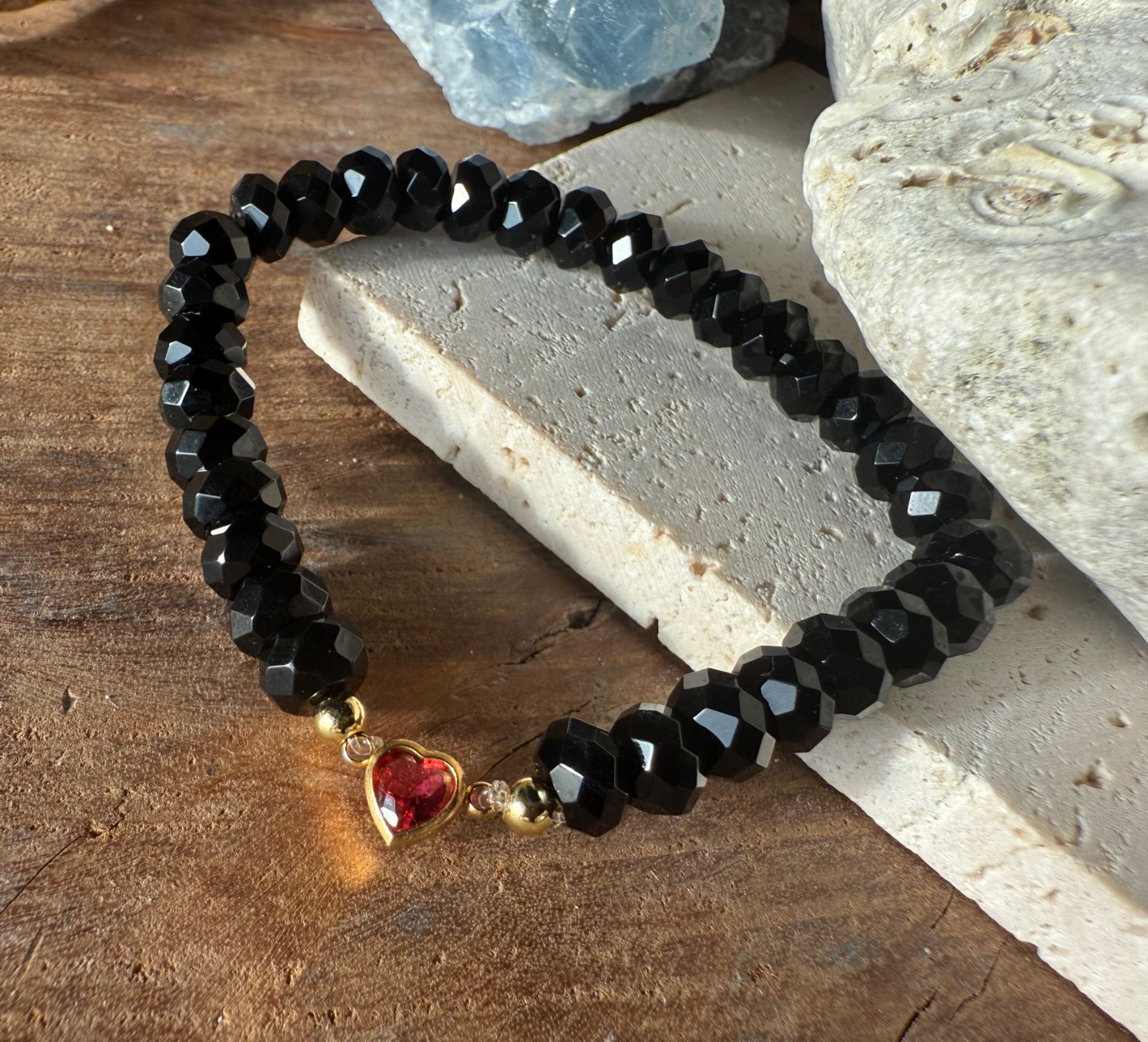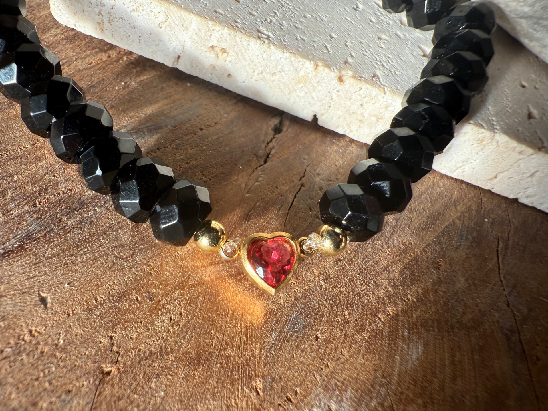 Elegantný náramok z fazetovo brúseného onyxu v tvare rondeliek dopĺňa jemné nerezové srdiečko s červeným kamienkom ukrytým vo vnútri — symbol vášne, lásky a vnútorného tepla.