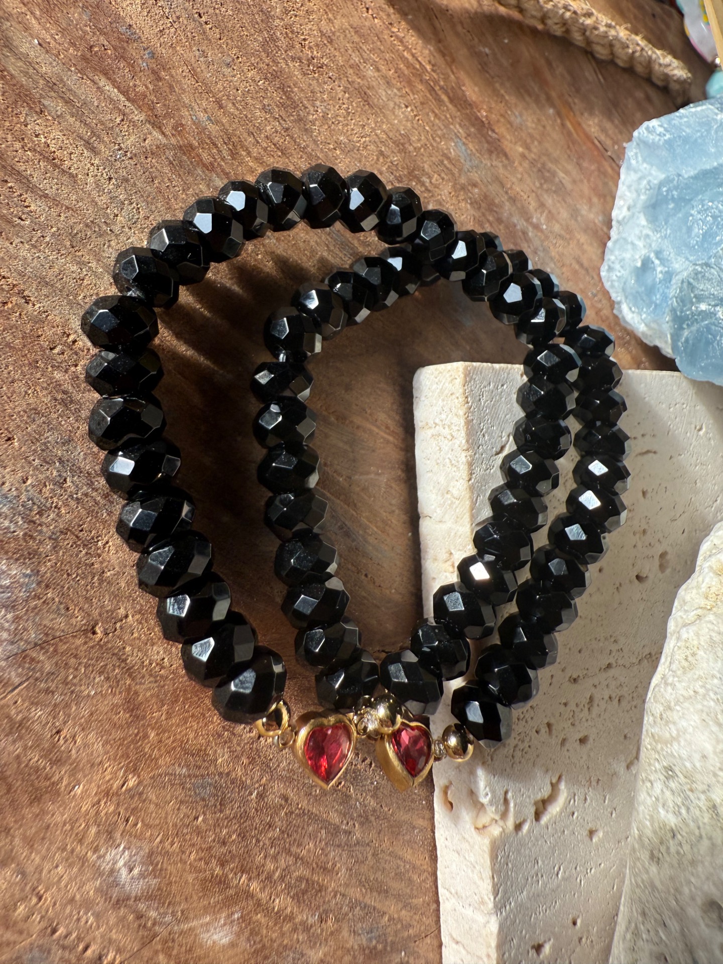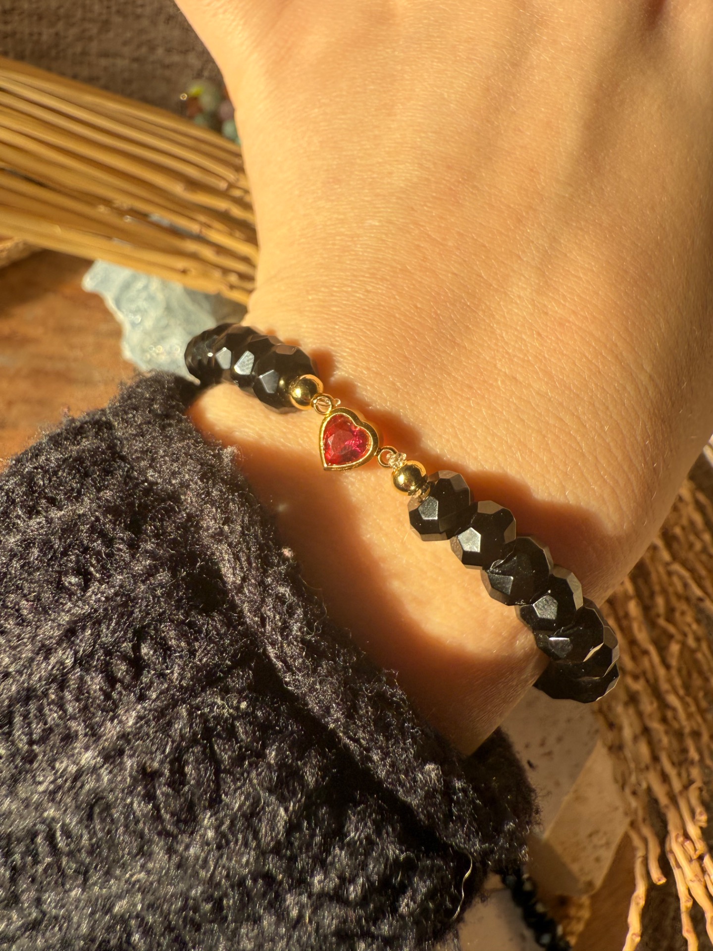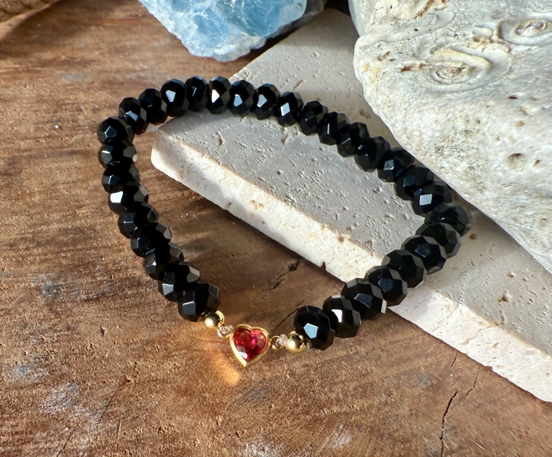 Elegantný náramok z fazetovo brúseného onyxu v tvare rondeliek dopĺňa jemné nerezové srdiečko s červeným kamienkom ukrytým vo vnútri — symbol vášne, lásky a vnútorného tepla.