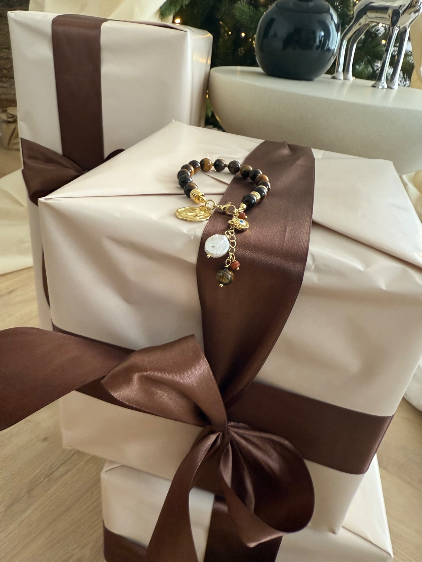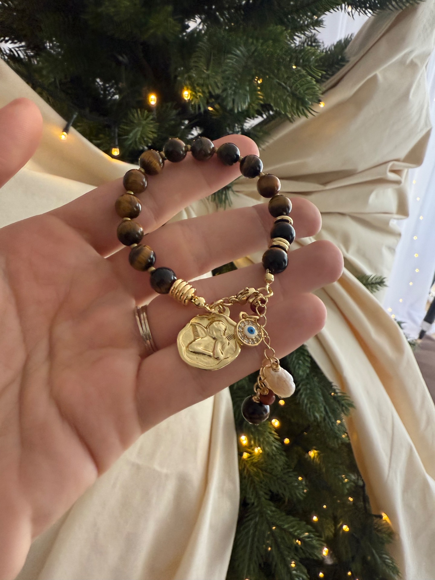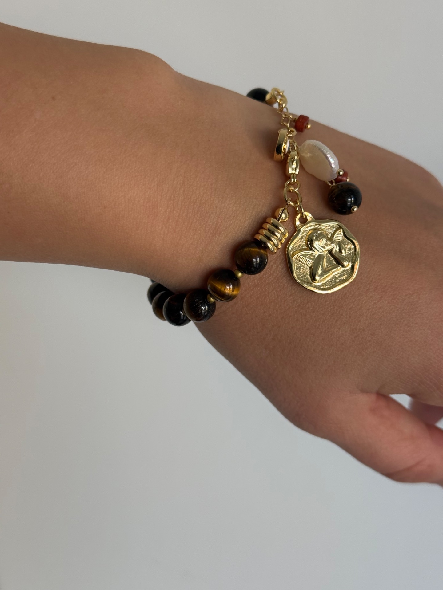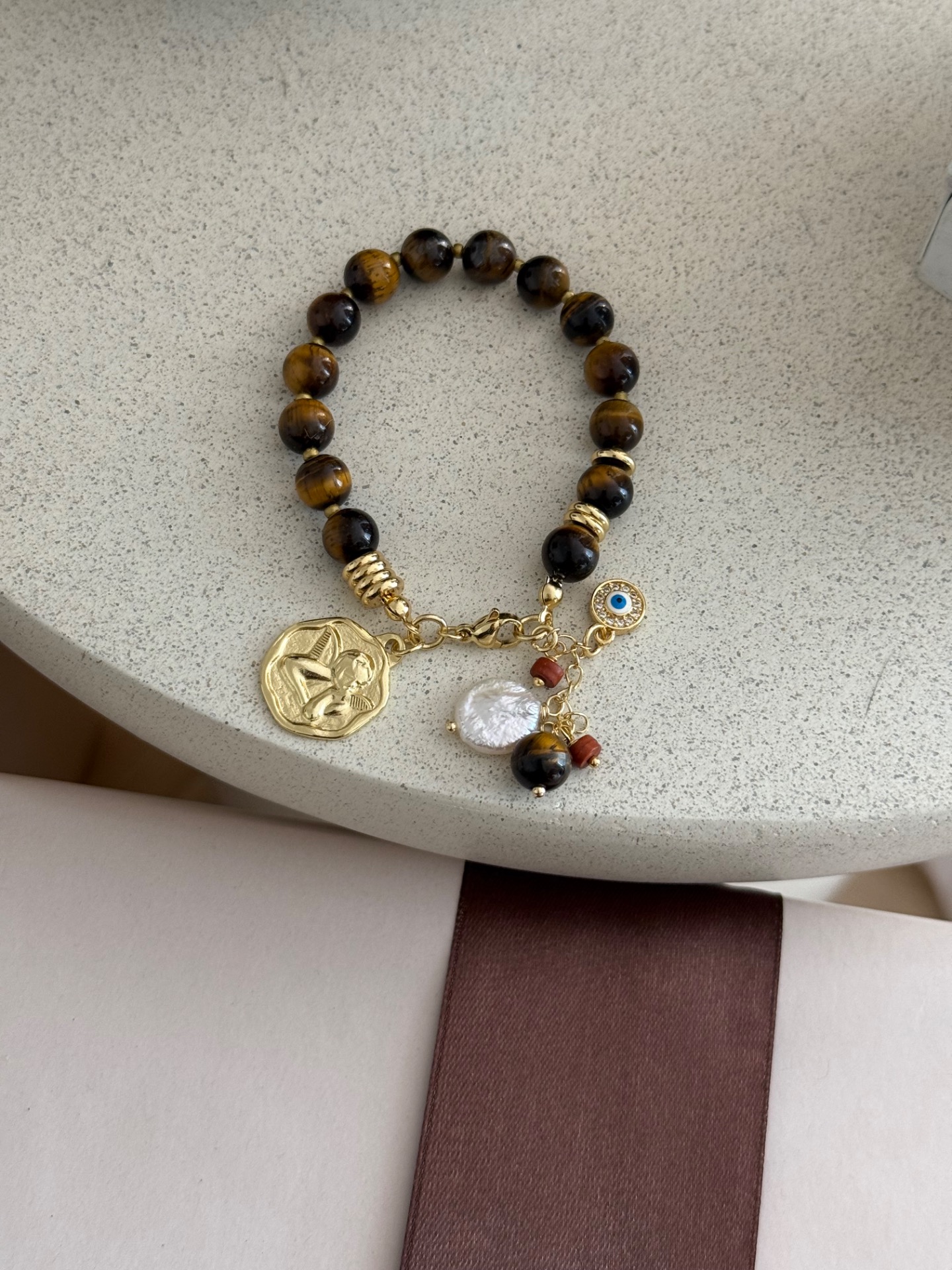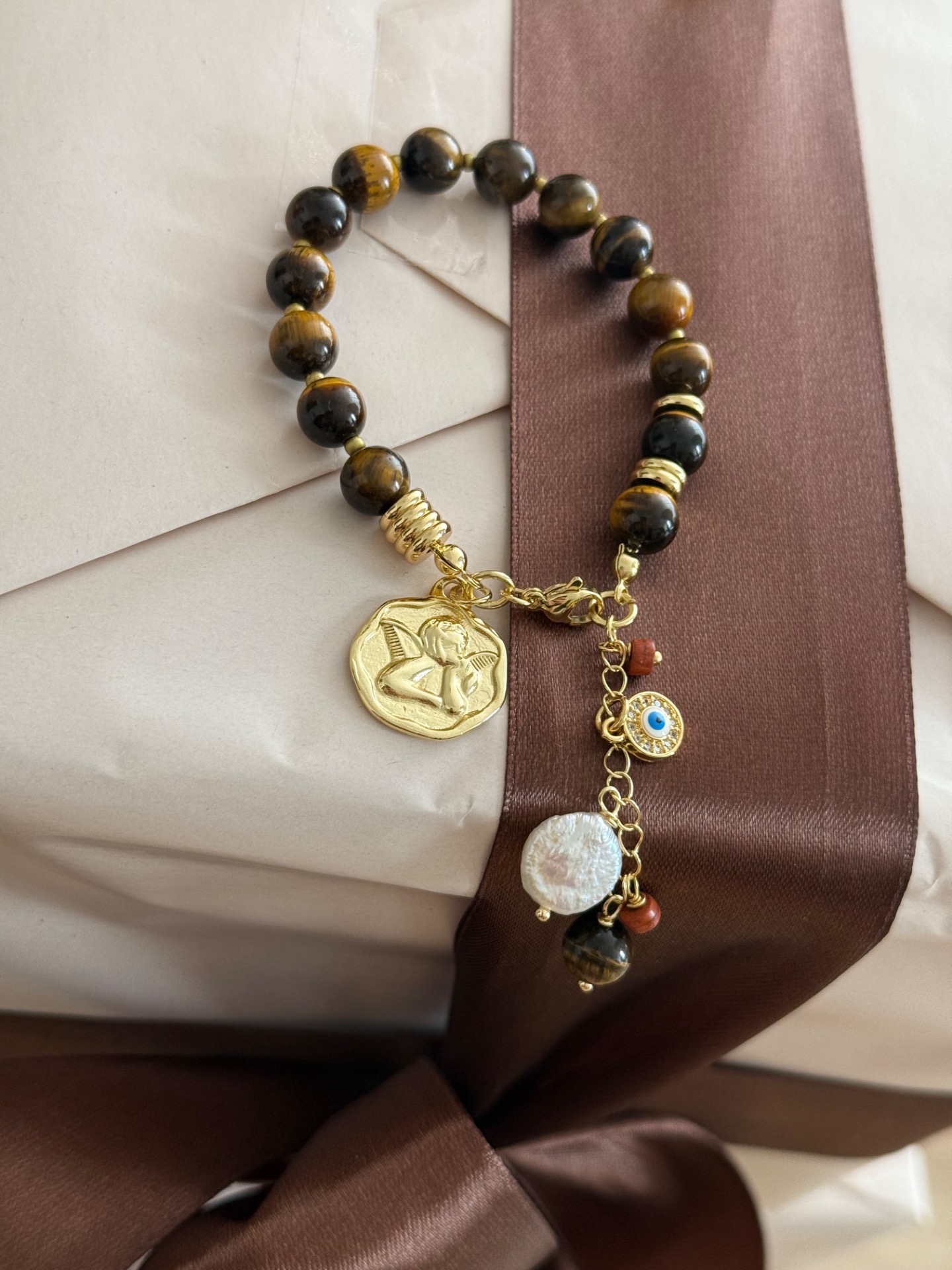 Náramok Anjelská ochrana je vytvorený ako osobný talizman svetla – pre chvíle, keď potrebuješ cítiť vedenie, ochranu a vnútorný pokoj. Ručne vyrobený z tigrieho oka, ozdobený pozláteným anjelom, prírodnou perlou a symbolom ochrany pred negatívnou energiou, nesie v sebe spojenie s duchovným svetom aj silu zeme, ktorá ťa drží v prítomnosti.