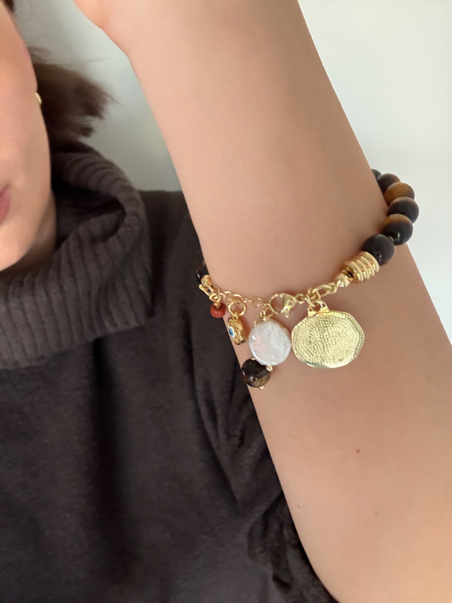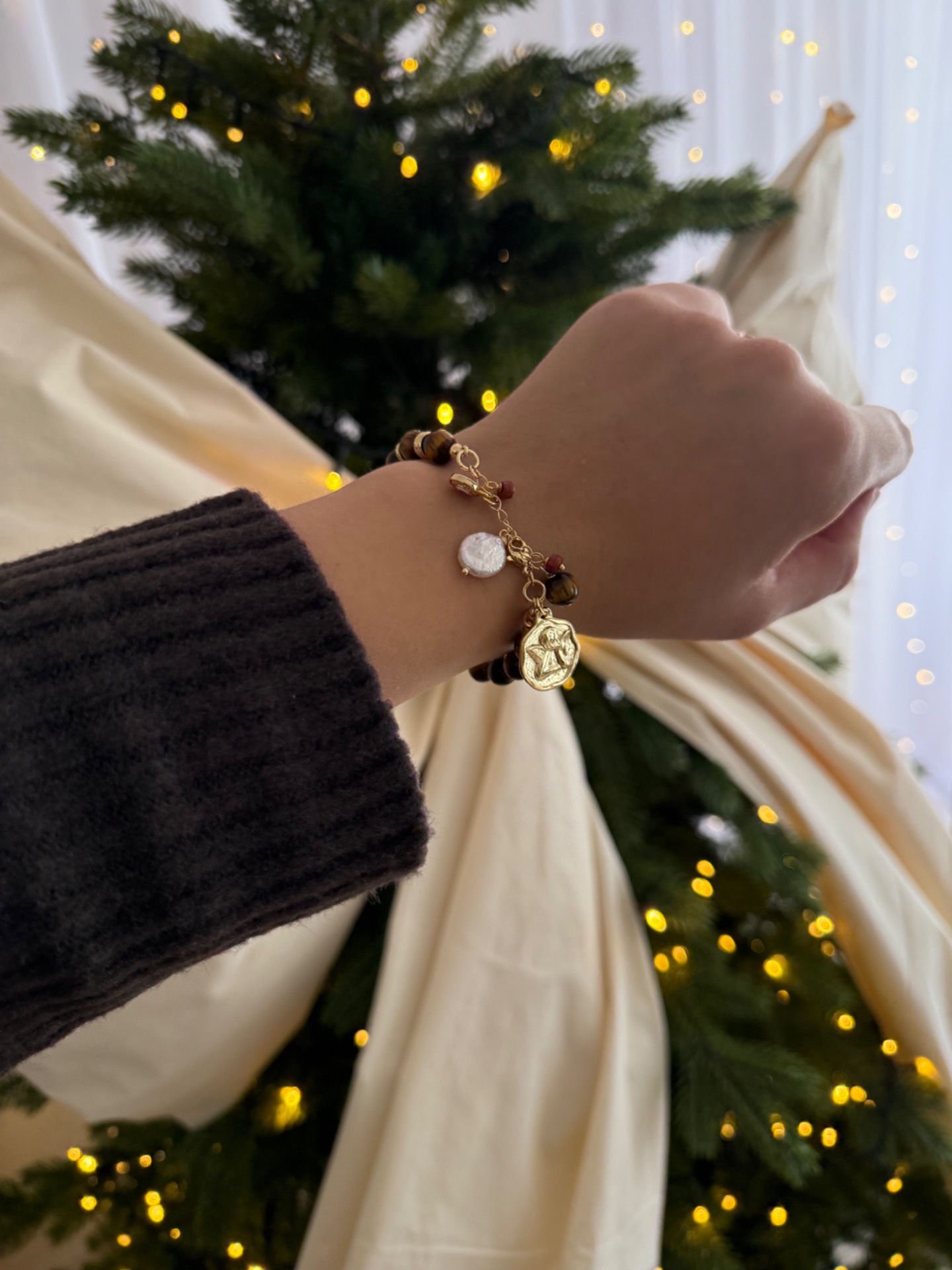 Náramok dopĺňajú drobné prírodné kamene – koral ako nositeľ radosti a životnej energie, a ochranný symbol "evil eye", ktorý bdie nad tebou a chráni tvoje svetlo.