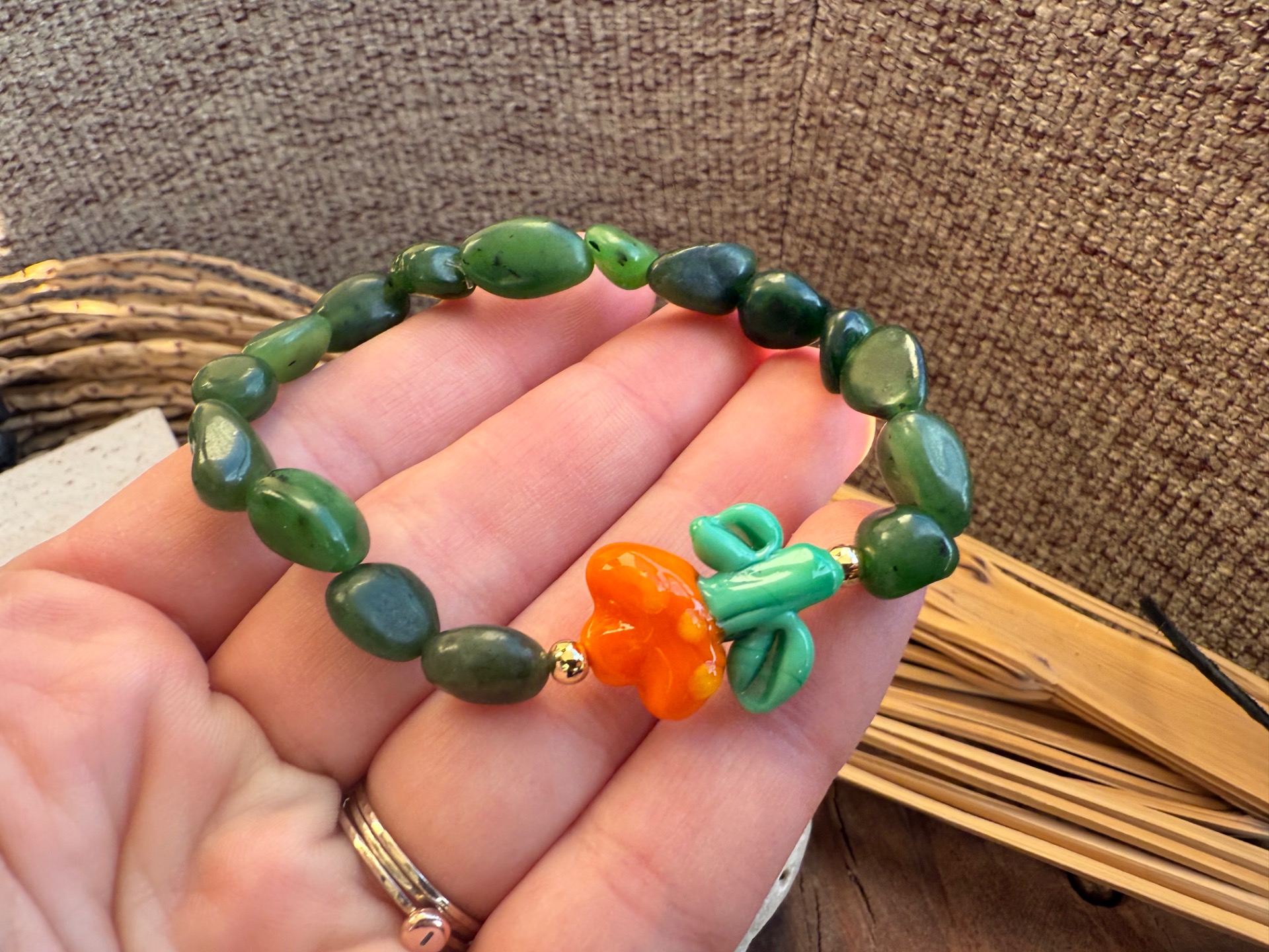 Jemný, no výrazný náramok z nepravidelných nugiet nefritu doplnený skleneným tulipánikom s oranžovými lupienkami. Spojenie prírodného kameňa a hravého detailu vytvára šperk, ktorý v sebe nesie ľahkosť, sviežosť a radosť zo života.