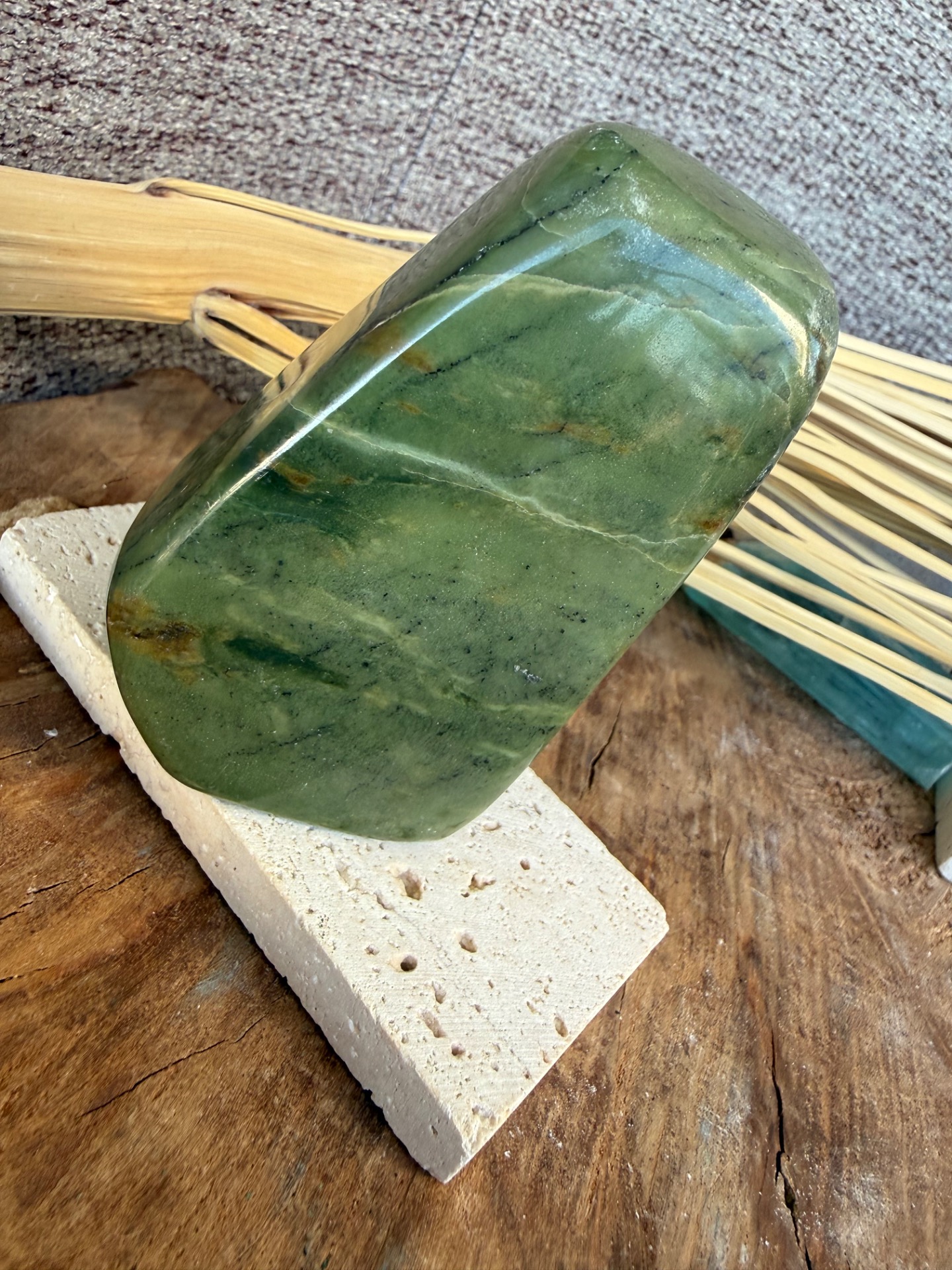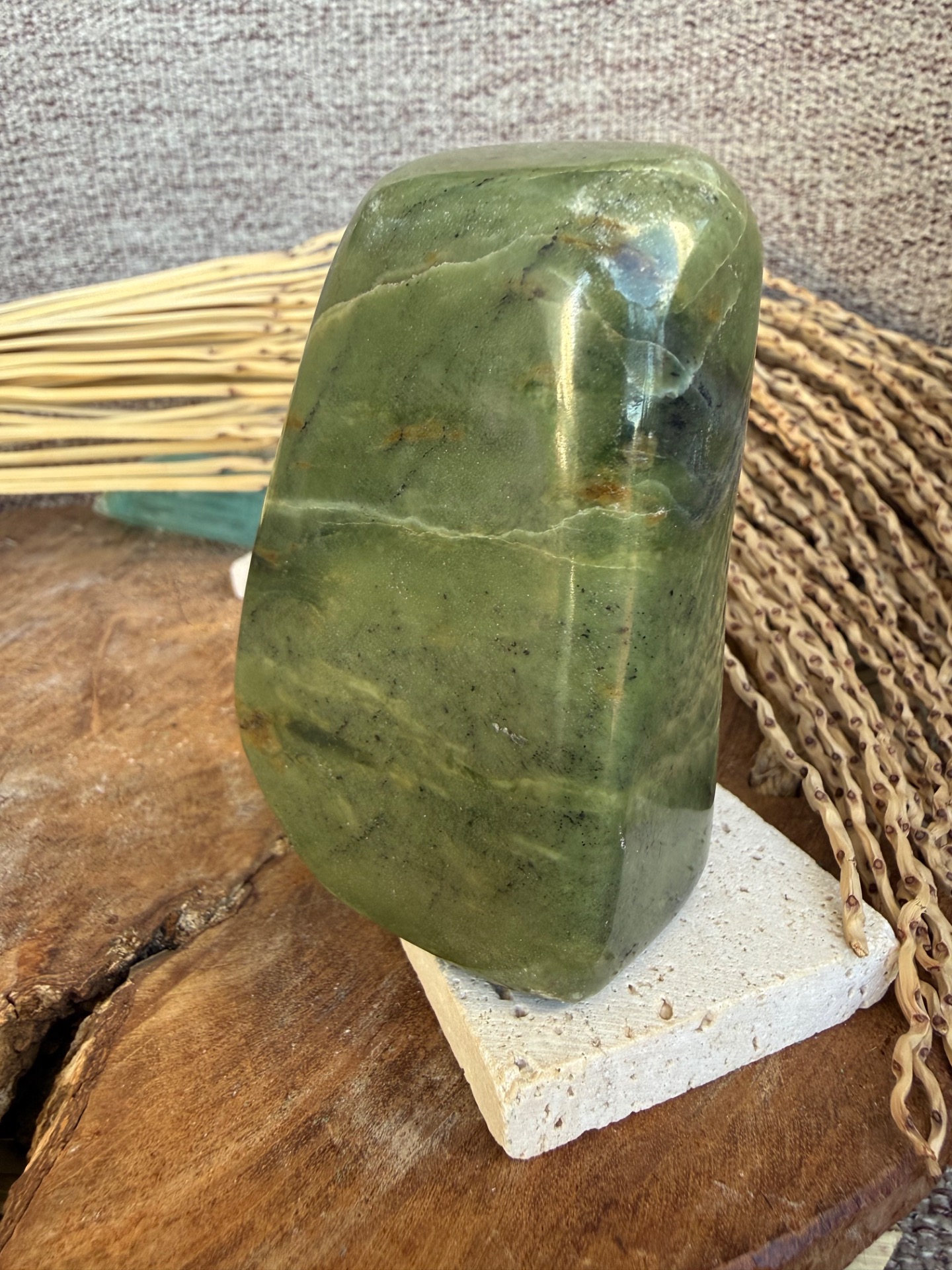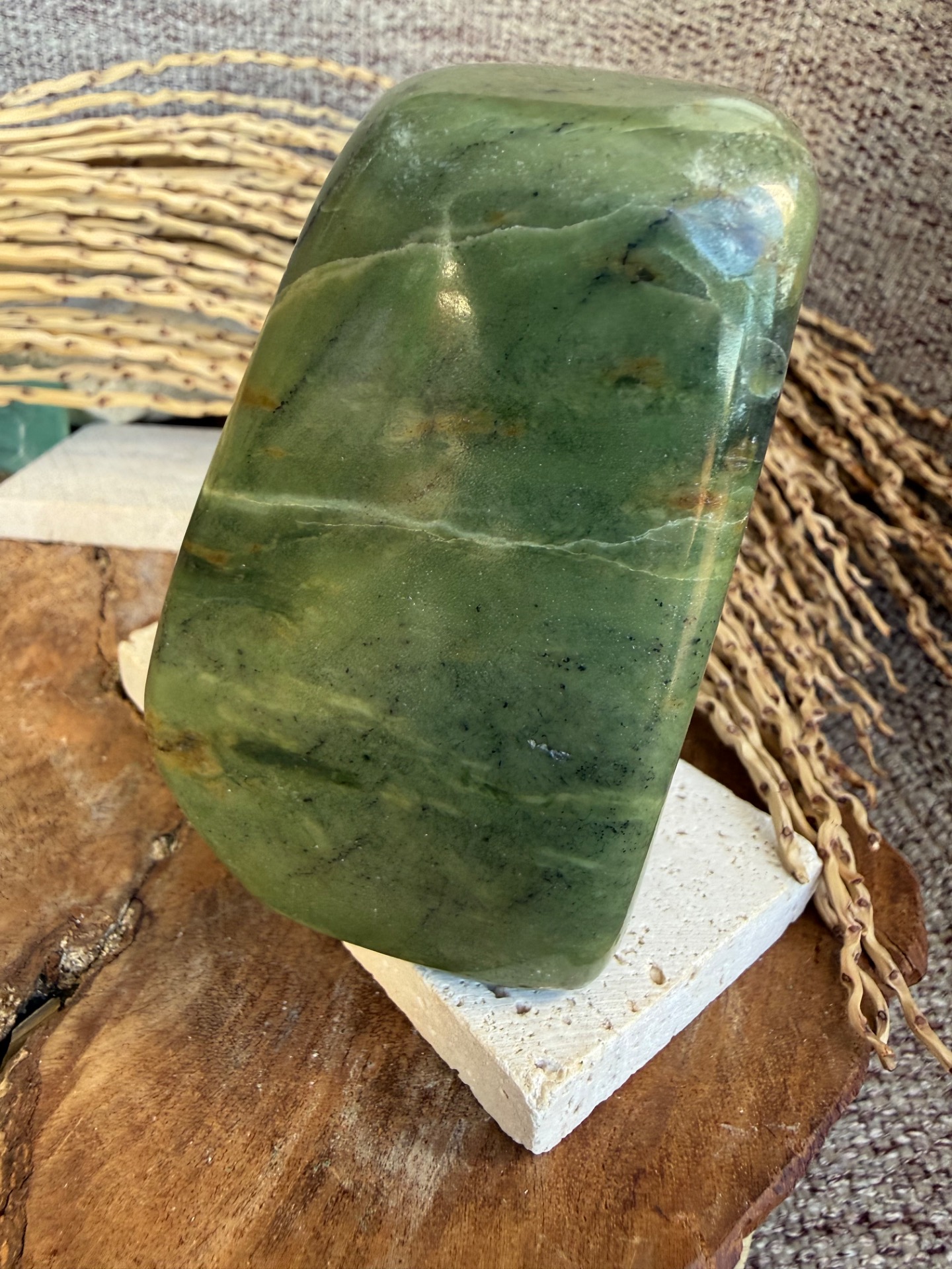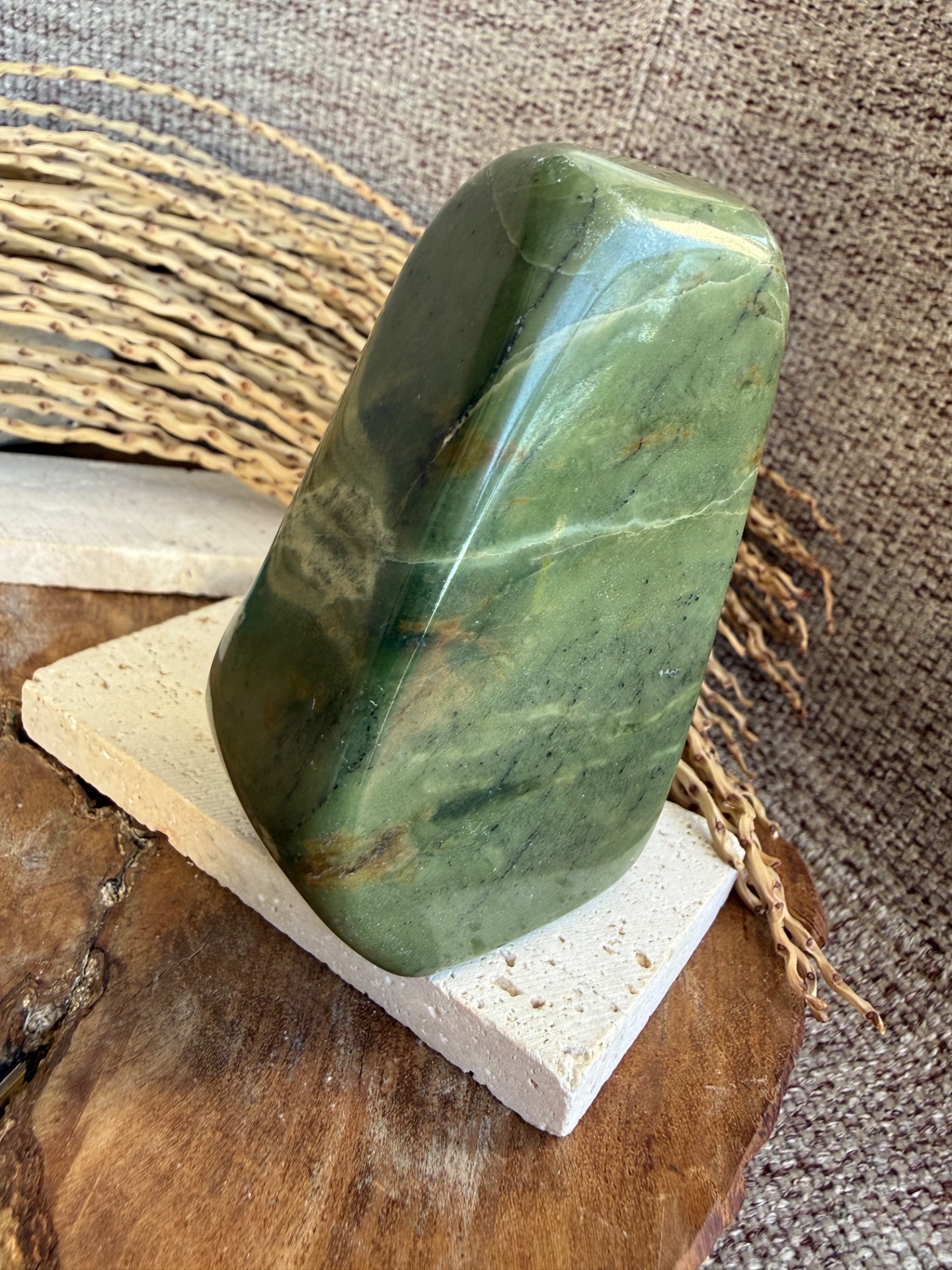 Tento nádherný nefrit (jade) v prirodzenej free form podobe je voľne stojaci a pôsobí ako jemný, no zároveň veľmi stabilizačný energetický kameň. Jeho hladká štruktúra a prírodná estetika z neho robia krásny solitér aj praktický meditačný nástroj.