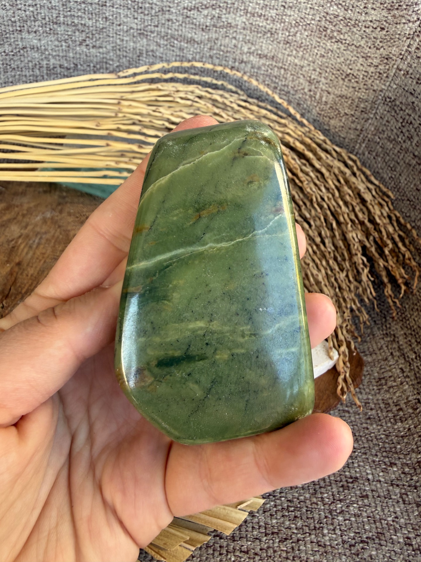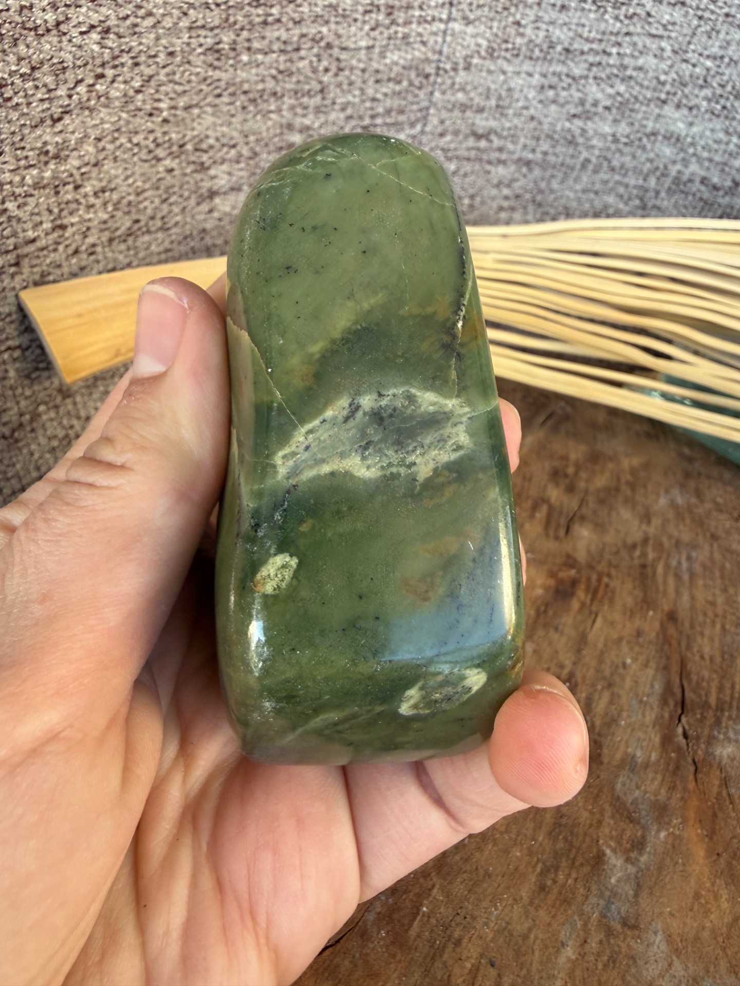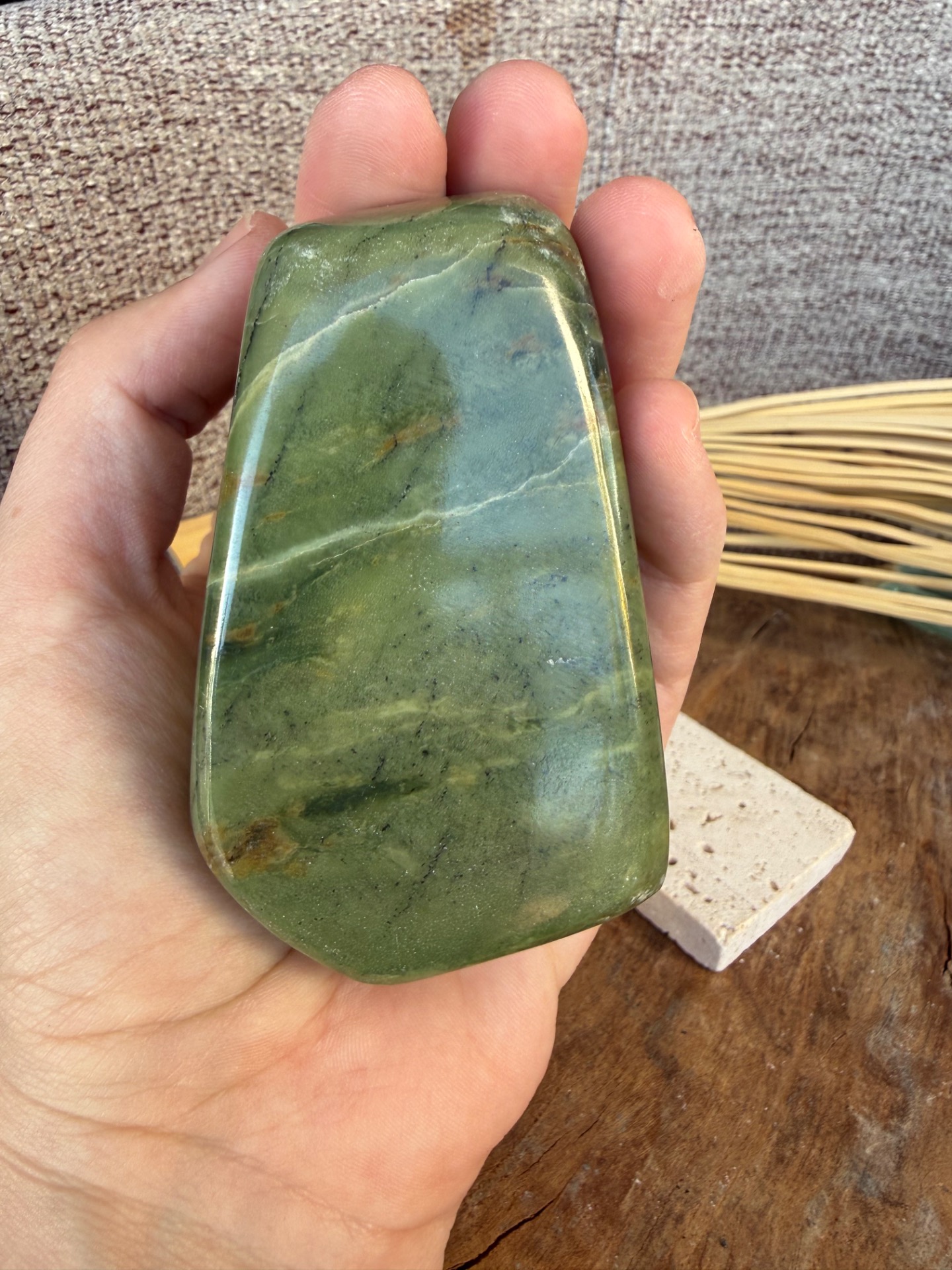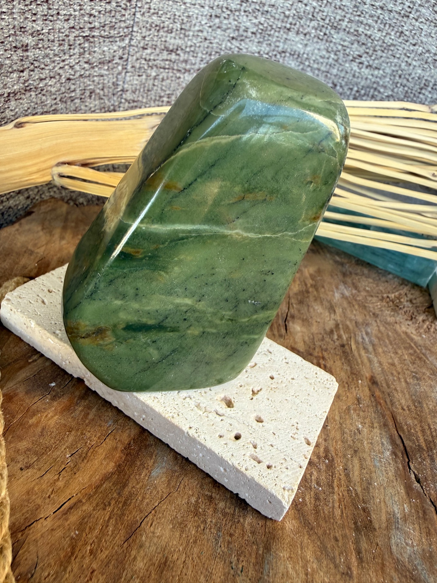 Tento nádherný nefrit (jade) v prirodzenej free form podobe je voľne stojaci a pôsobí ako jemný, no zároveň veľmi stabilizačný energetický kameň. Jeho hladká štruktúra a prírodná estetika z neho robia krásny solitér aj praktický meditačný nástroj.