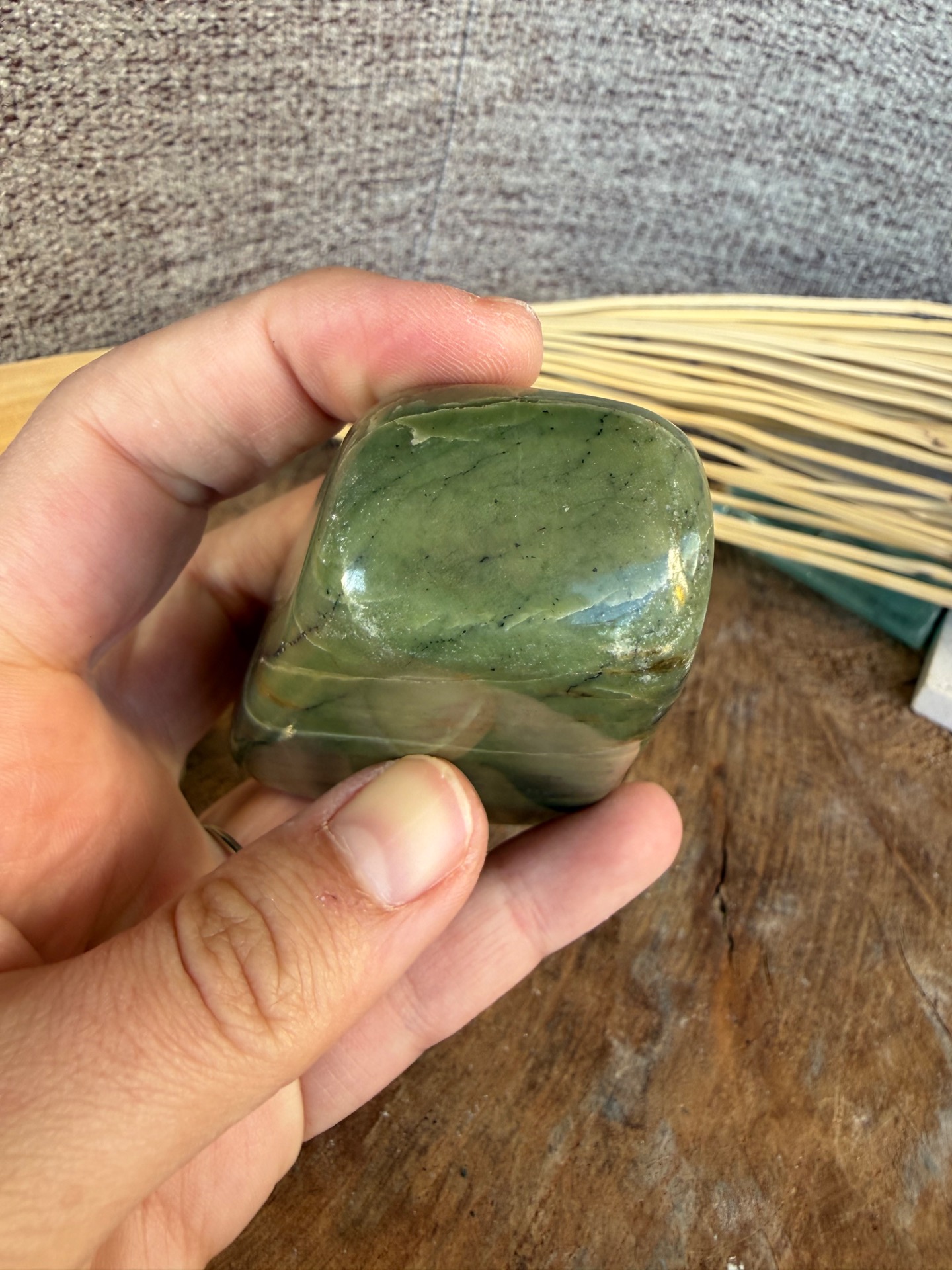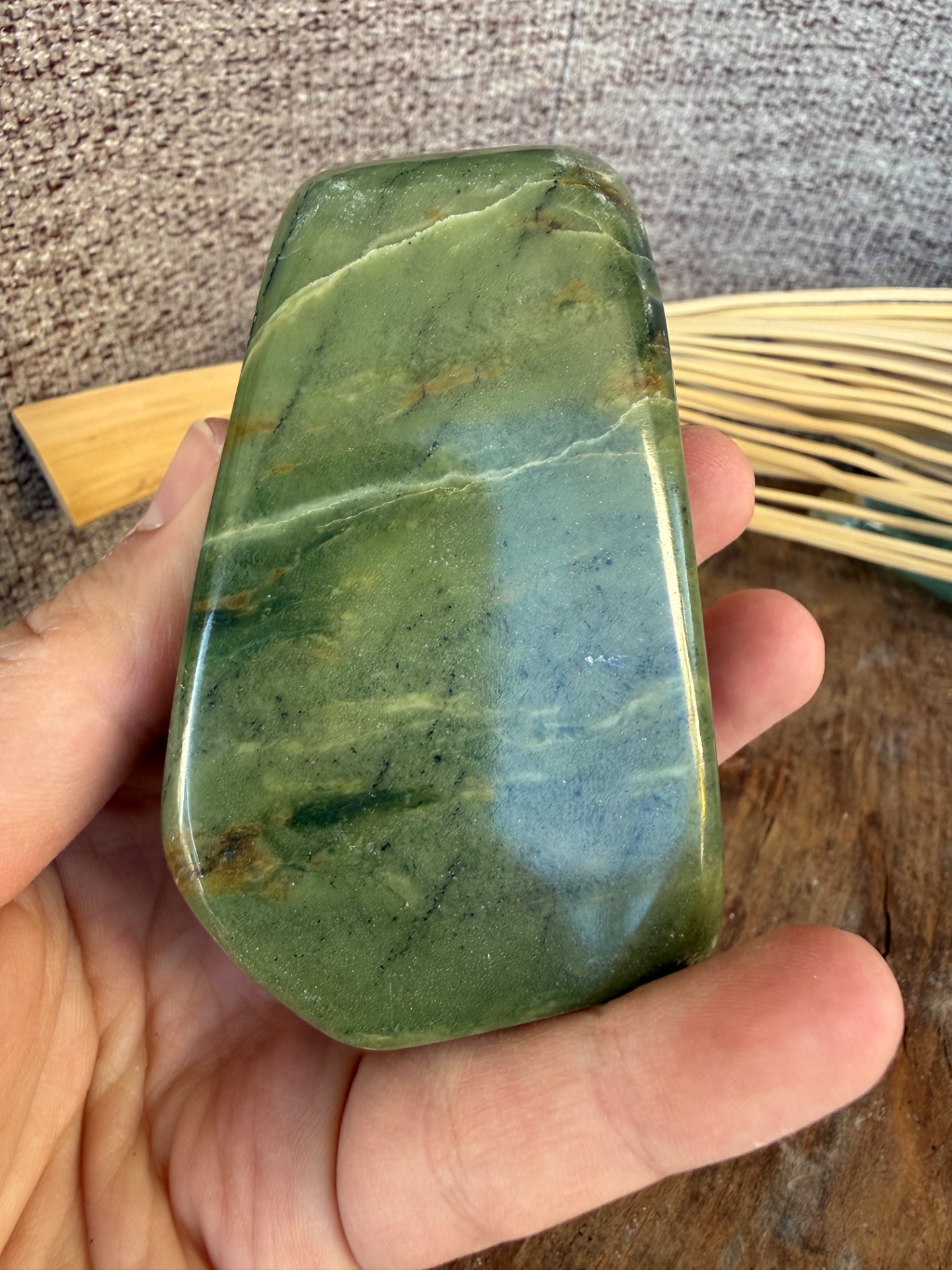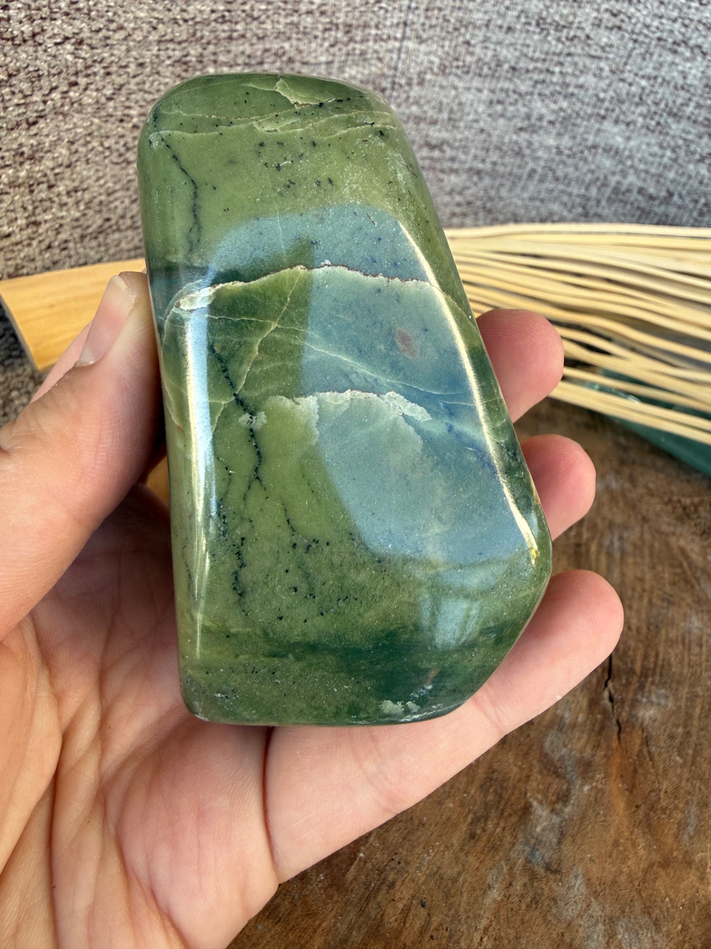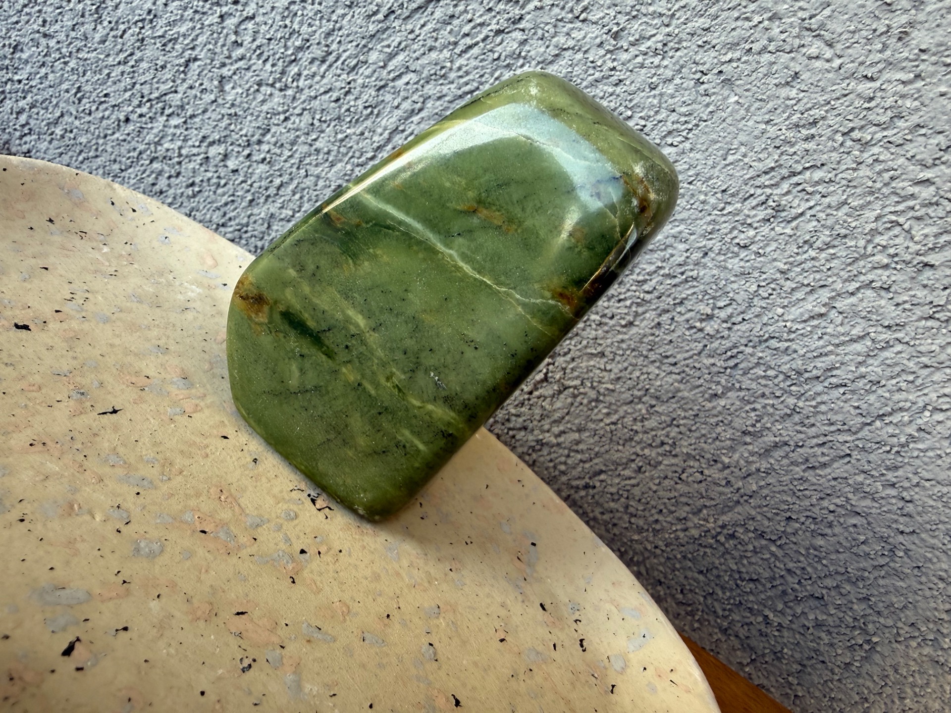 Tento nádherný nefrit (jade) v prirodzenej free form podobe je voľne stojaci a pôsobí ako jemný, no zároveň veľmi stabilizačný energetický kameň. Jeho hladká štruktúra a prírodná estetika z neho robia krásny solitér aj praktický meditačný nástroj.