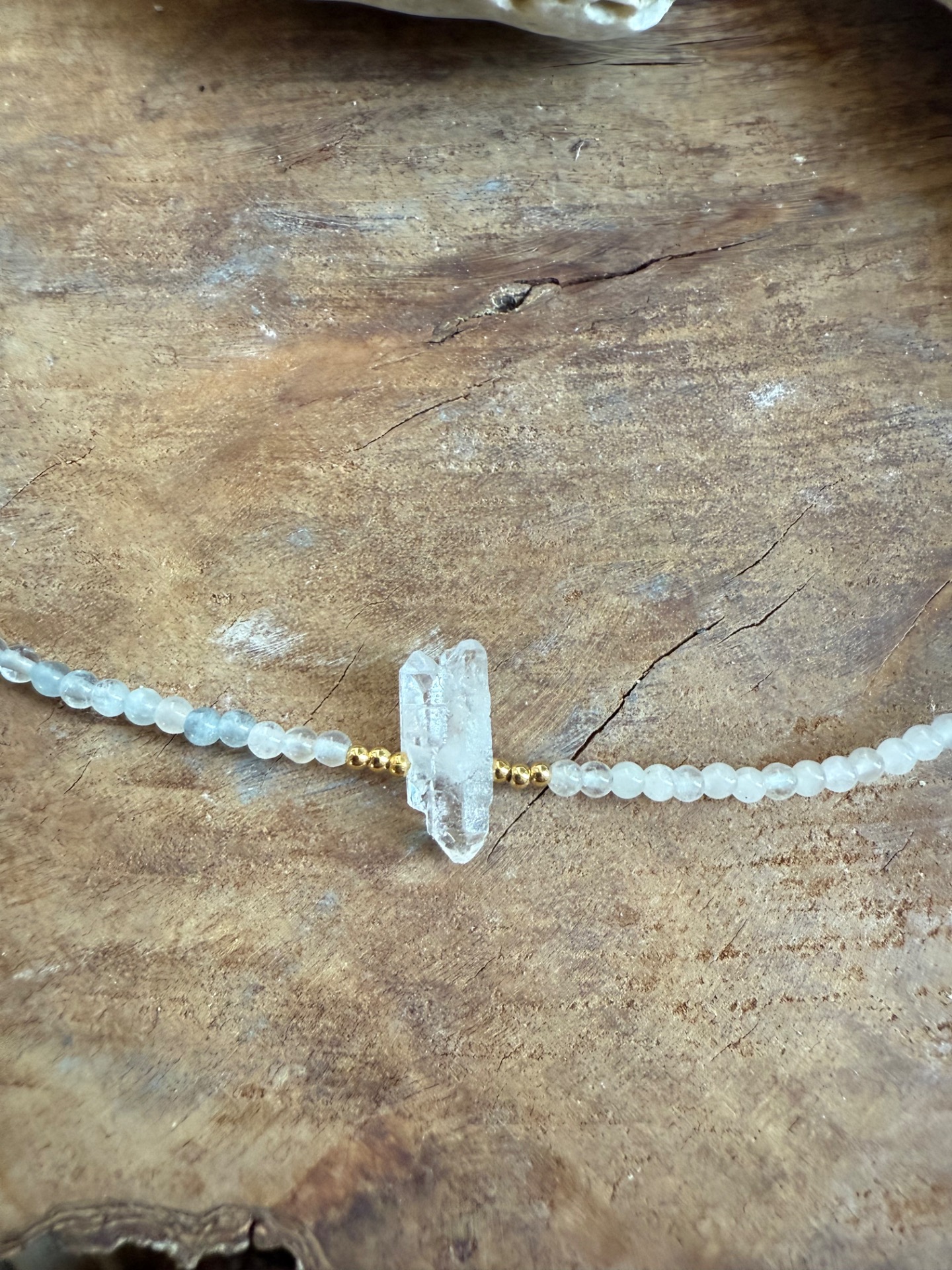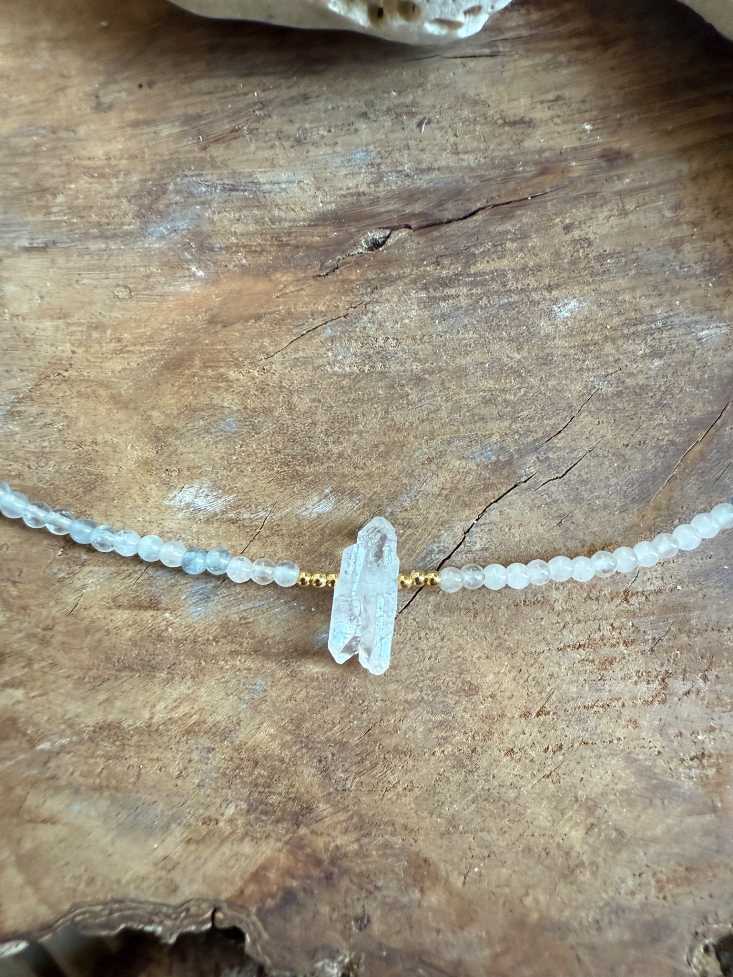 V strede náhrdelníka sa nachádza surový horský krištáľ, obojstranne vsadený ako svetelný stred.