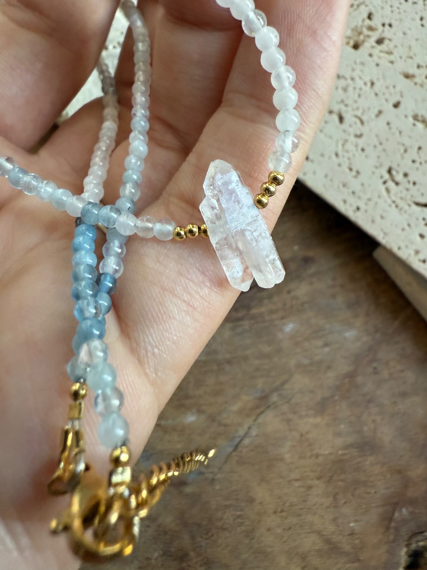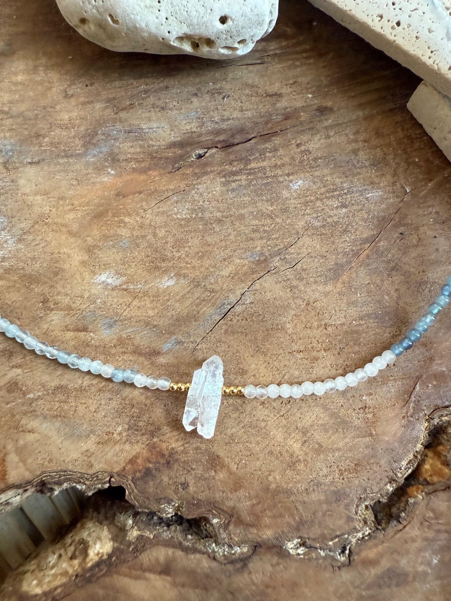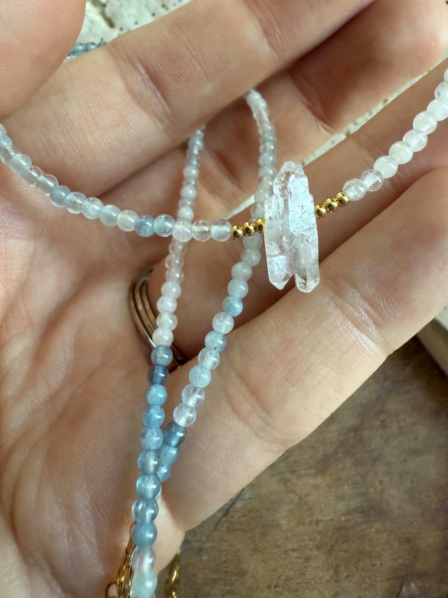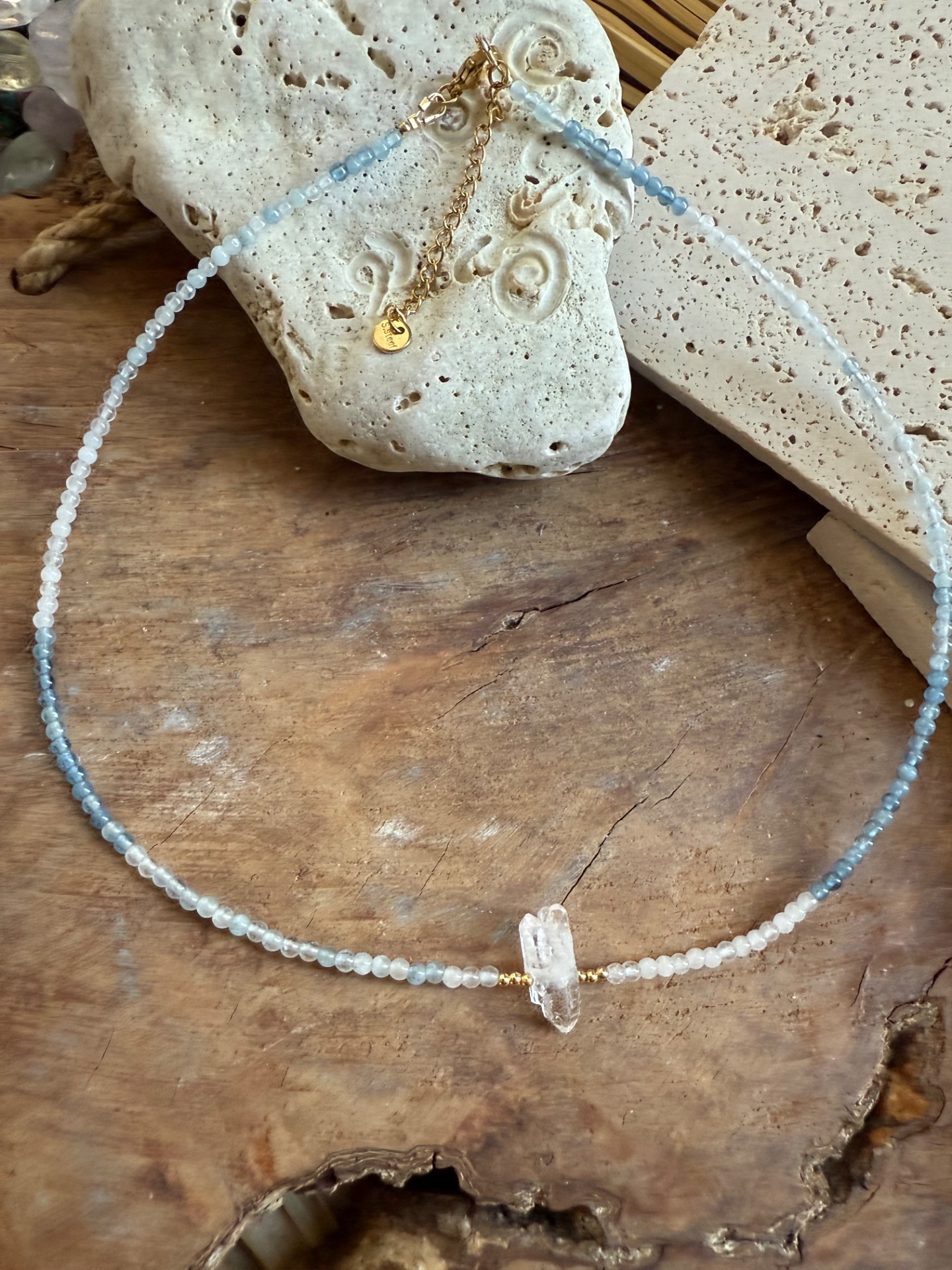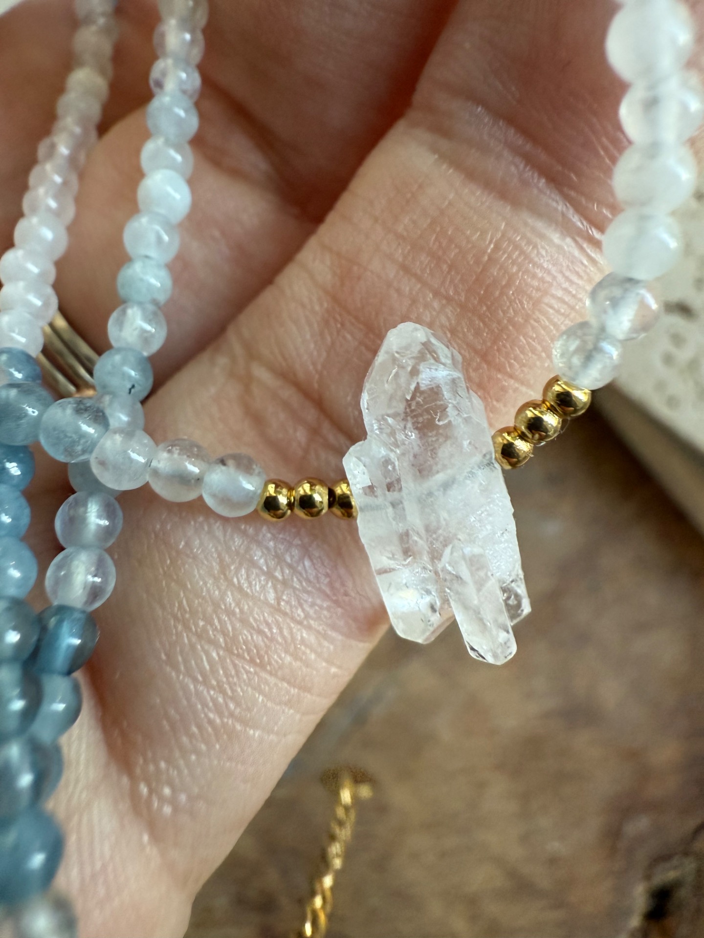 Tento náhrdelník z pravého akvamarínu (3 mm) a surového krištáľu je vytvorený ako jemná ochrana pre dušu, ktorá túži po harmónii, porozumení a spojení.