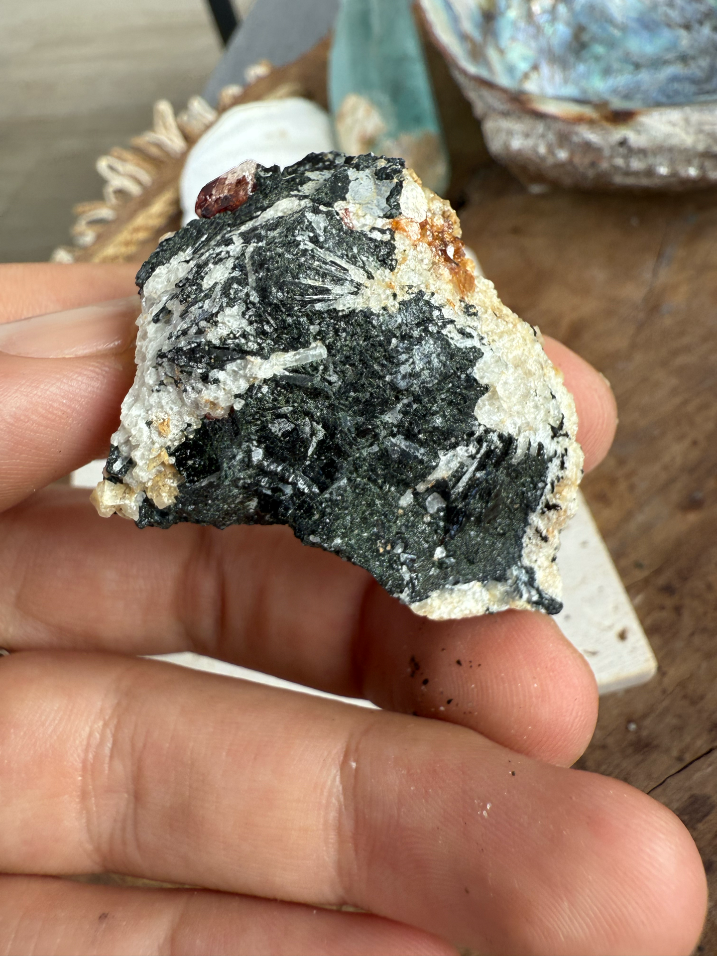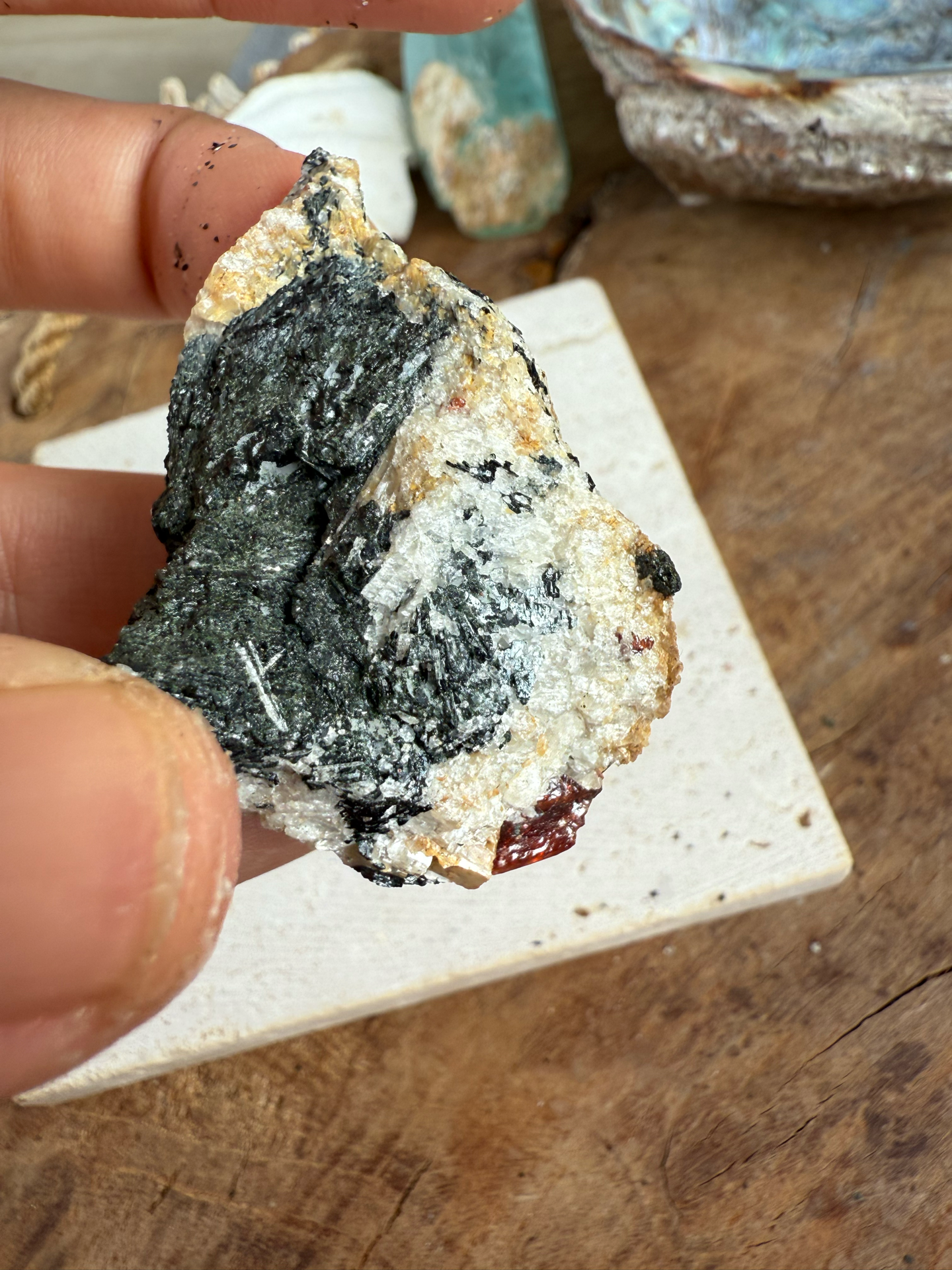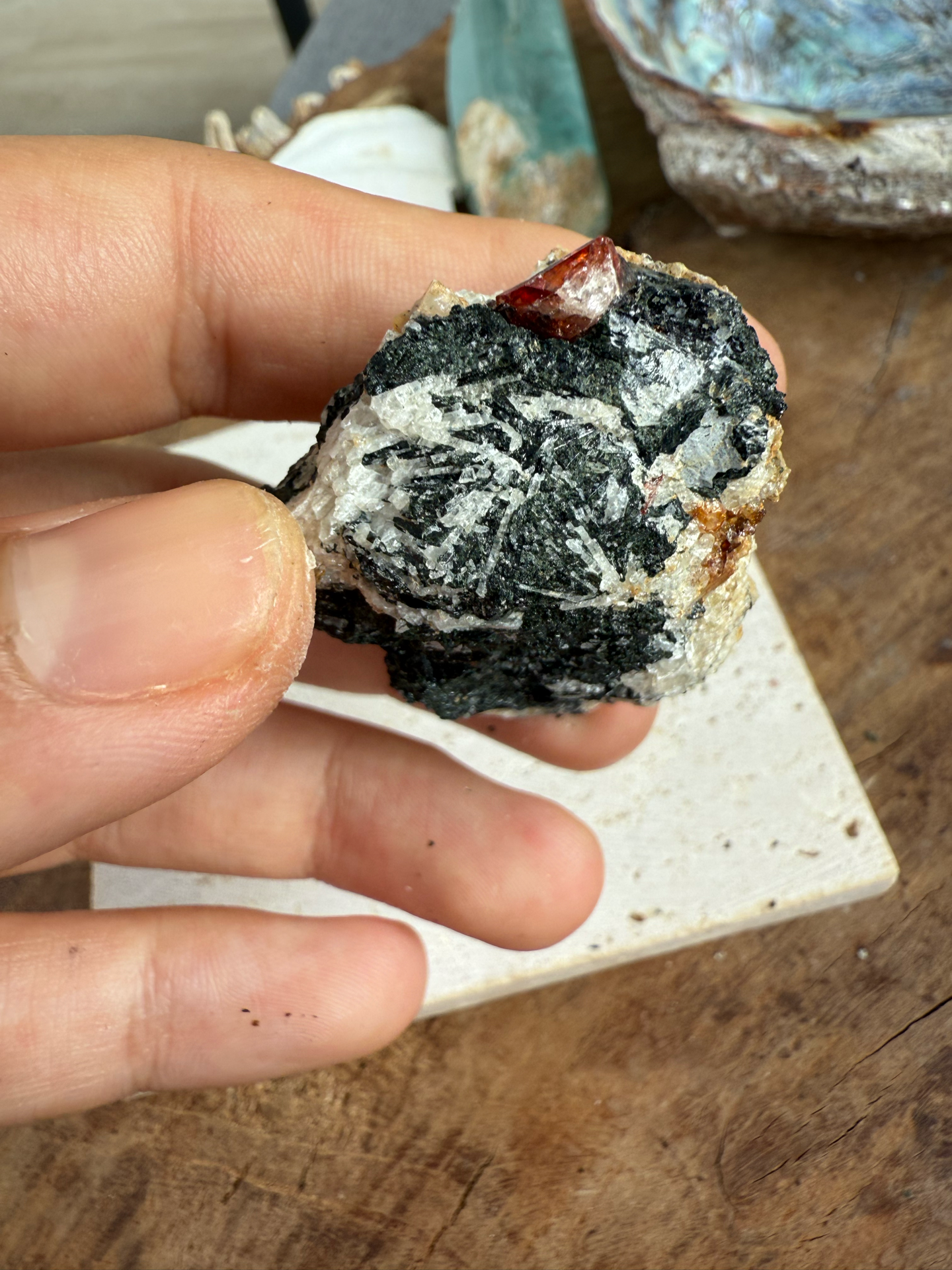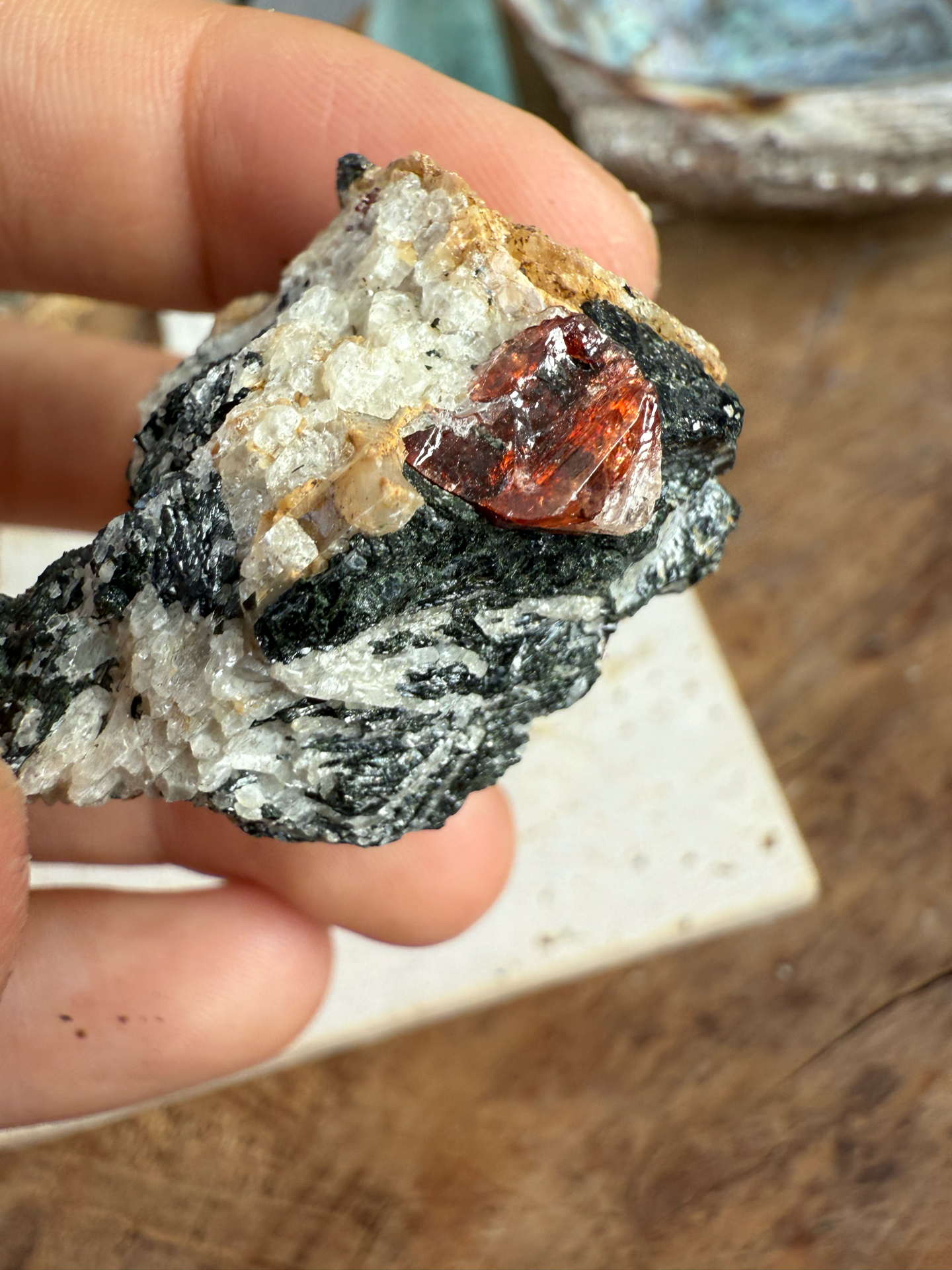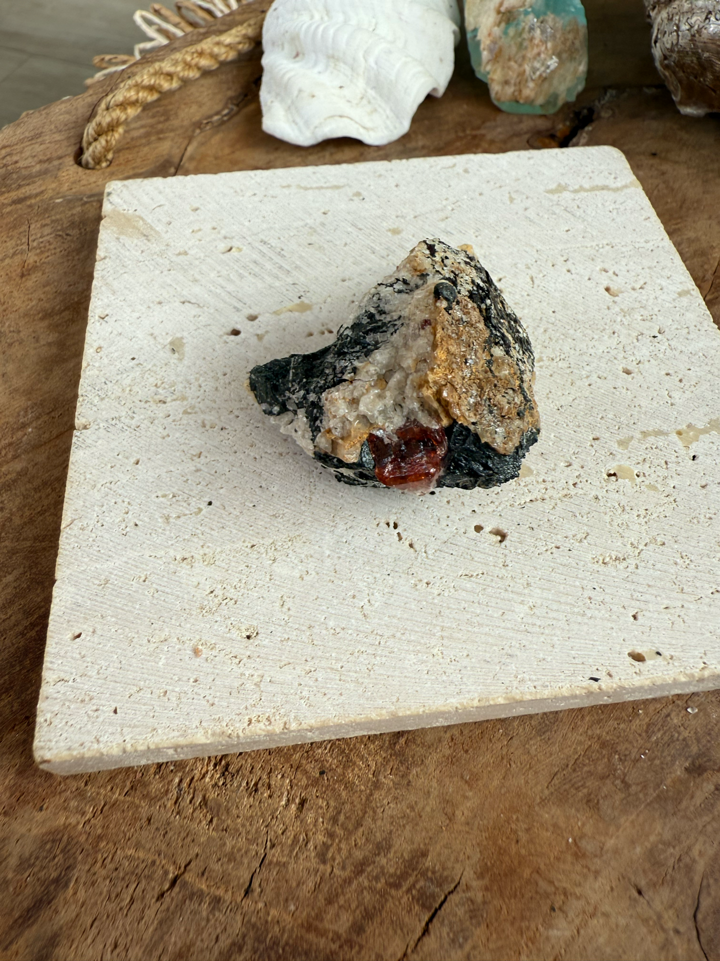 Jeho sýte červeno-krvavé odtiene žiaria v kontraste s horninou, z ktorej sa zrodil. Tento minerál v matrici pôsobí mimoriadne surovo, silno a pravdivo – ako by v sebe niesol samotný dych Zeme.