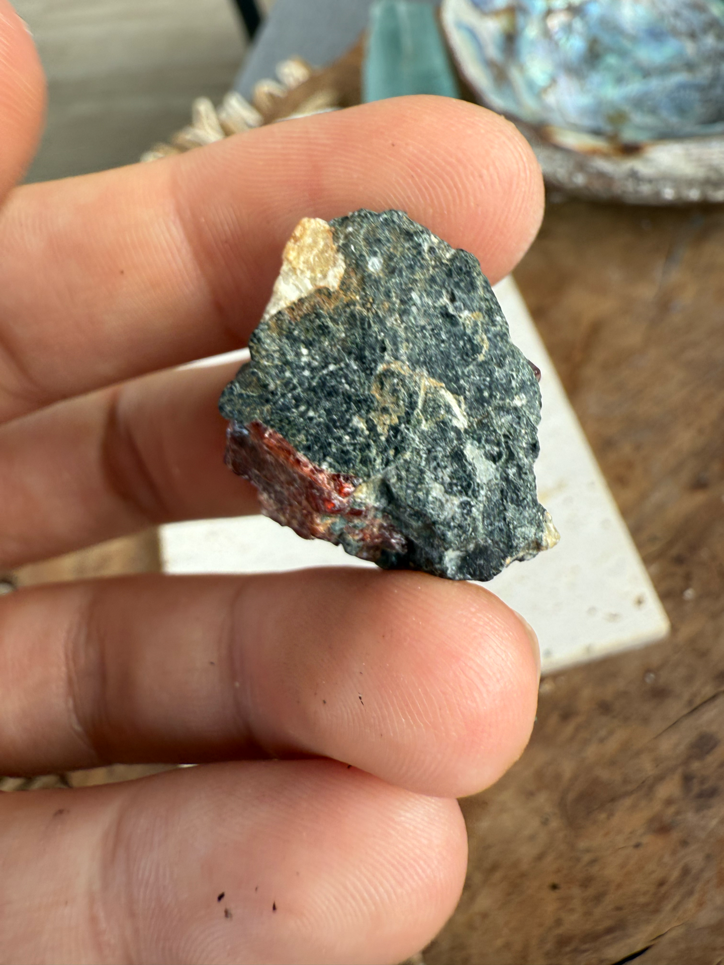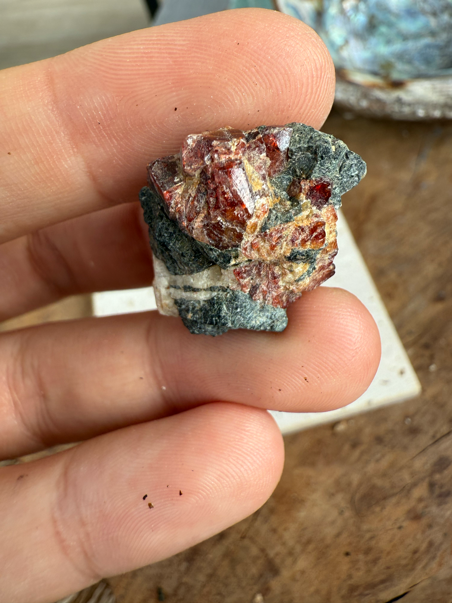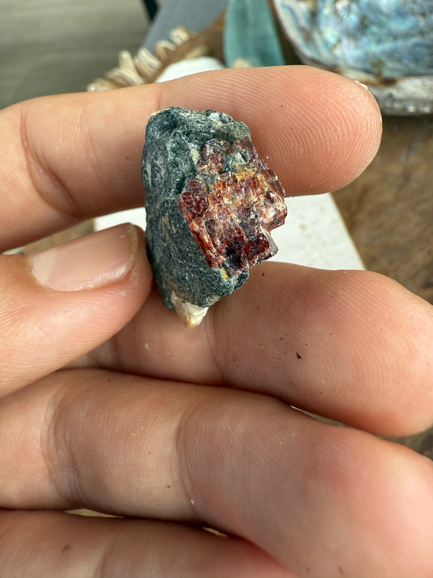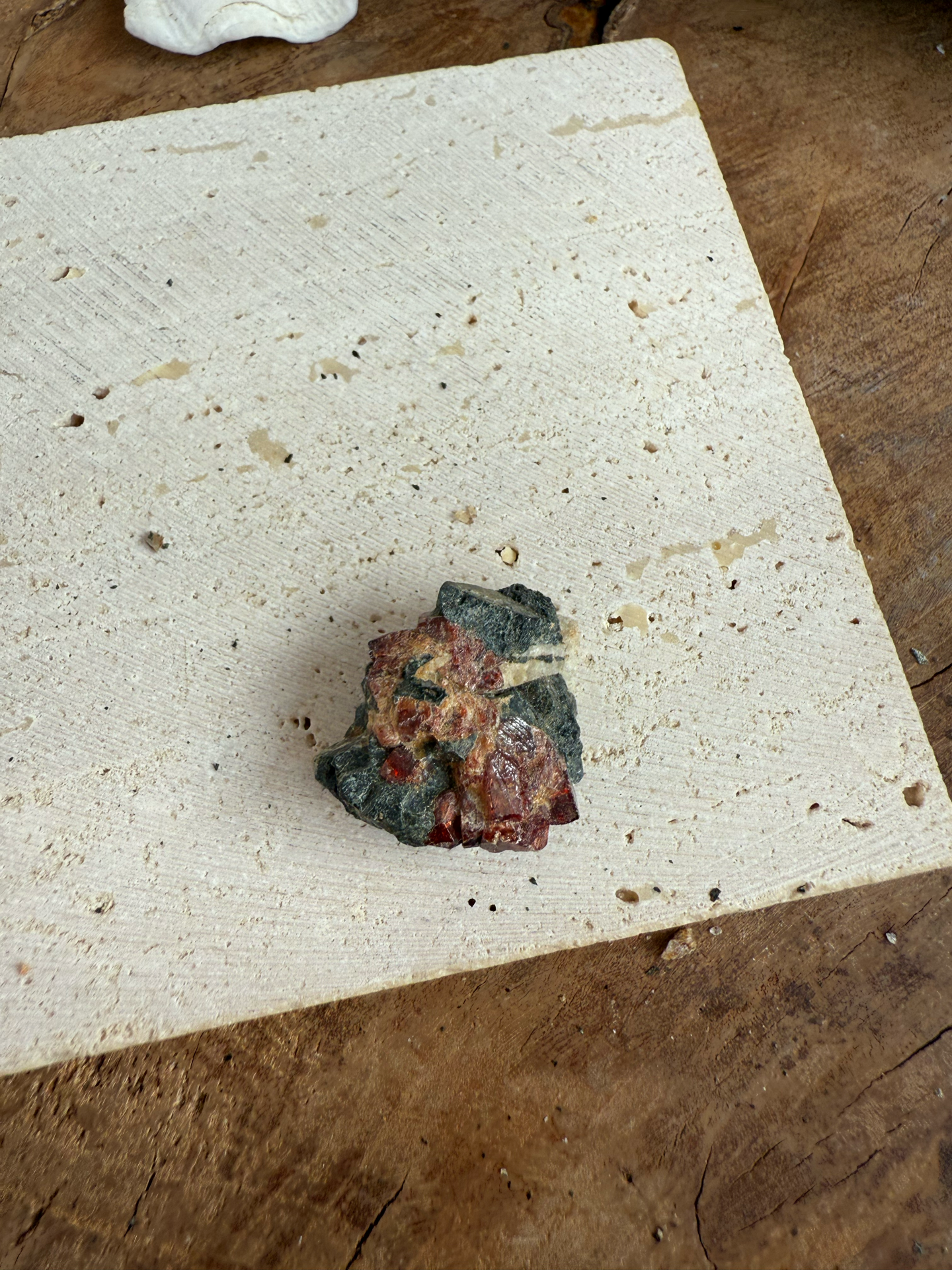 Jeho sýte červeno-krvavé odtiene žiaria v kontraste s horninou, z ktorej sa zrodil. Tento minerál v matrici pôsobí mimoriadne surovo, silno a pravdivo – ako by v sebe niesol samotný dych Zeme.