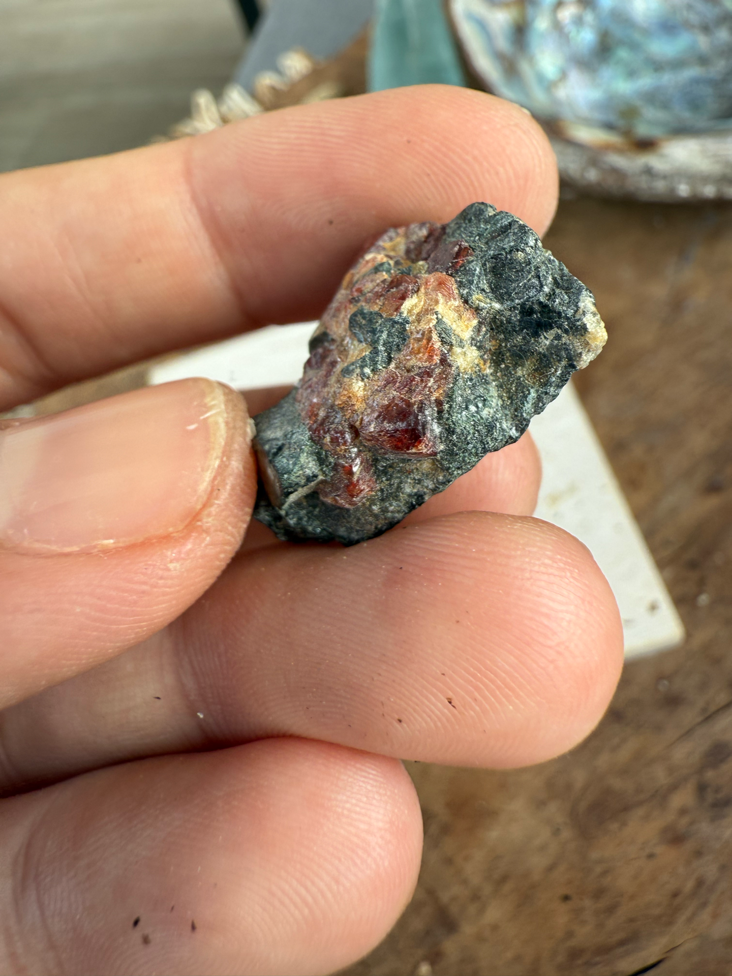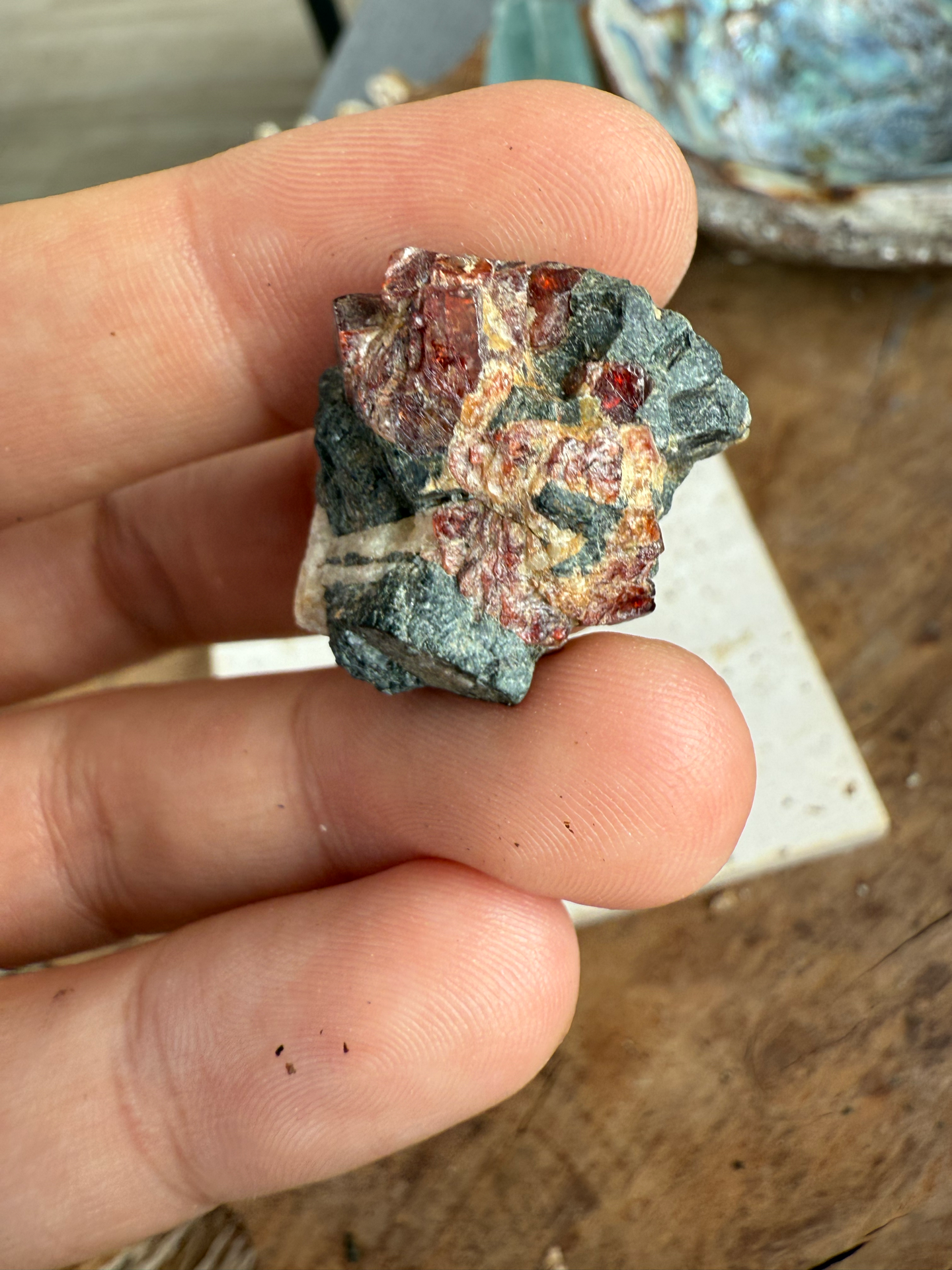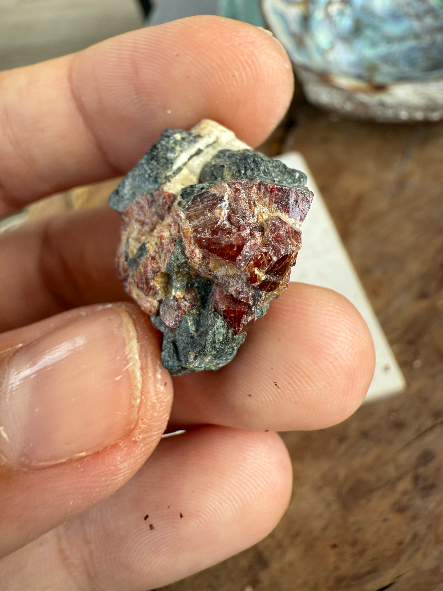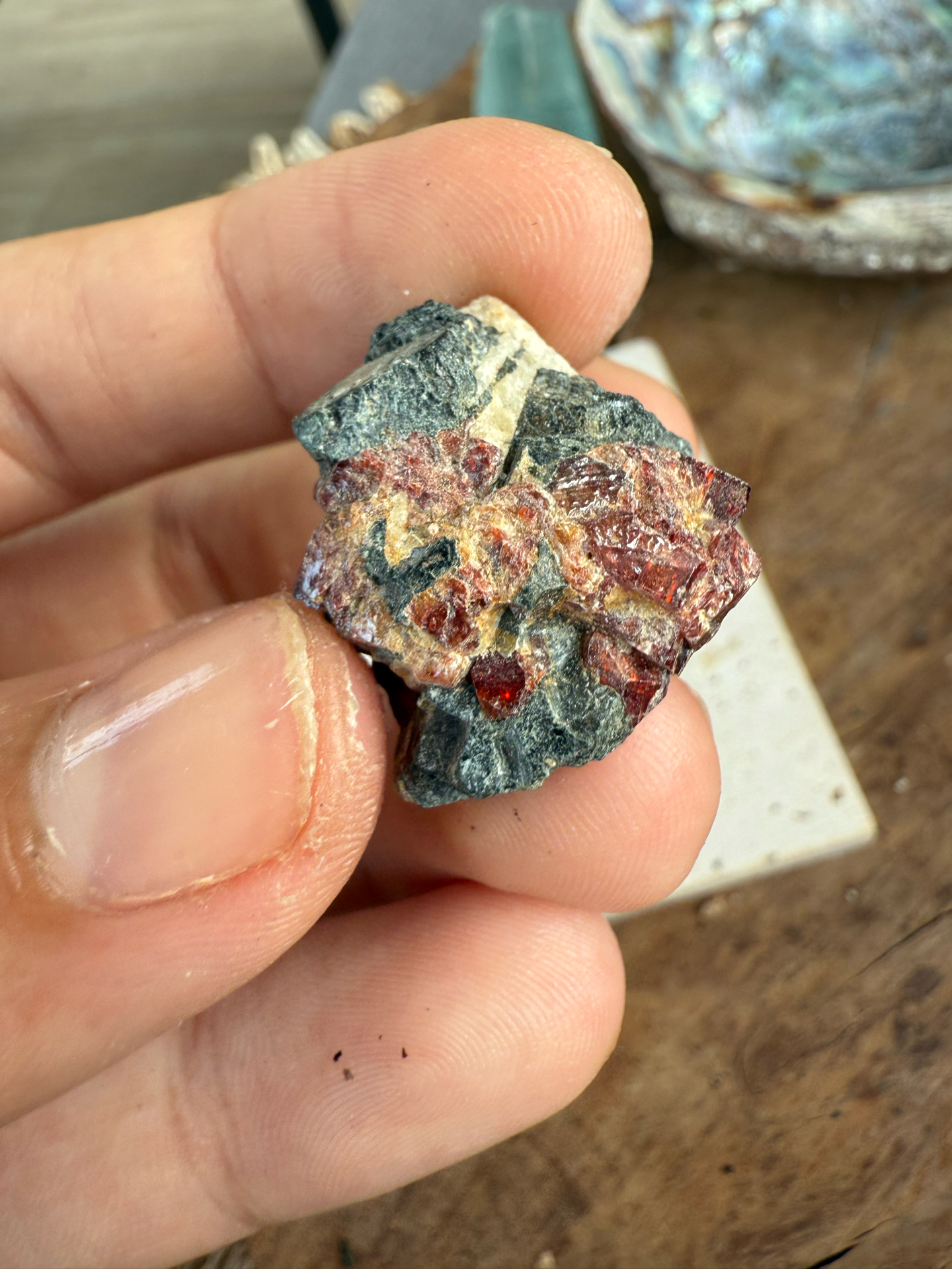 Jeho sýte červeno-krvavé odtiene žiaria v kontraste s horninou, z ktorej sa zrodil. Tento minerál v matrici pôsobí mimoriadne surovo, silno a pravdivo – ako by v sebe niesol samotný dych Zeme.