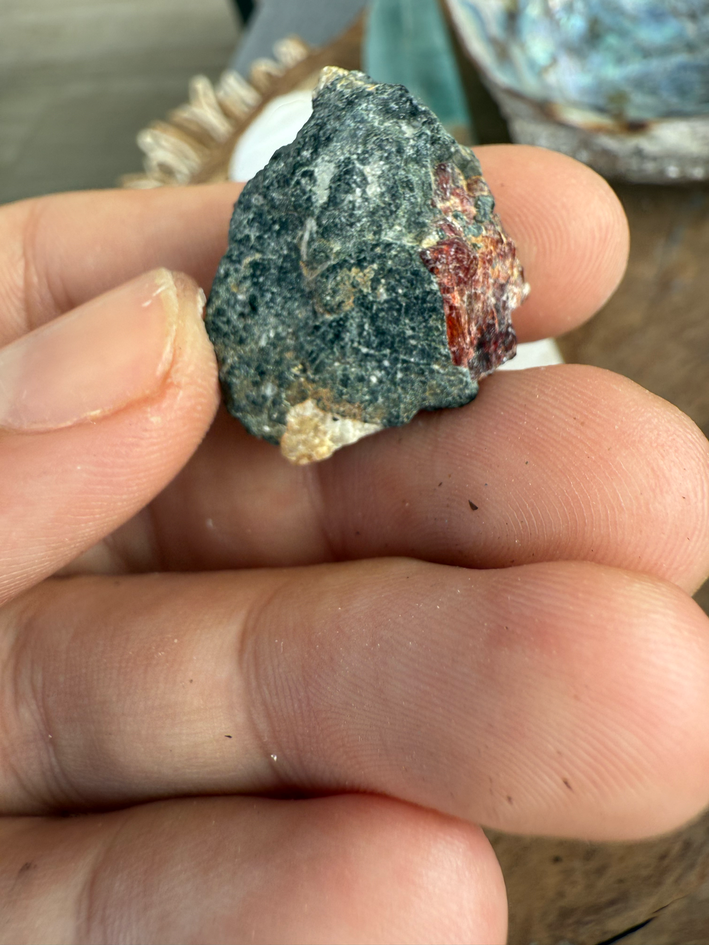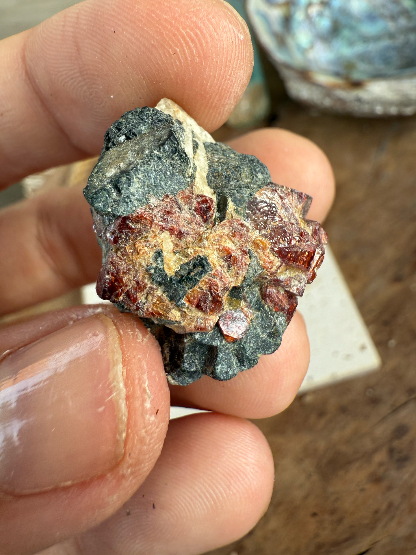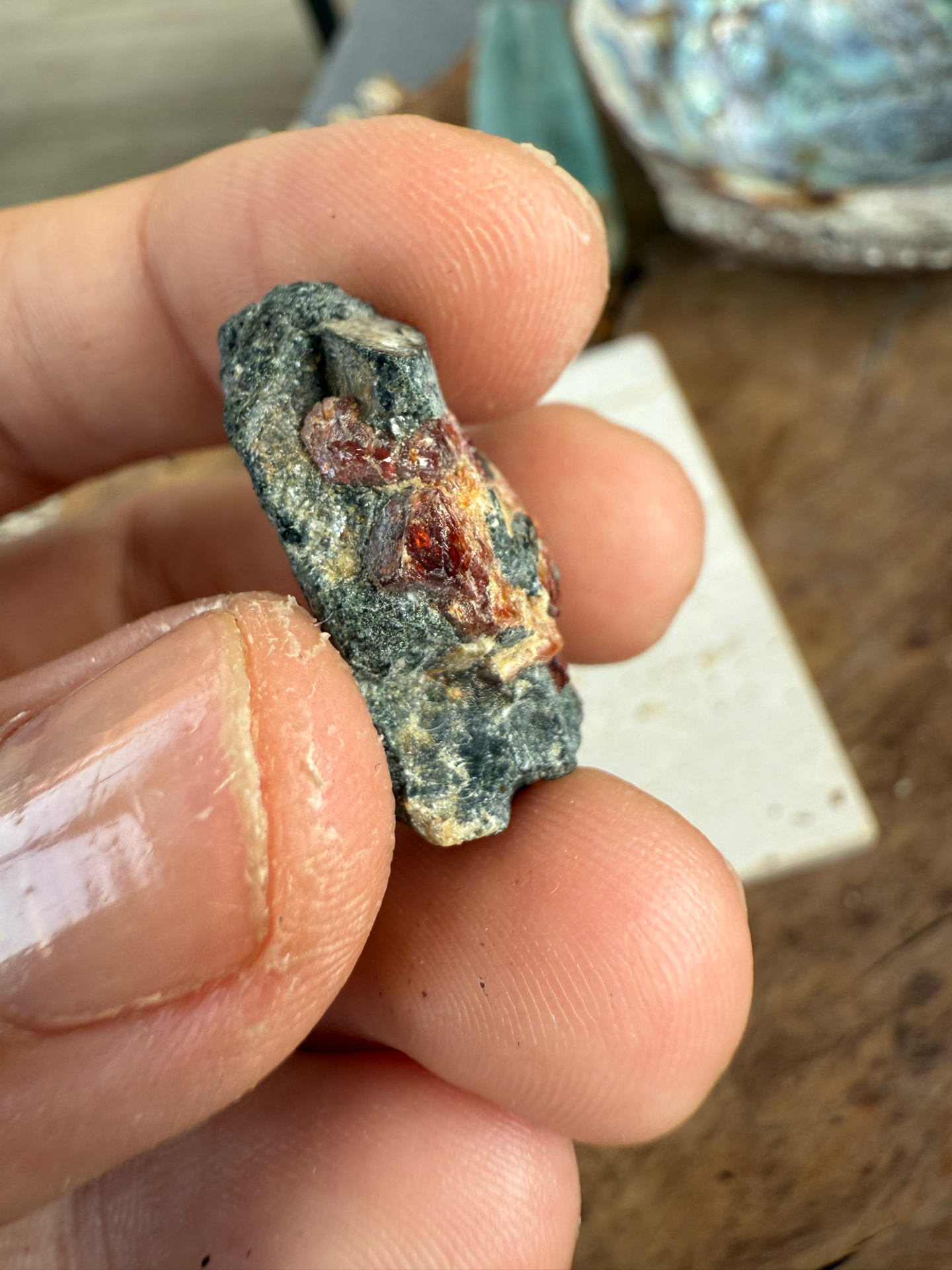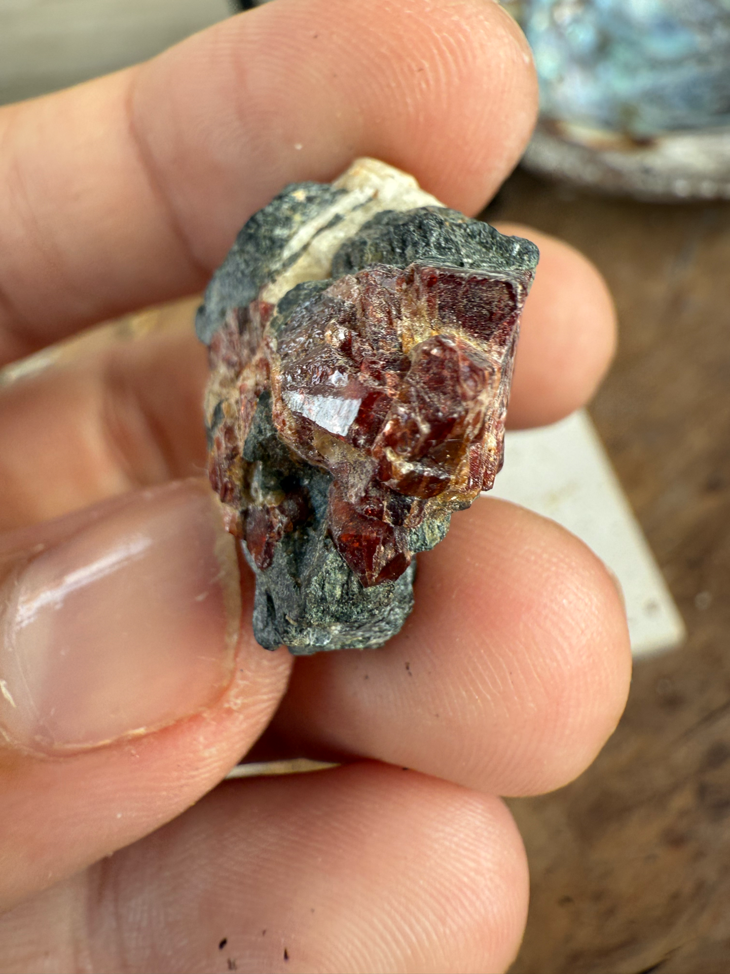 Jeho sýte červeno-krvavé odtiene žiaria v kontraste s horninou, z ktorej sa zrodil. Tento minerál v matrici pôsobí mimoriadne surovo, silno a pravdivo – ako by v sebe niesol samotný dych Zeme.