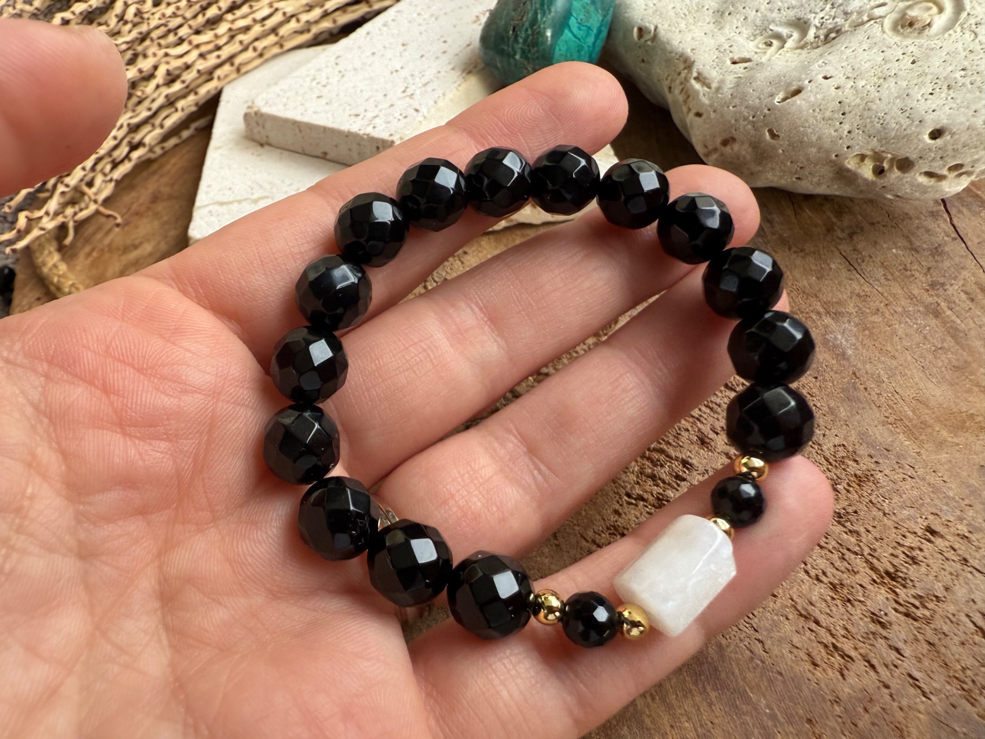 Silný, ženský a zároveň ochranný. Tento jedinečný náramok spája energiu čierneho ónyxu, jemnosť mesačného kameňa a hĺbkovú silu fazetovaného obsidiánu. Vznikol ako talizman ochrany a podpory ženskej energie a plodnosti.