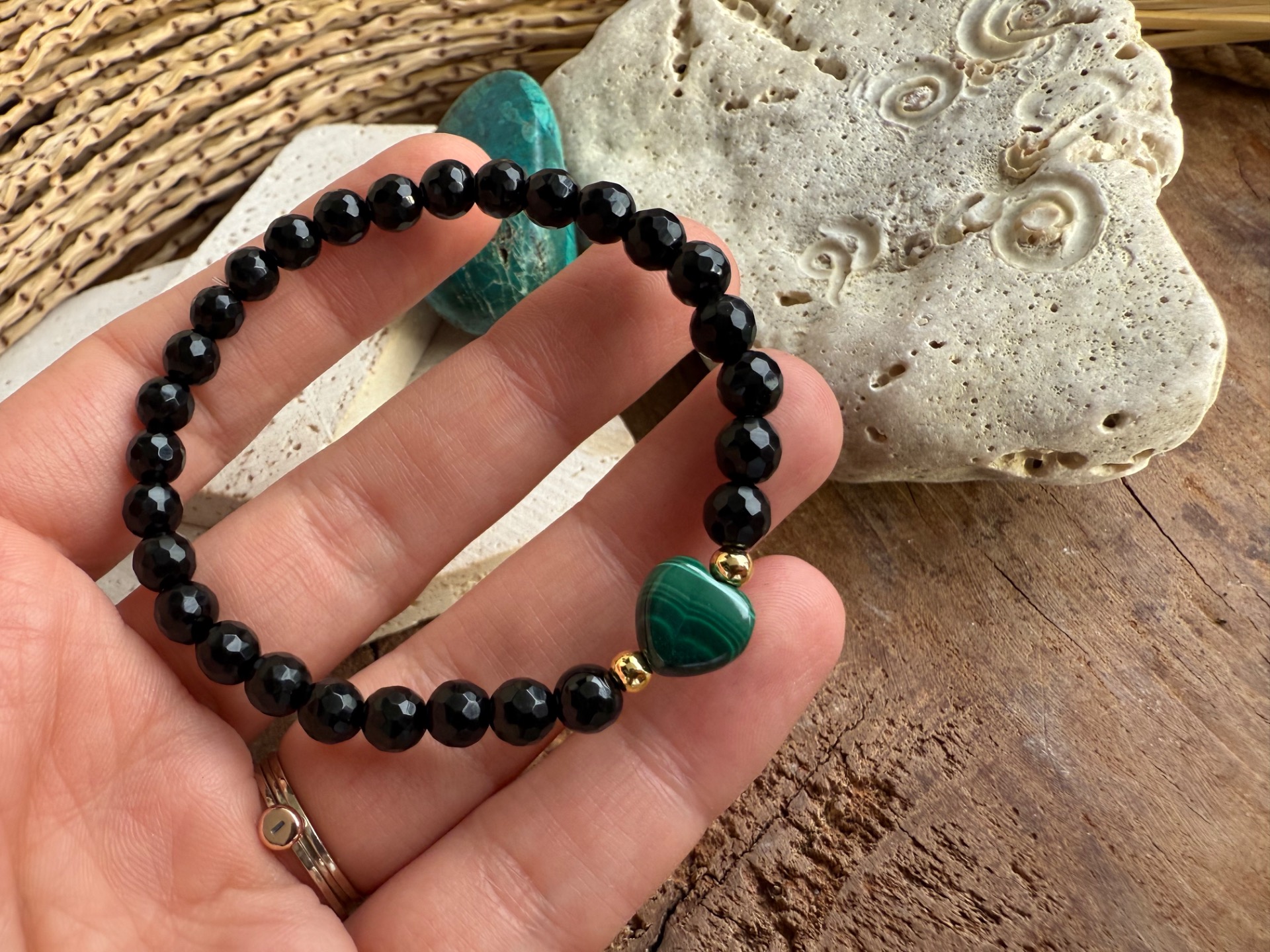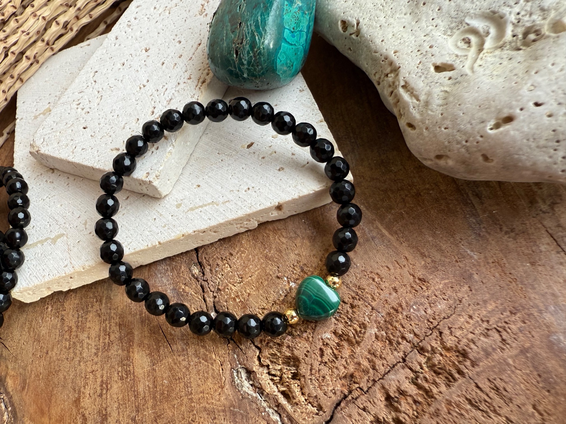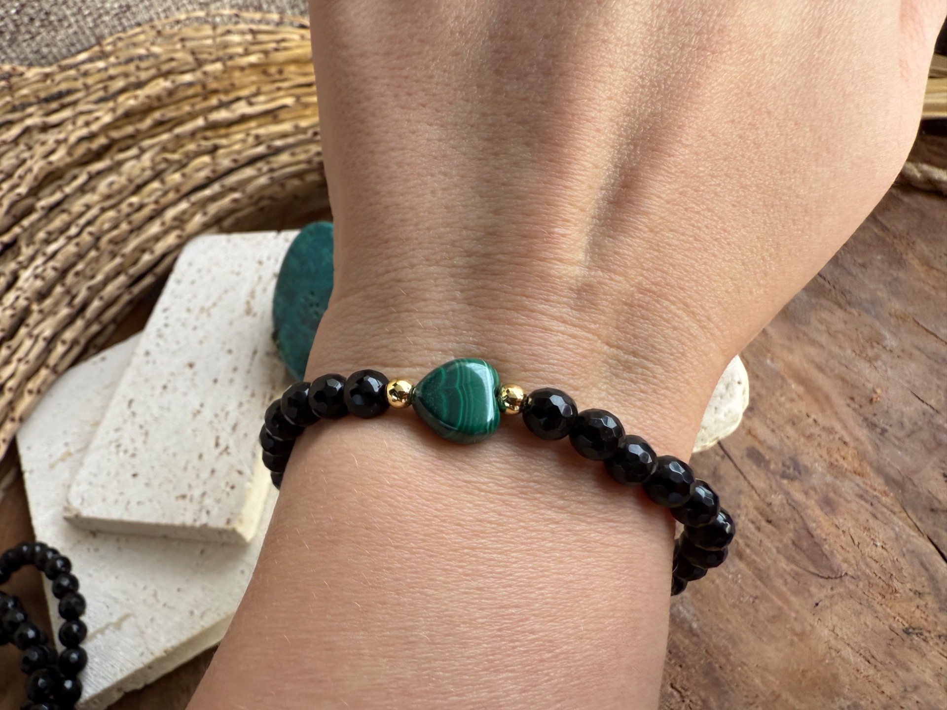 Silný a zároveň srdcový. Tento náramok spája ochrannú energiu fazetovaného obsidiánu s liečivou silou malachitu v tvare srdca. Vznikol ako talizman ochrany, vnútornej sily a vedomého otvorenia srdca.