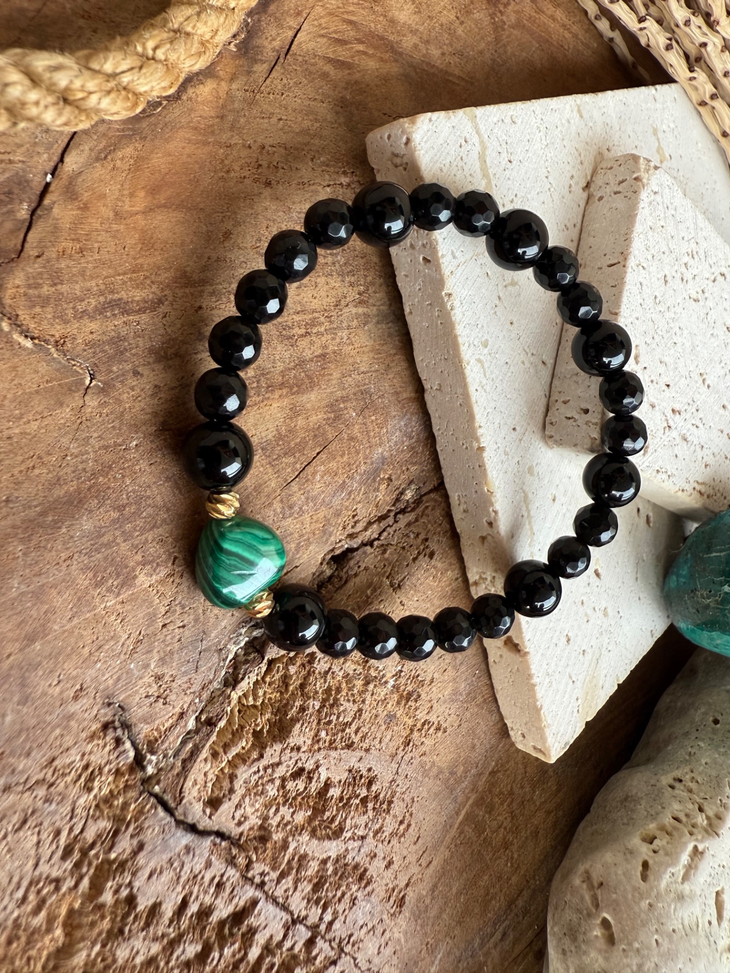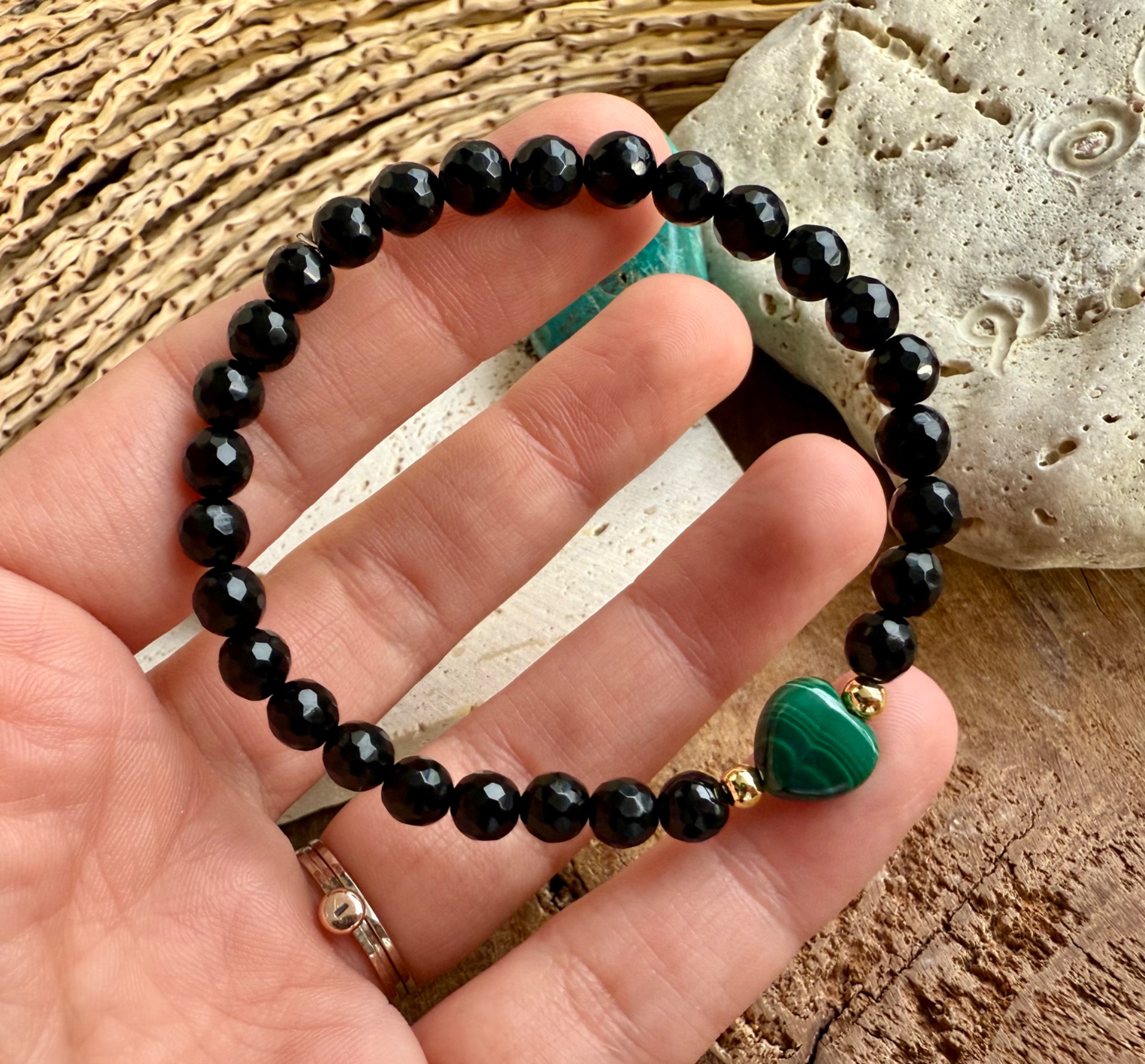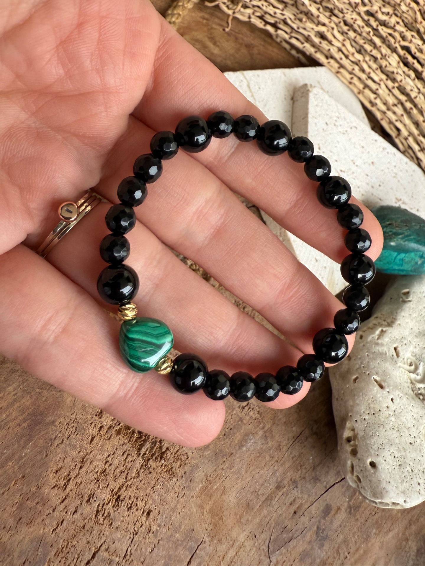Silný a zároveň srdcový. Tento náramok spája ochrannú energiu fazetovaného obsidiánu s liečivou silou malachitu v tvare srdca. Vznikol ako talizman ochrany, vnútornej sily a vedomého otvorenia srdca.