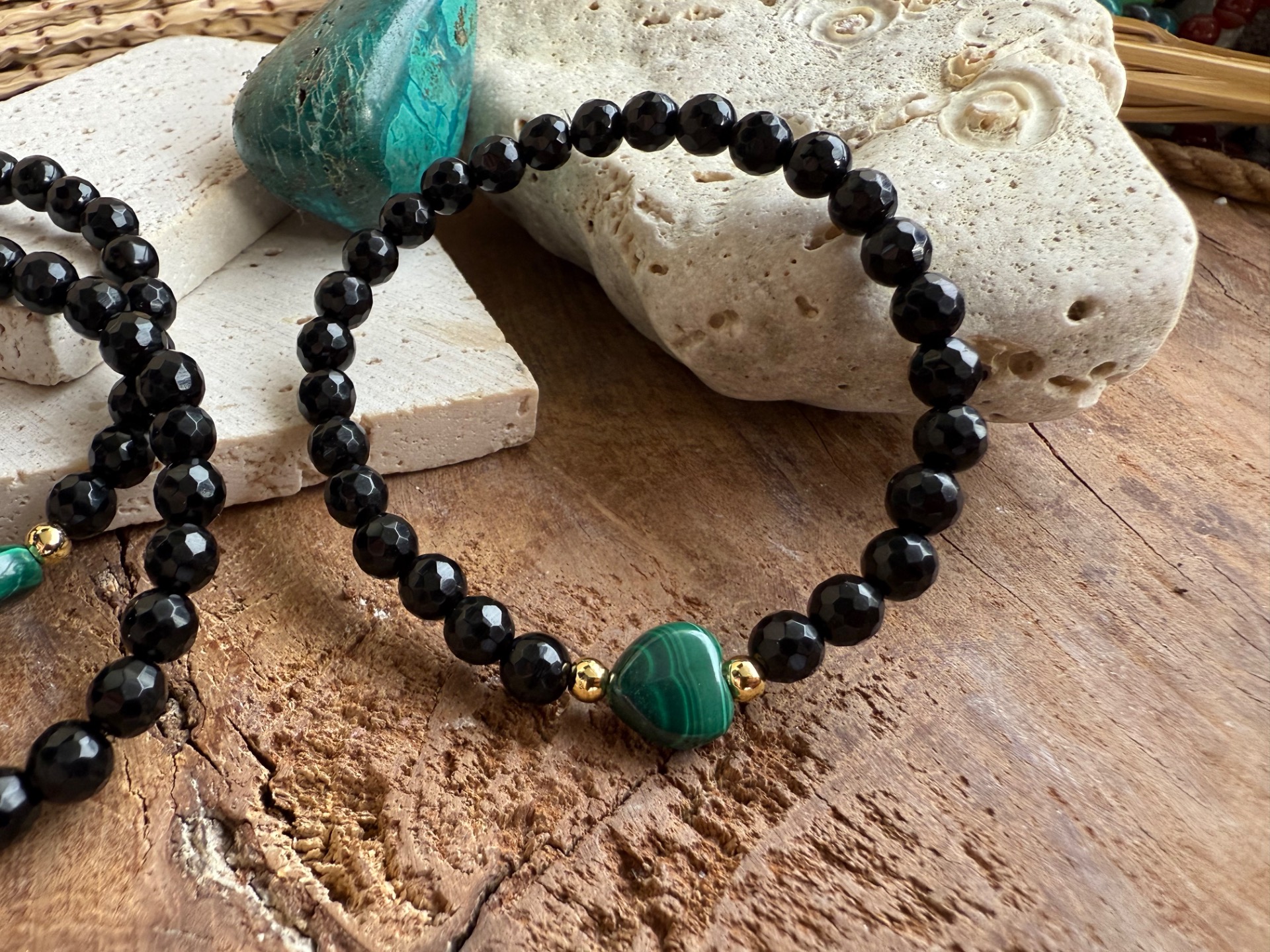 Náramok z fazetovaného obsidiánu a malachitového srdiečka – Ochranný štít