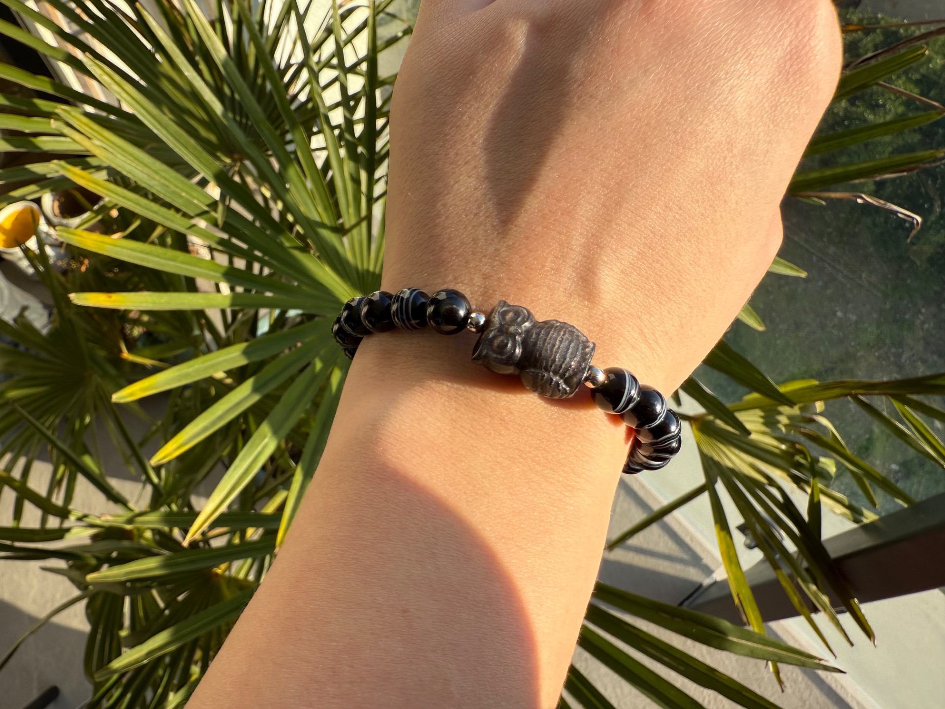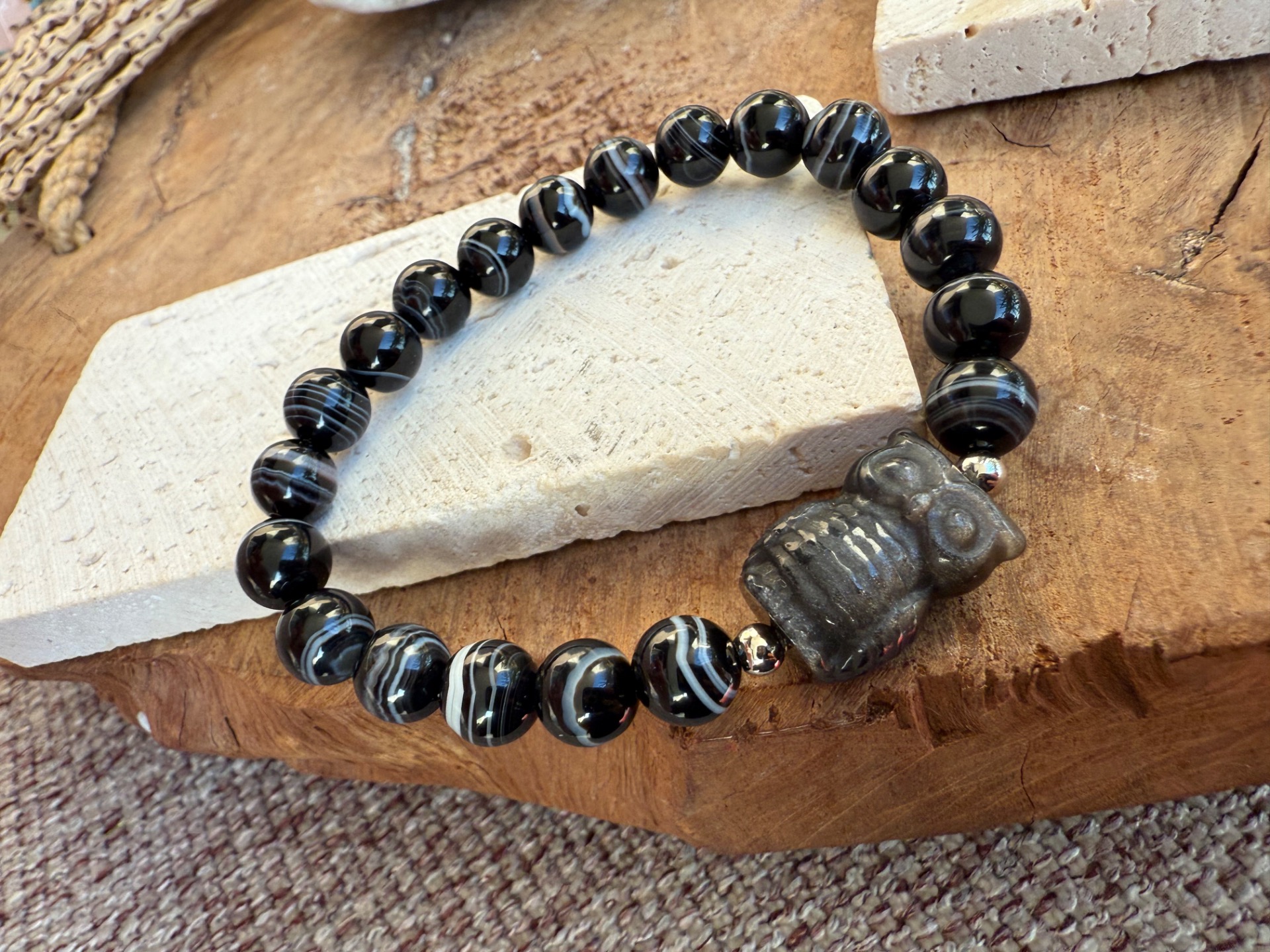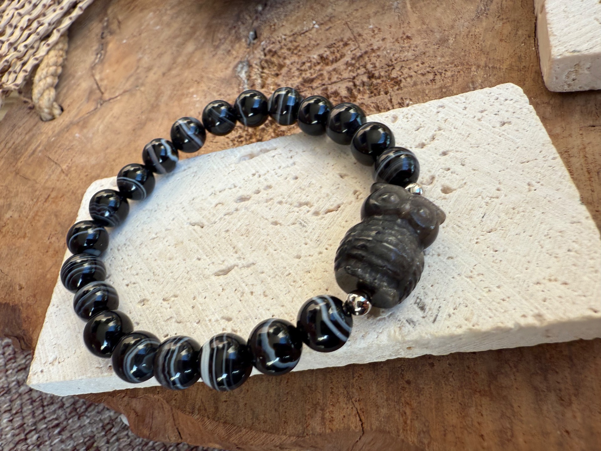 Silný ochranný náramok z kombinácie čierneho achátu (8 mm) s nádherným prirodzeným vrstvením – jemné bielo-čierne prúžky vytvárajú jedinečnú kresbu každého kameňa. Dominantou je vyrezávaná sova zo strieborného obsidiánu, ktorá pôsobí mysticky a hlboko.