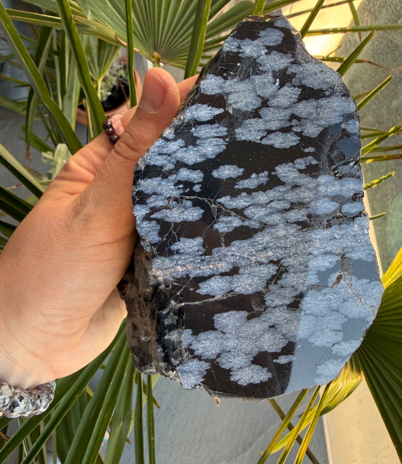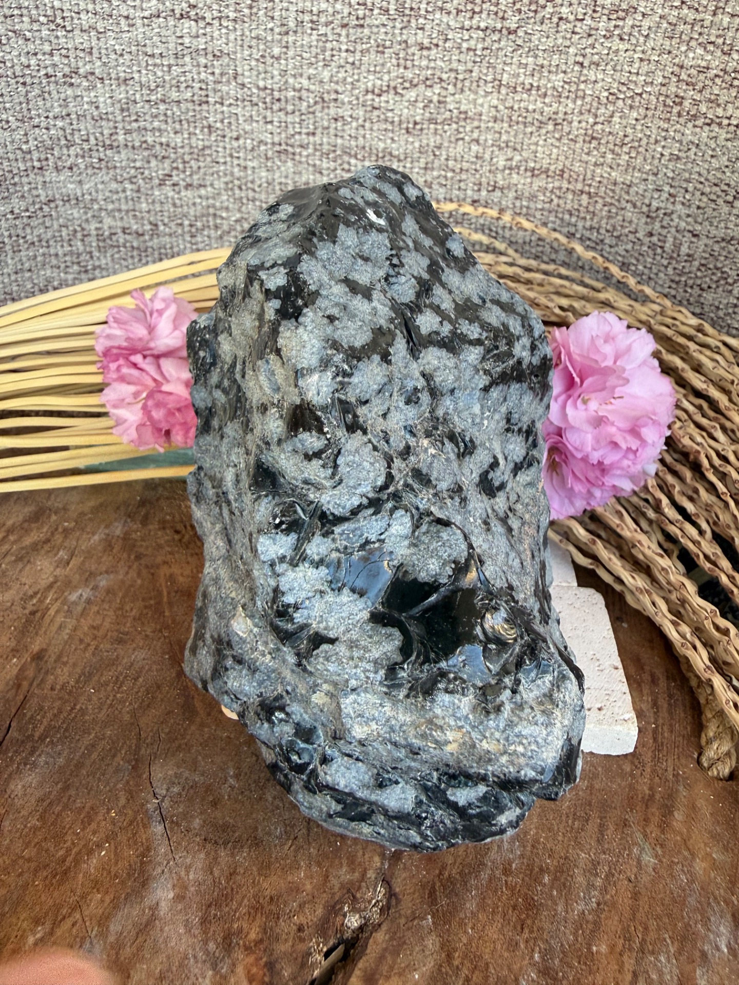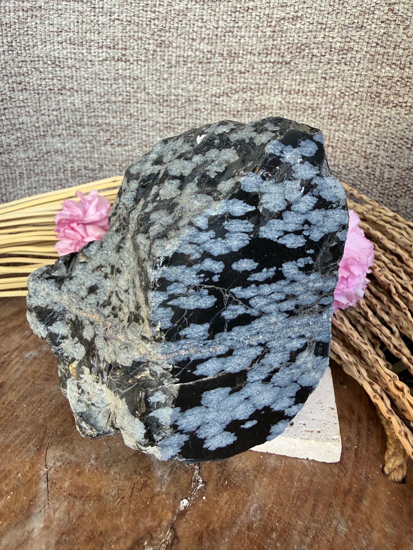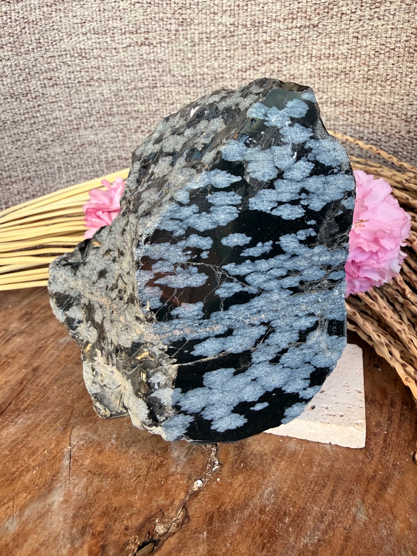Tento nádherný vločkový obsidián je výrazný voľne stojaci kúsok s hmotnosťou 1,2 kg, ktorý v sebe spája surovú silu vulkanického skla a jemnú estetiku prírodných "vločiek" (snehových inklúzií). Ide o mimoriadne zaujímavý minerál, kde sa na čiernom podklade objavujú svetlosivé až biele obrazce pripomínajúce zasneženú nočnú oblohu.