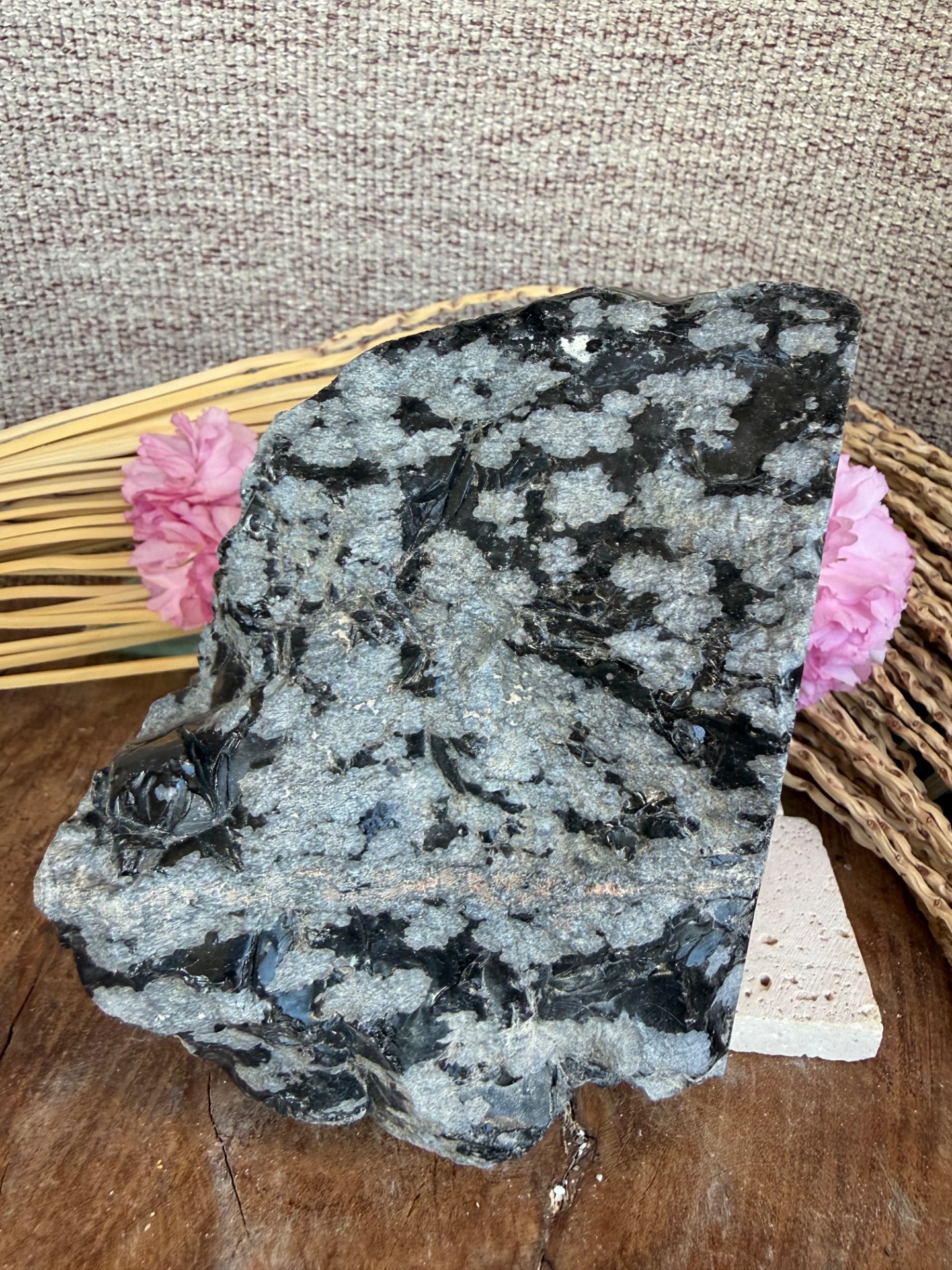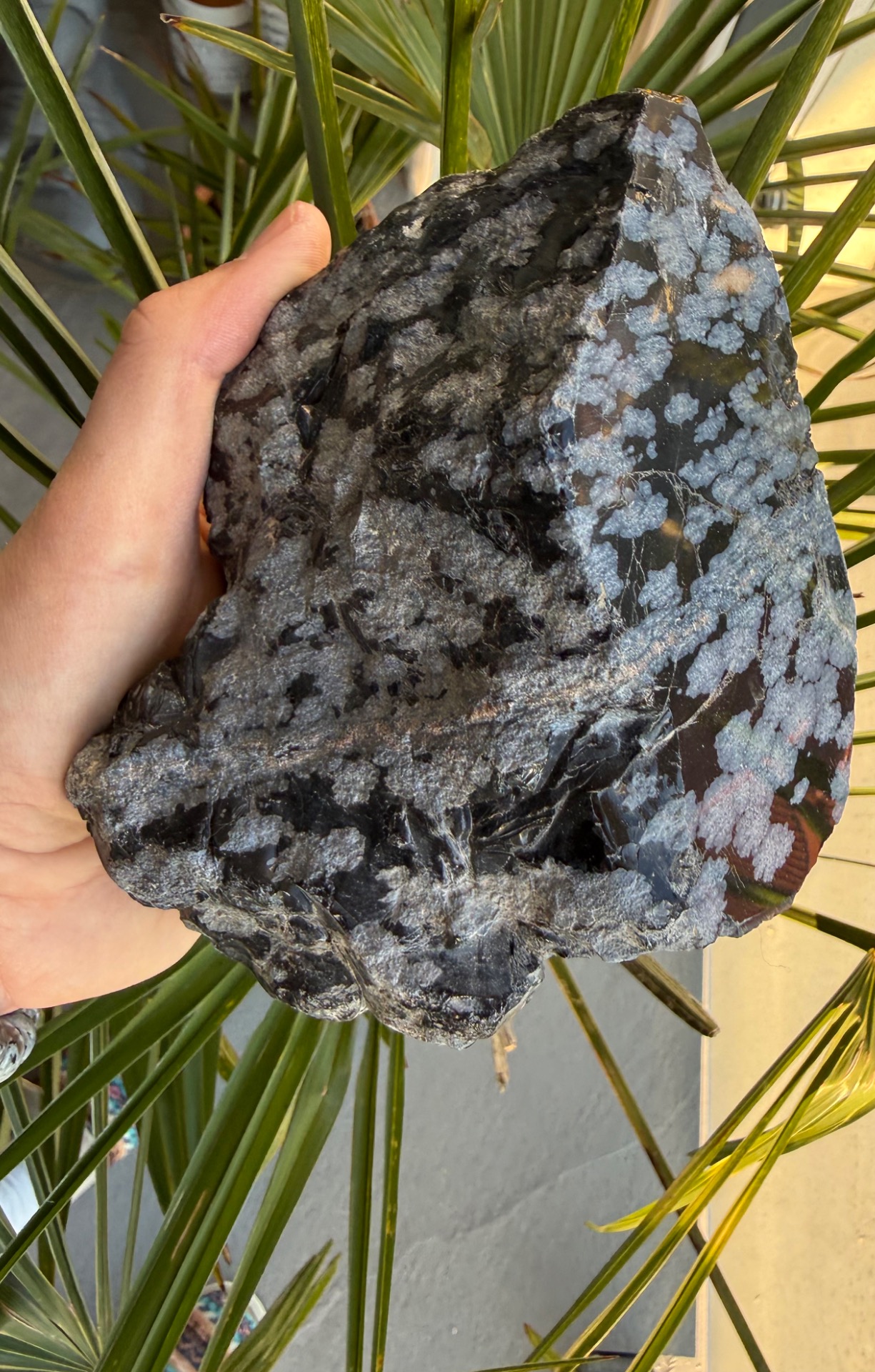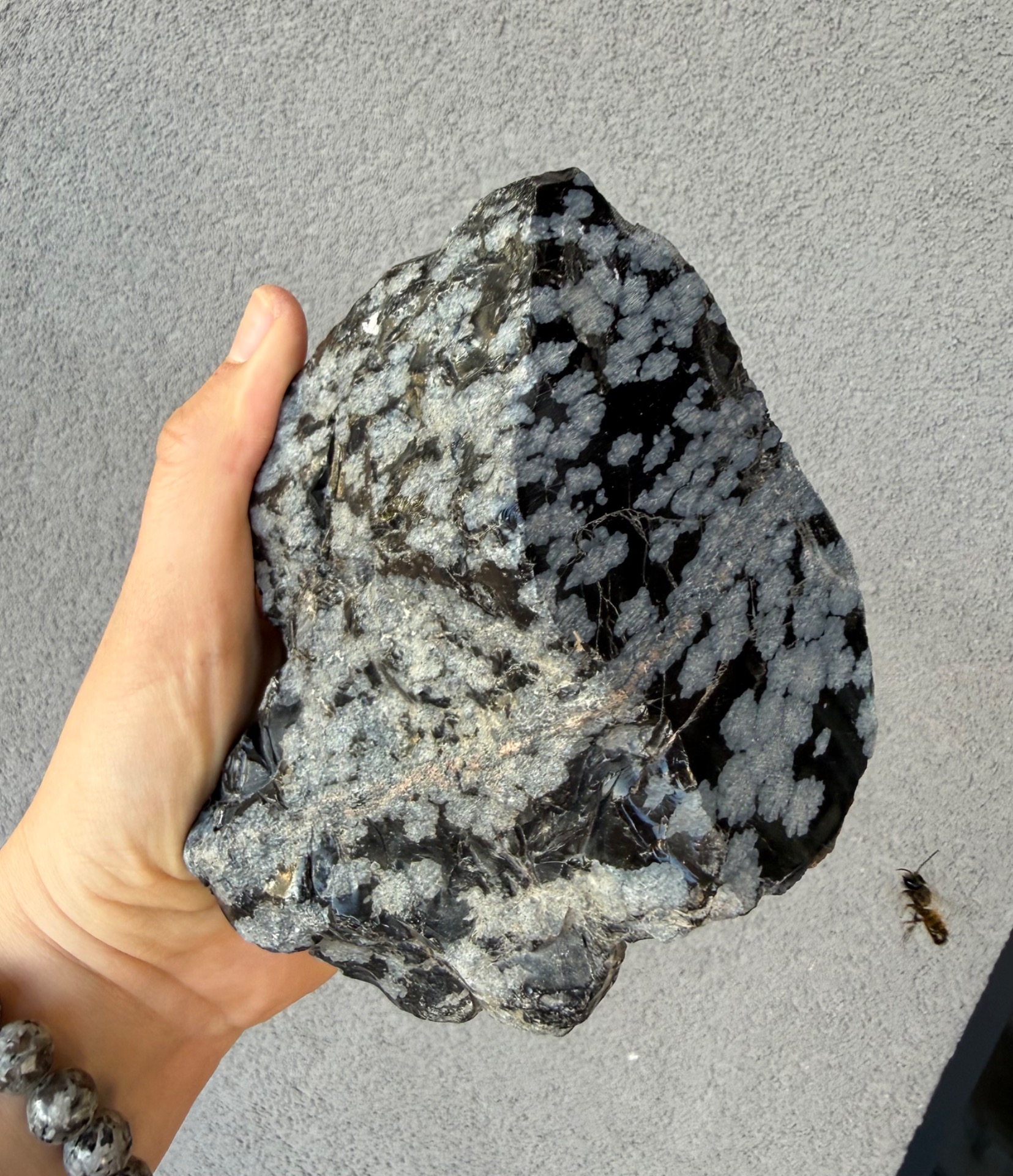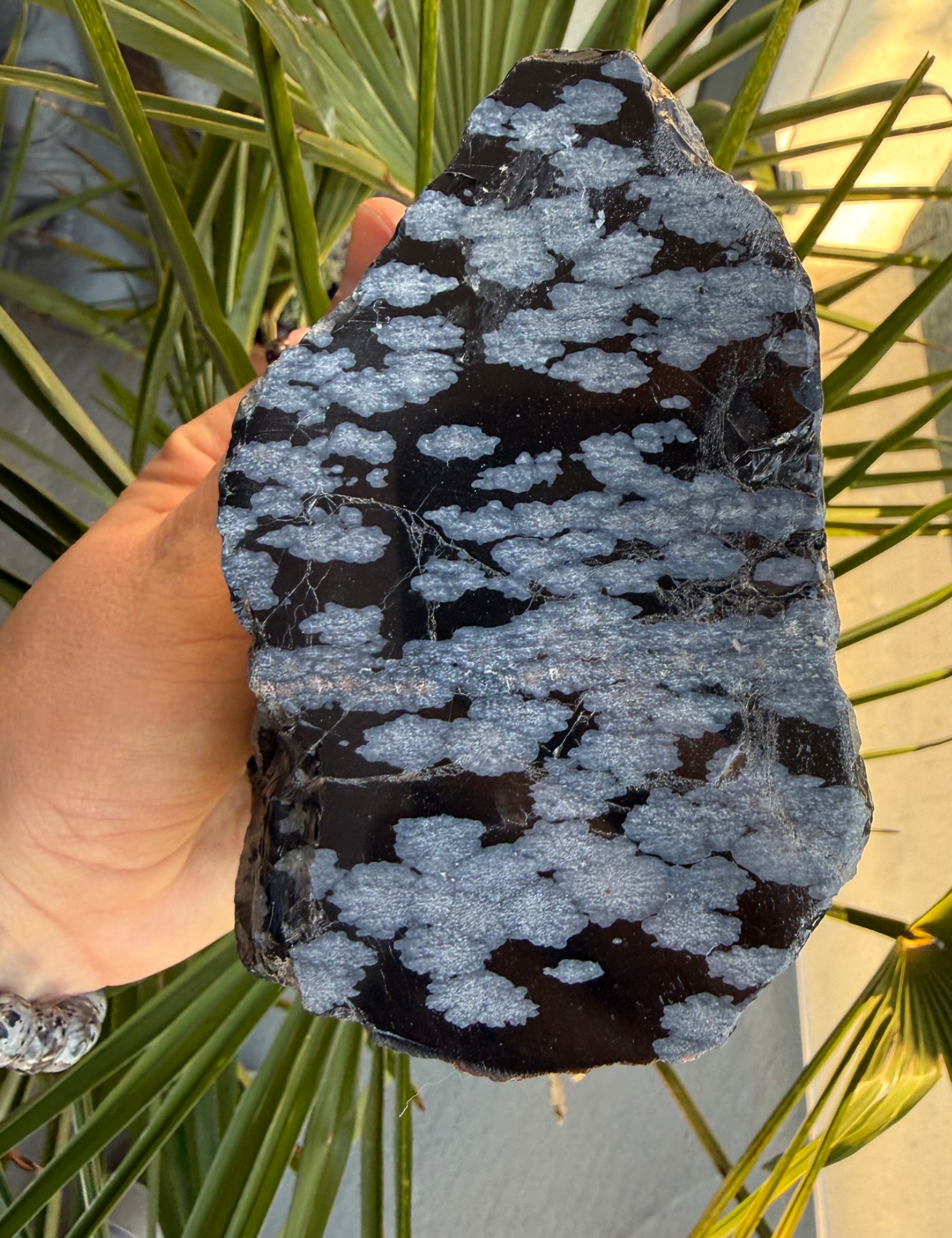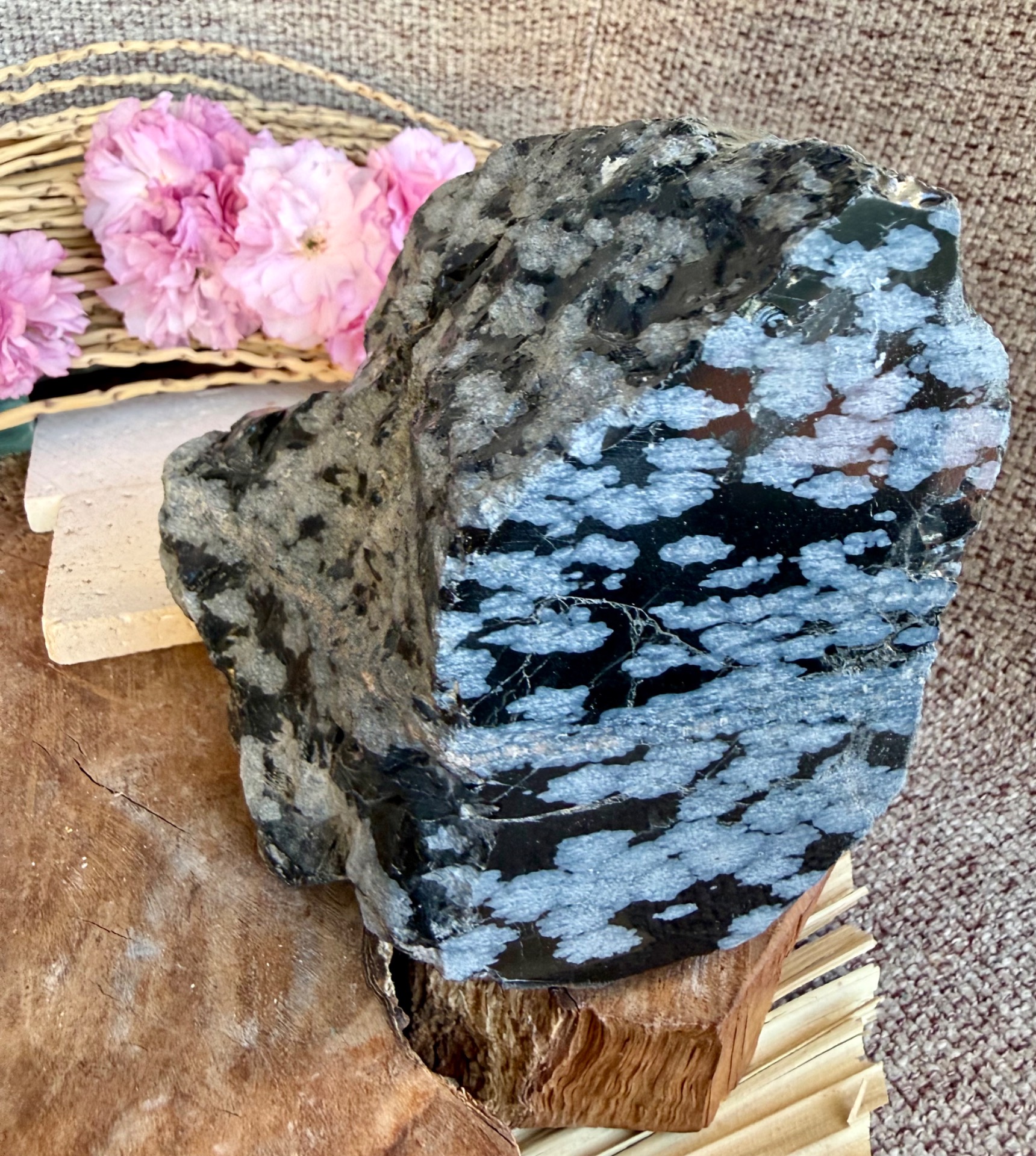 Tento nádherný vločkový obsidián je výrazný voľne stojaci kúsok s hmotnosťou 1,2 kg, ktorý v sebe spája surovú silu vulkanického skla a jemnú estetiku prírodných "vločiek" (snehových inklúzií). Ide o mimoriadne zaujímavý minerál, kde sa na čiernom podklade objavujú svetlosivé až biele obrazce pripomínajúce zasneženú nočnú oblohu.