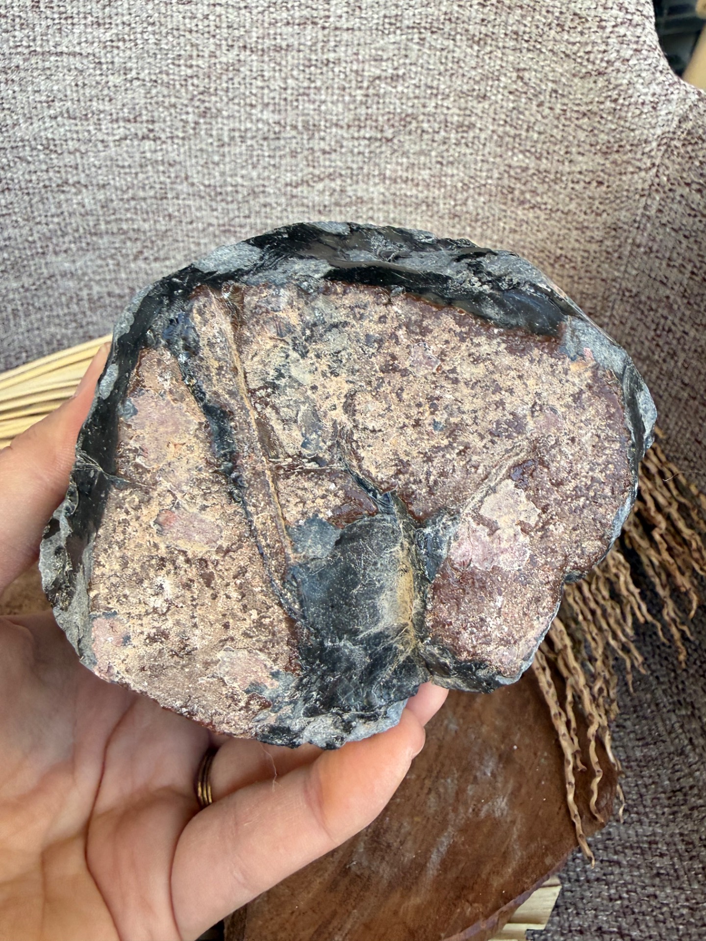 Jedna strana je leštená, čo zvýrazňuje kontrast a hĺbku štruktúry, zatiaľ čo zvyšok zostáva úplne surový – presne tak, ako ho vytvorila sopečná aktivita Zeme.