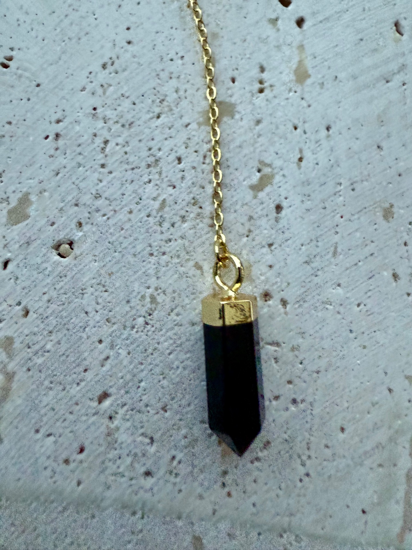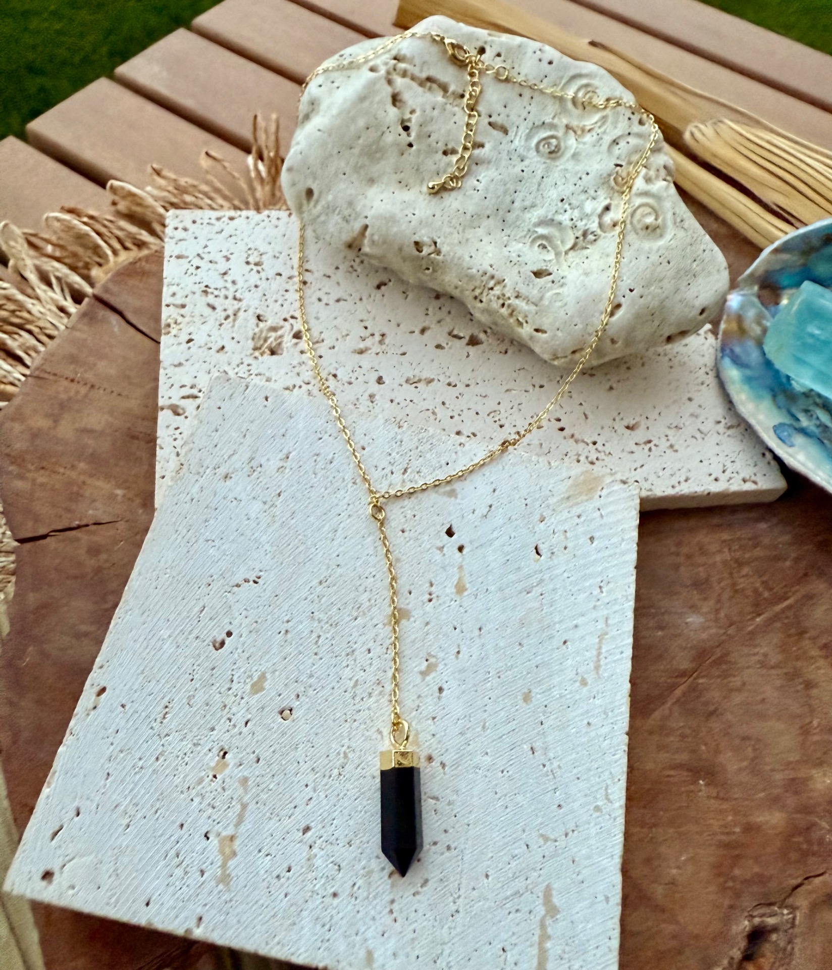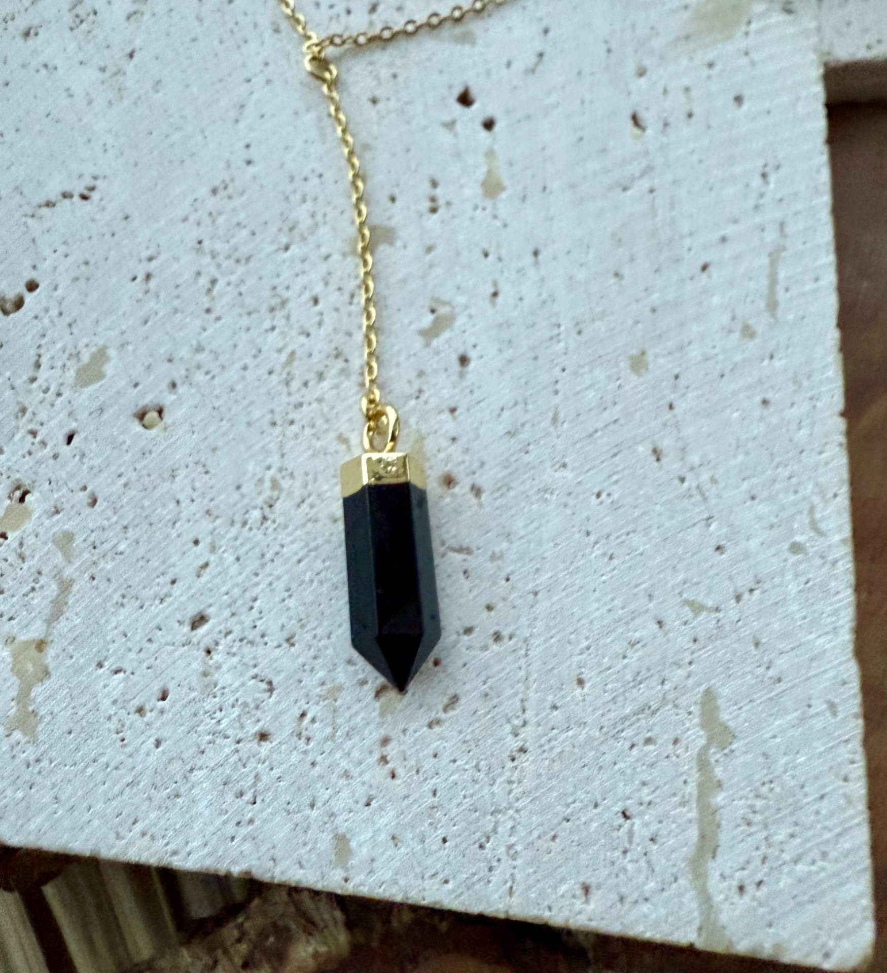 Elegantná Y retiazka s jemným zlatým leskom 18k gold plated prináša do každého dňa sofistikovanú eleganciu a energiu. Na jej konci visiaci hrot čierneho ónyxu posilňuje vnútornú silu, odvahu a stabilitu, pričom dodáva šperku elegantný a zároveň výrazný akcent.