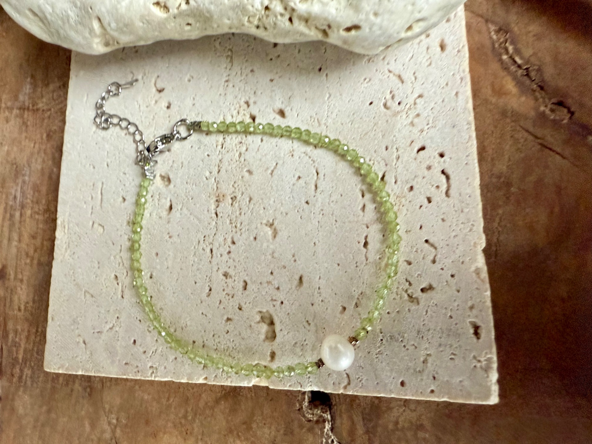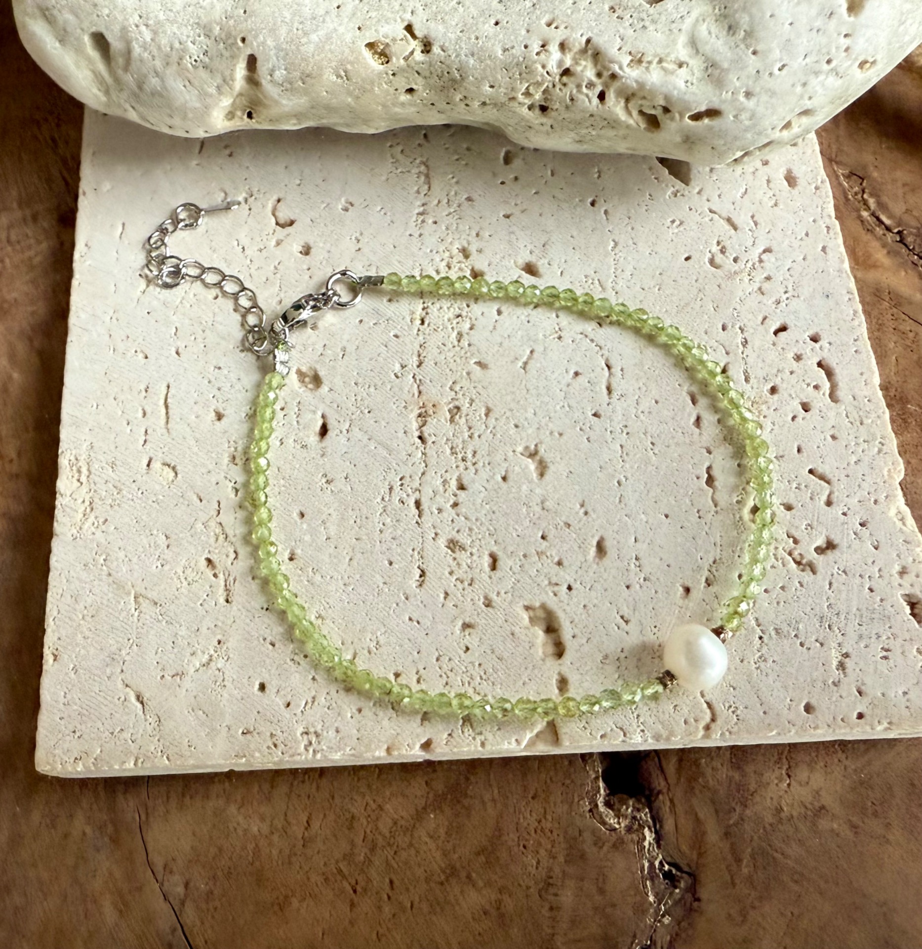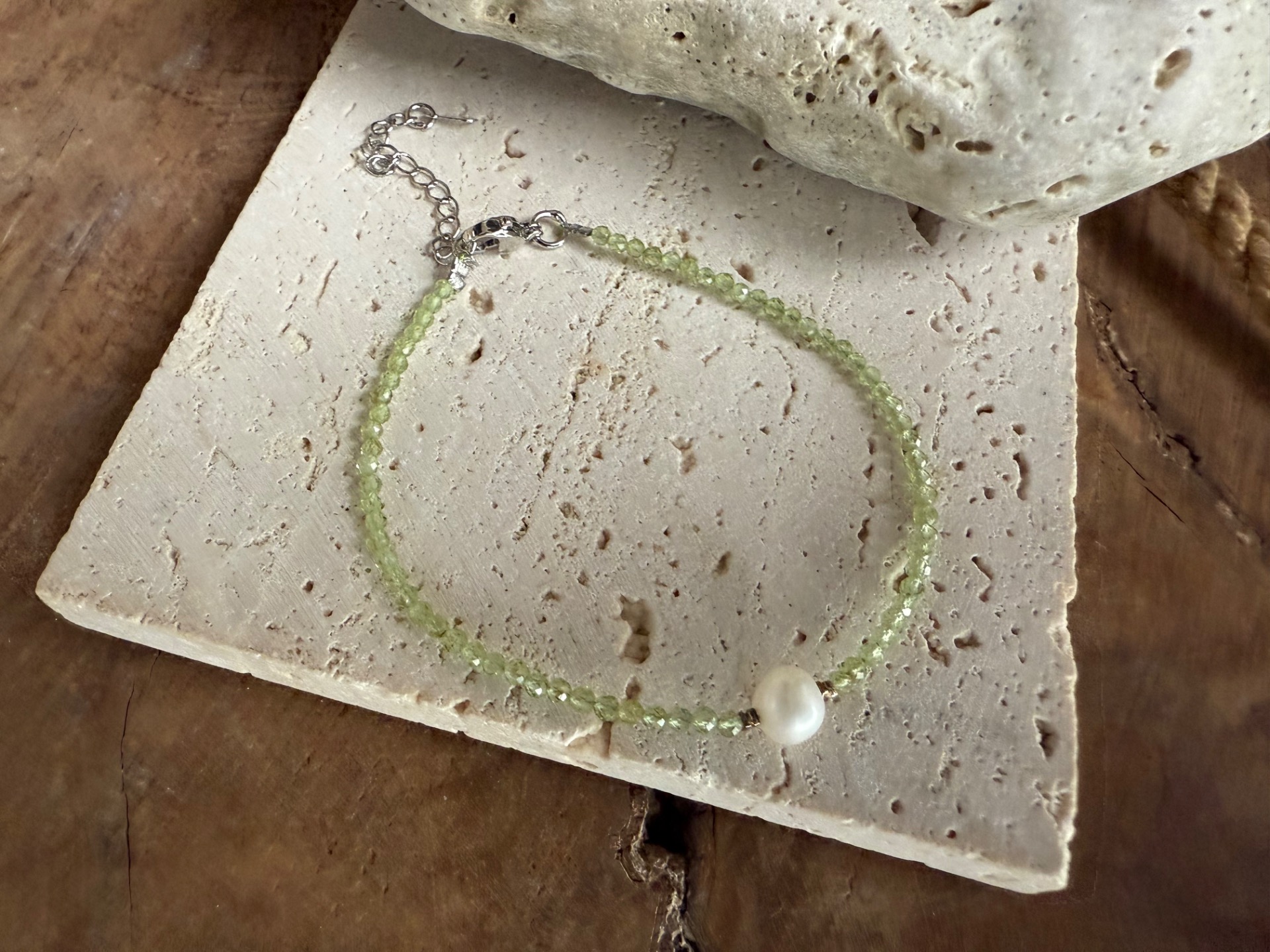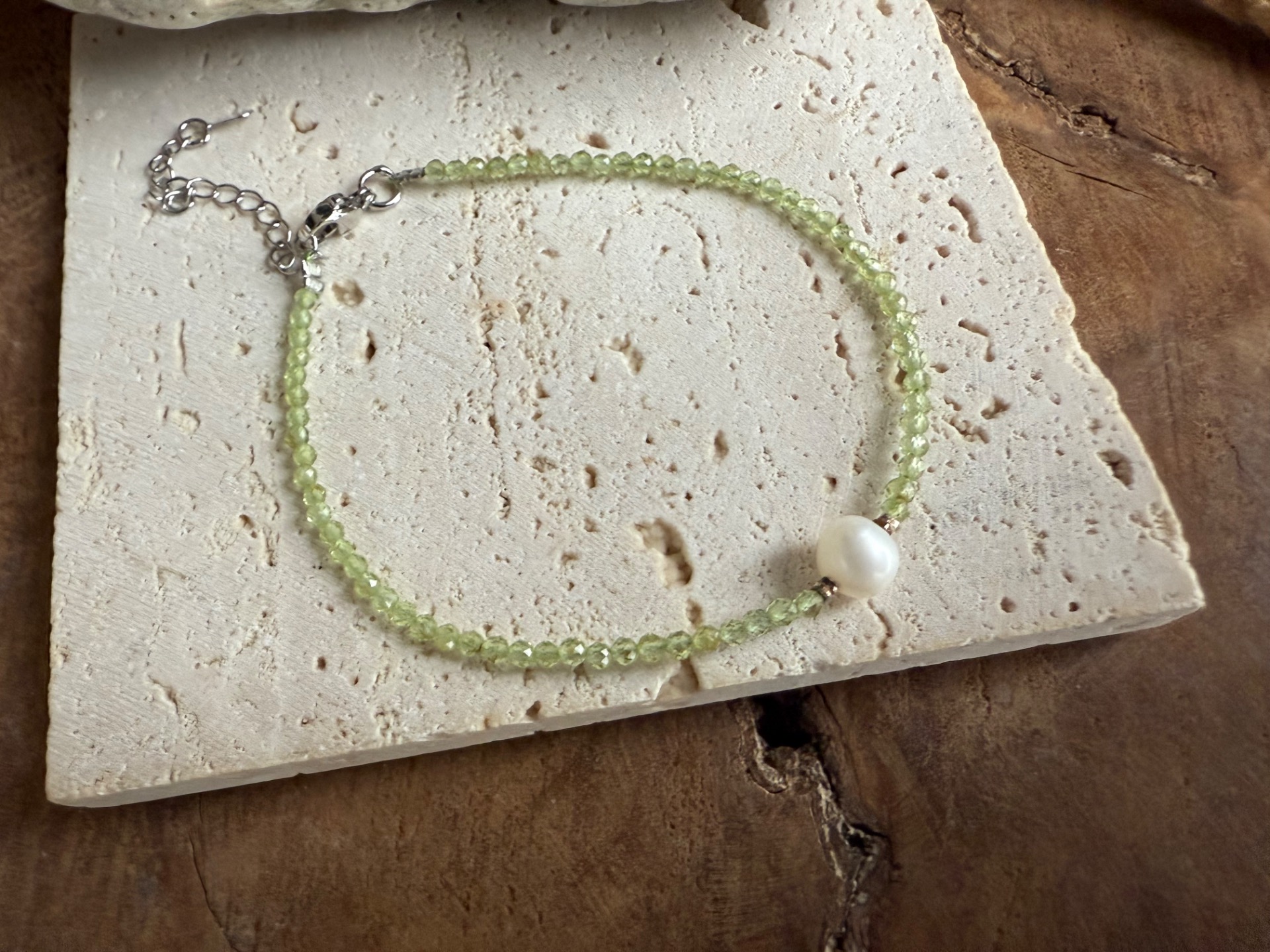 Náramok z olivínu s riečnou perlou – strieborné ladenie