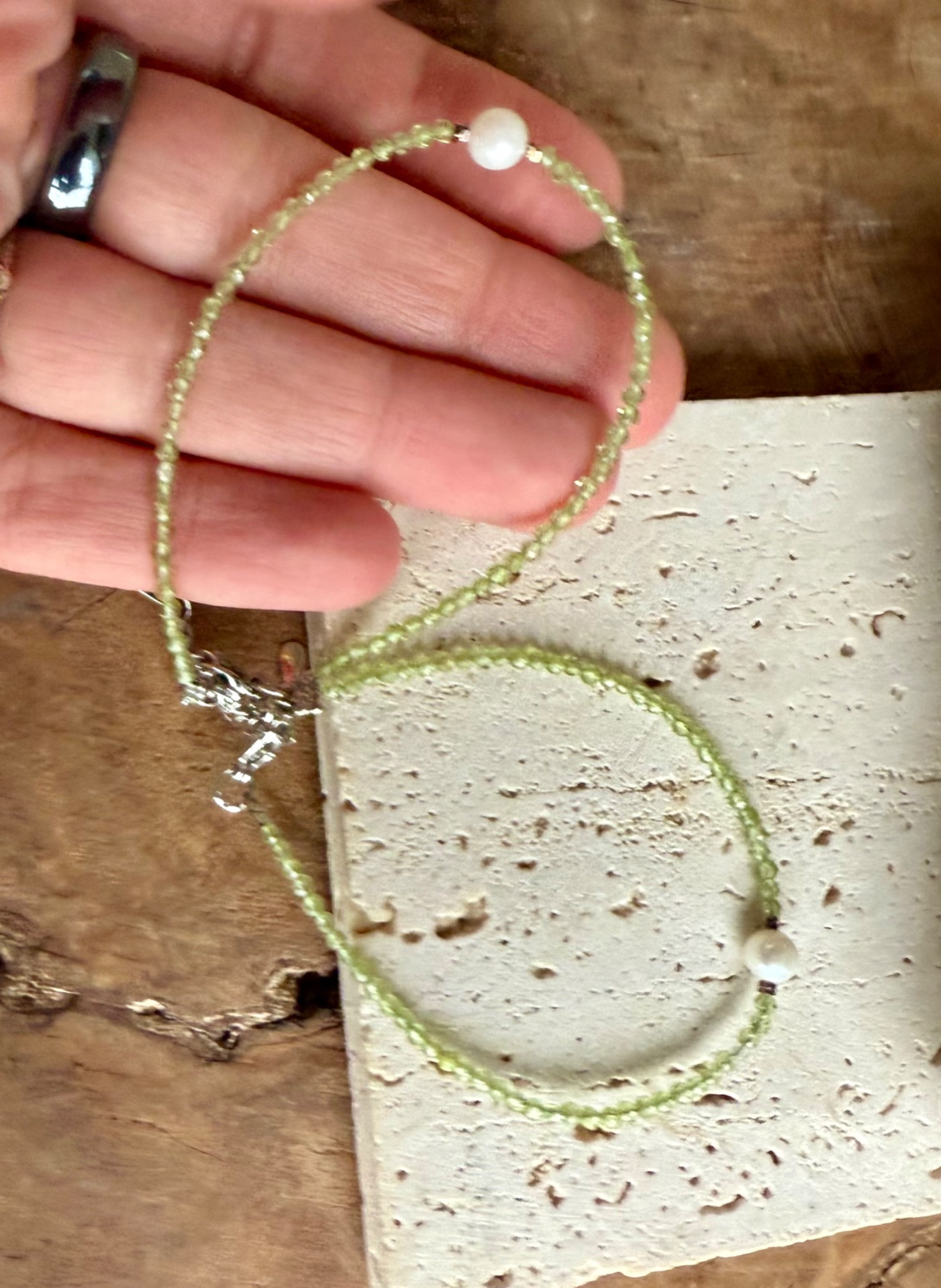 Elegantný náramok z 2 mm korálok olivínu, doplnený jedinečnou riečnou perlou v strede, s jemnými striebornými komponentmi. Tento kúsok spája jemnosť, energiu minerálu a prírodnú krásu perly, vytvára harmonický šperk vhodný na každodenné nosenie aj ako darček.