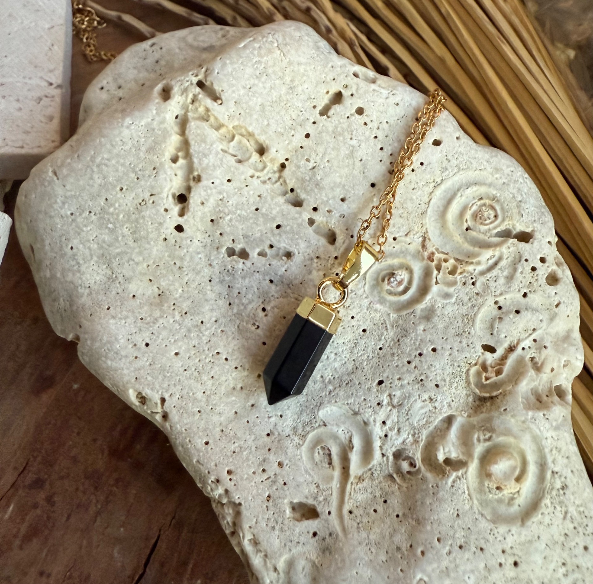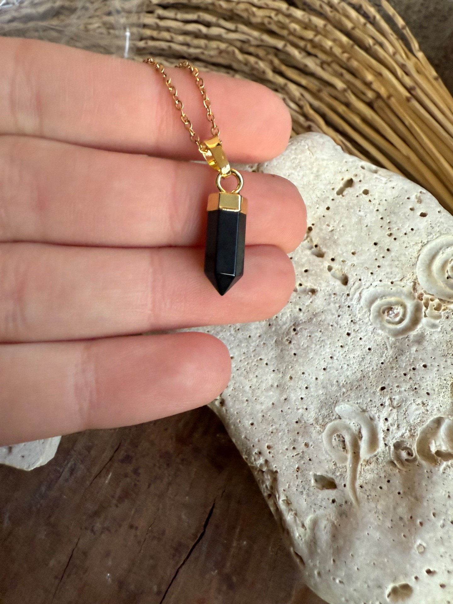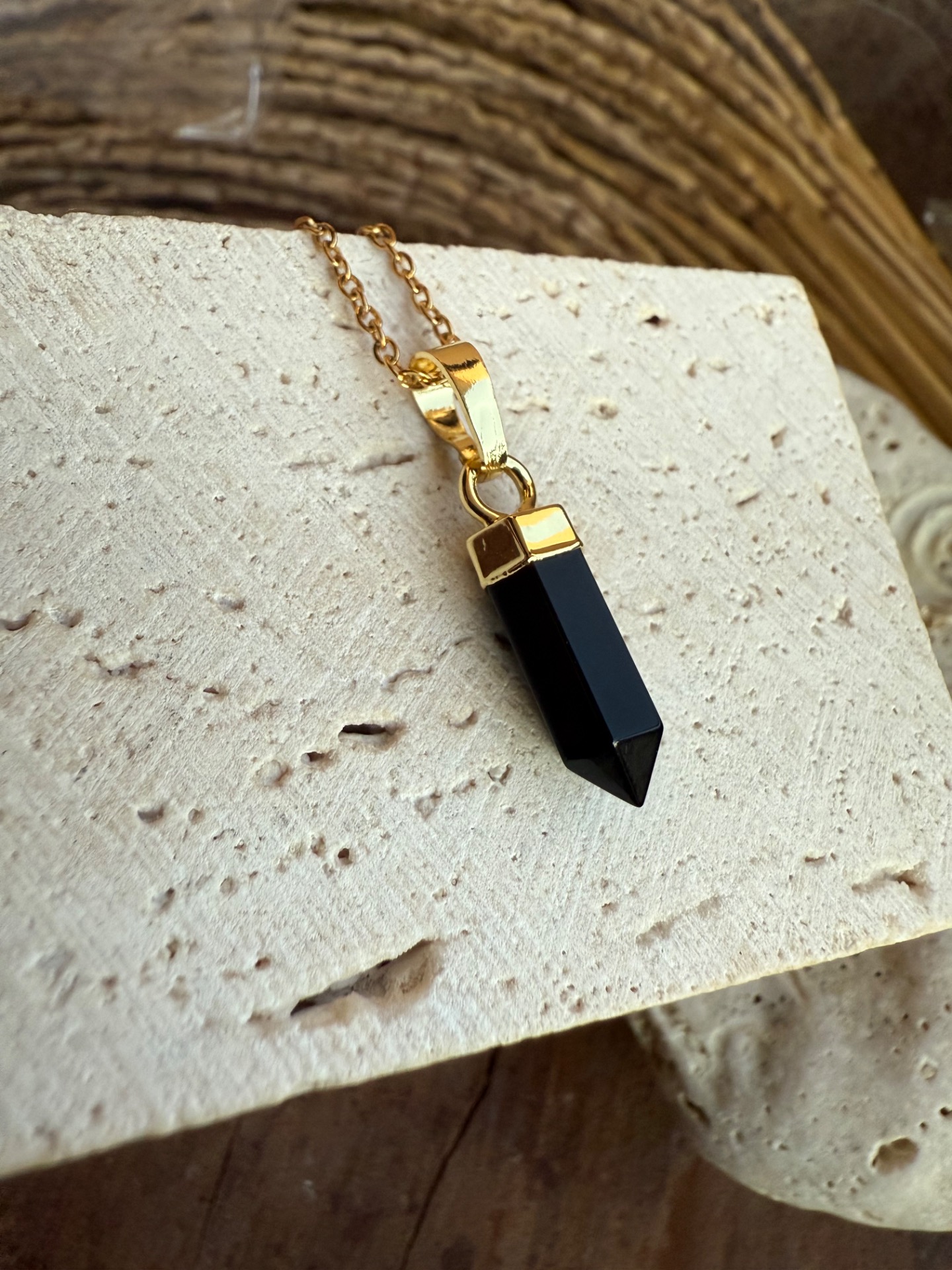 Elegantný prívesok z prírodného onyxu brúseného do tvaru šesťhranného hrotu. Jeho hladký, lesklý povrch v hlbokej čiernej farbe pôsobí nadčasovo a výrazne zároveň. Minimalistický dizajn dopĺňa kovový detail a retiazka, vďaka čomu je ideálny na každodenné nosenie aj vrstvenie s ďalšími náhrdelníkmi.