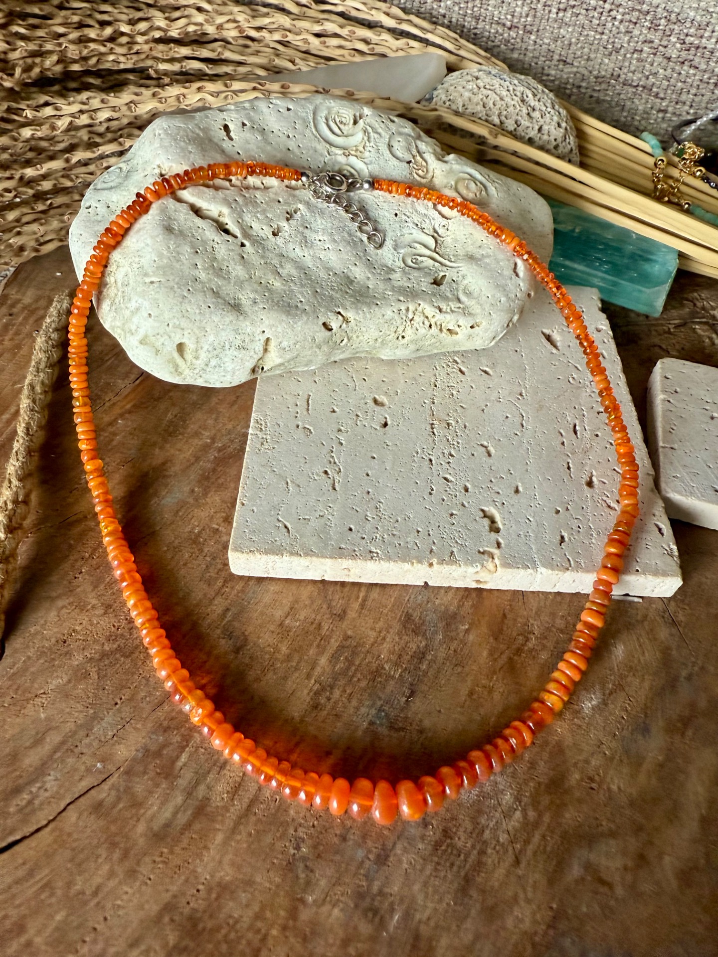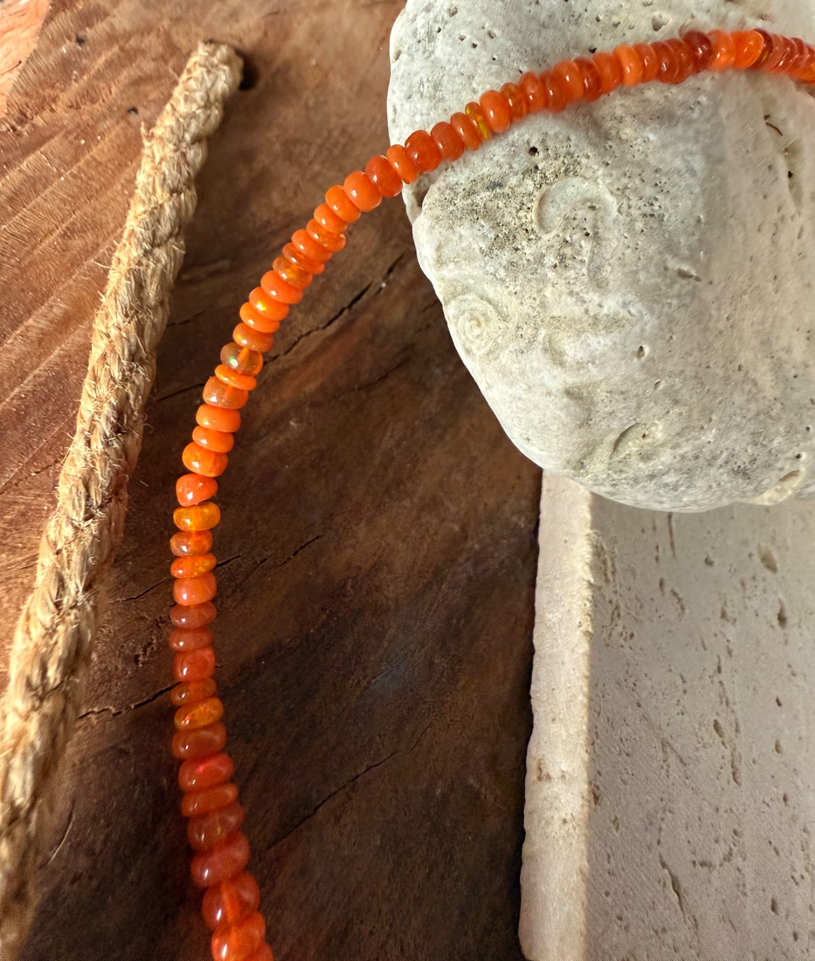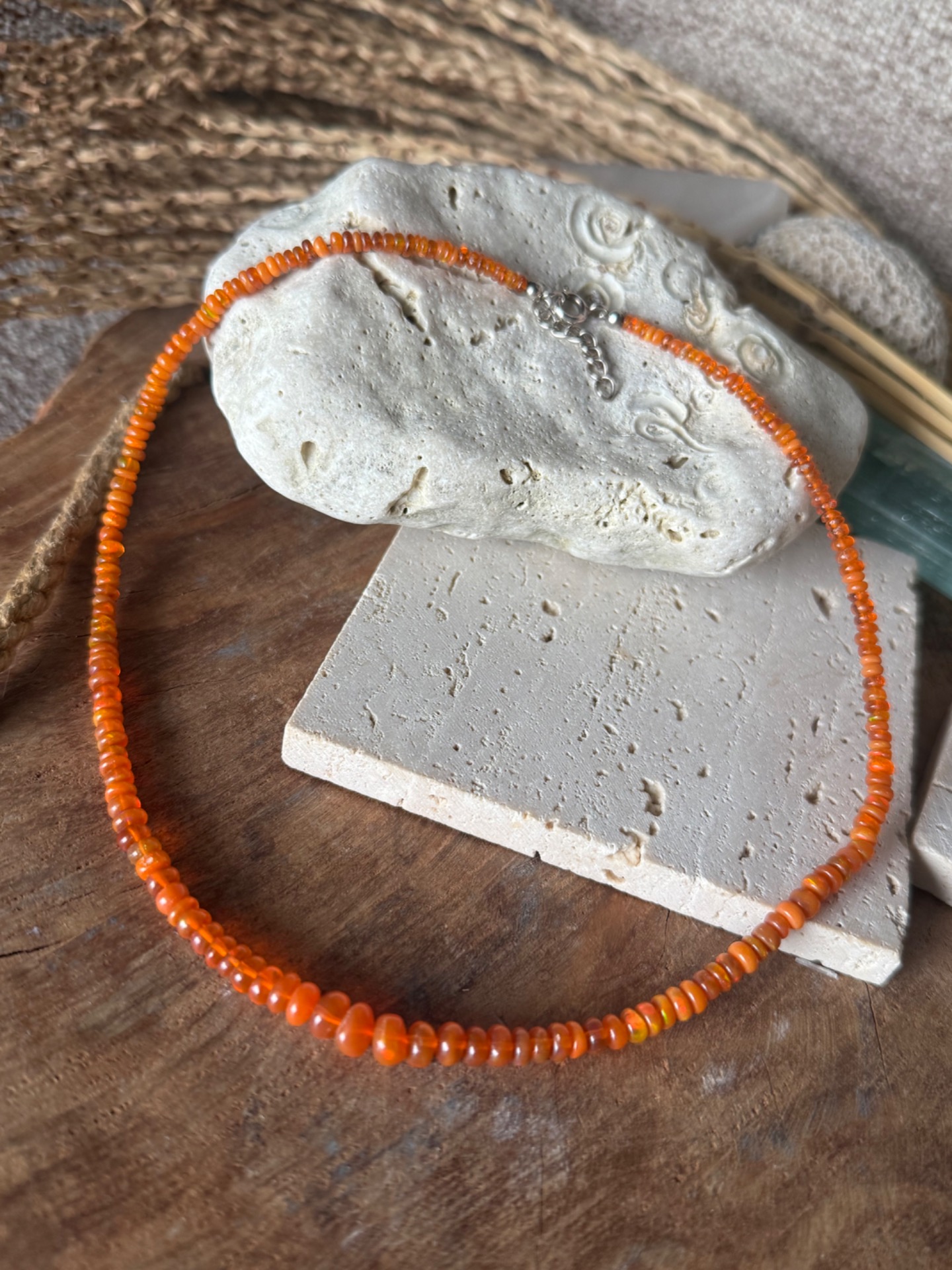 Výrazný, no stále jemný krátky náhrdelník z pravého etiópskeho opálu v sýtych oranžových tónoch pôsobí ako iskra životnej energie. Opál zachytáva svetlo jedinečným spôsobom a pri pohybe jemne mení svoj odtieň, čím vytvára živý, takmer magický efekt. Tento šperk je neprehliadnuteľný a zároveň elegantný.