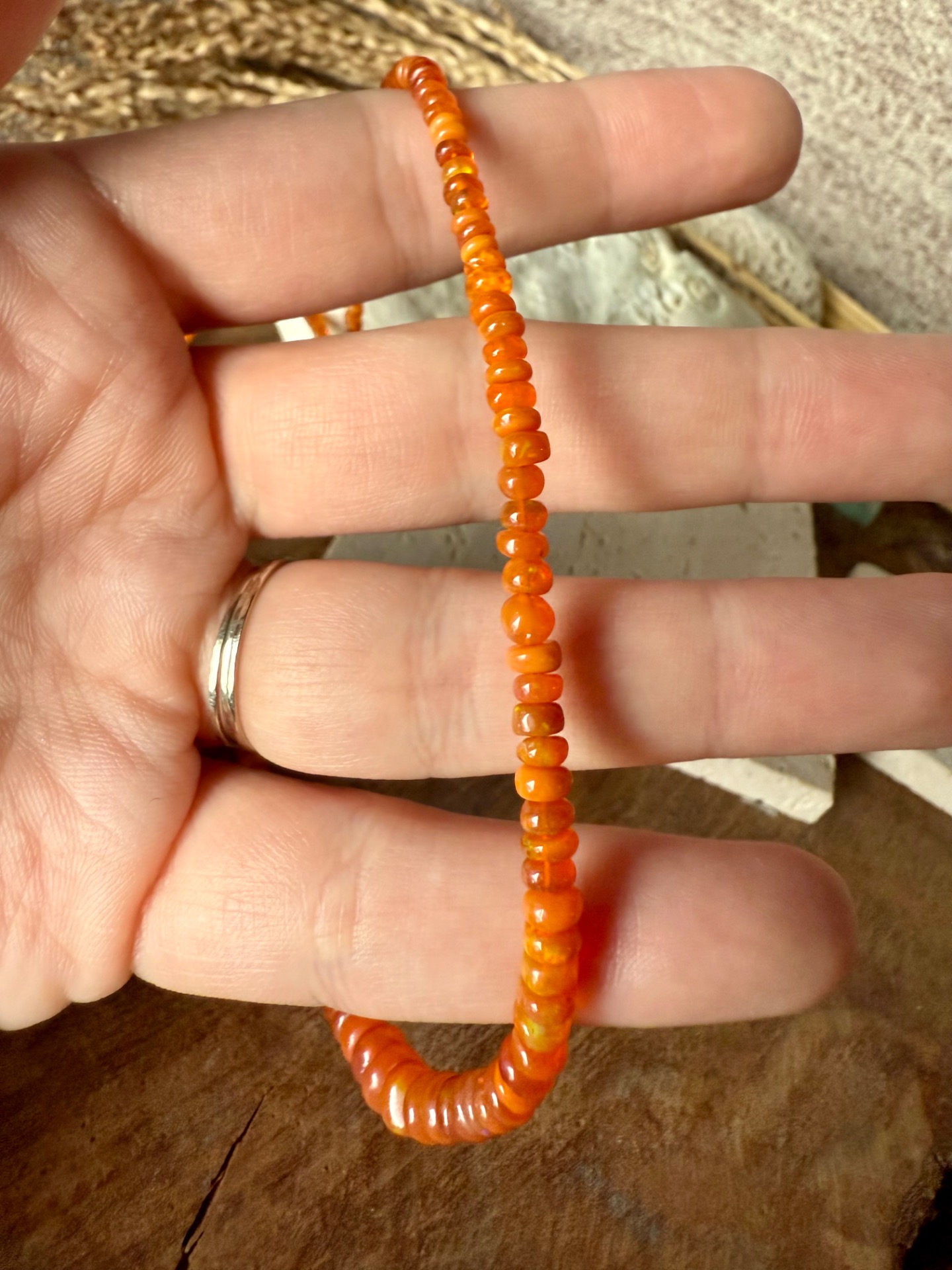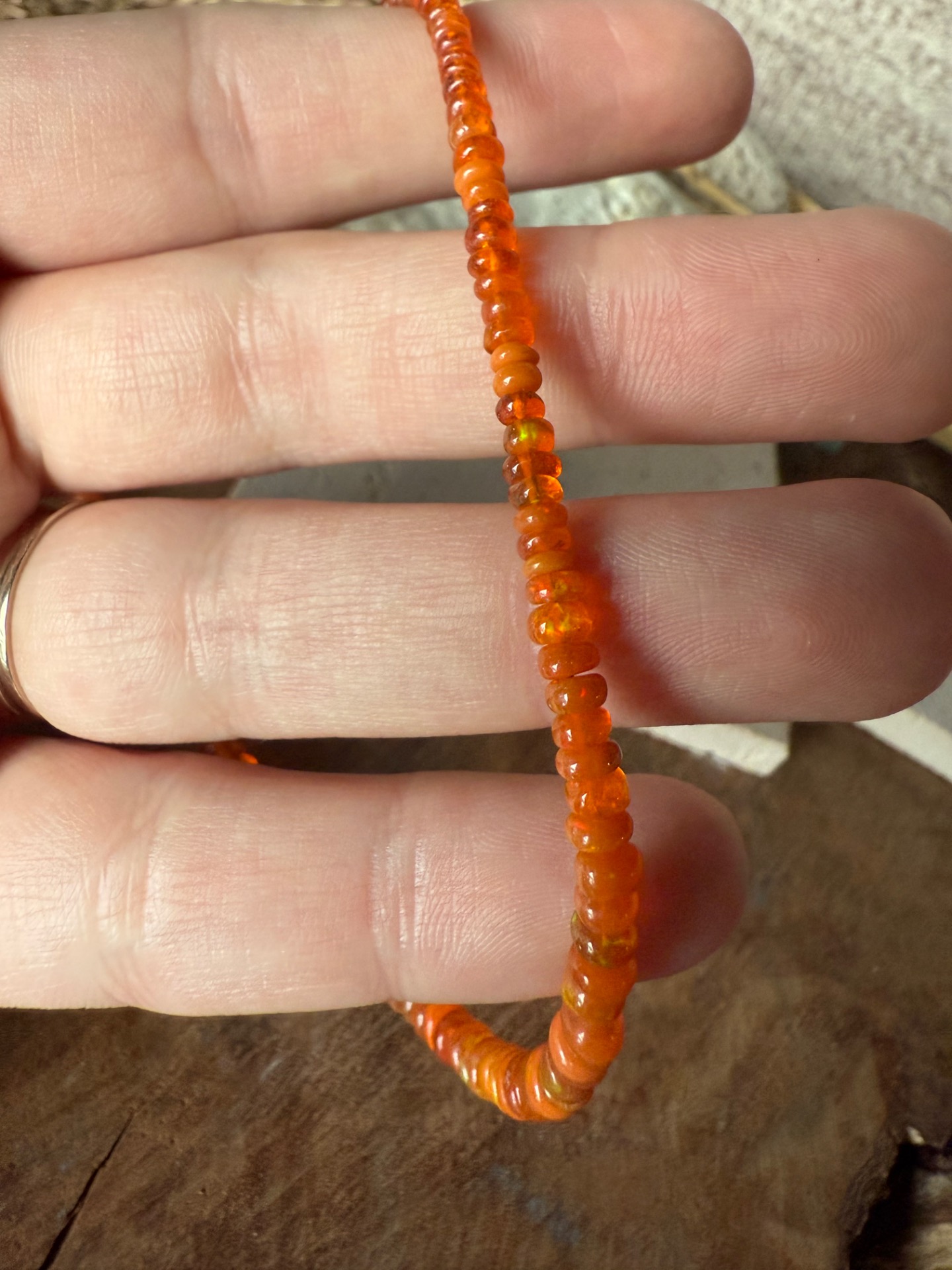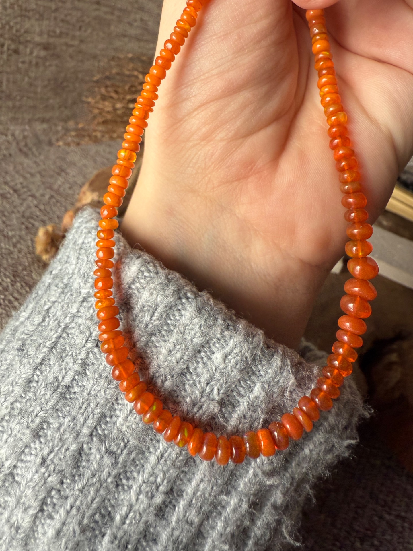 Výrazný, no stále jemný krátky náhrdelník z pravého etiópskeho opálu v sýtych oranžových tónoch pôsobí ako iskra životnej energie. Opál zachytáva svetlo jedinečným spôsobom a pri pohybe jemne mení svoj odtieň, čím vytvára živý, takmer magický efekt. Tento šperk je neprehliadnuteľný a zároveň elegantný.