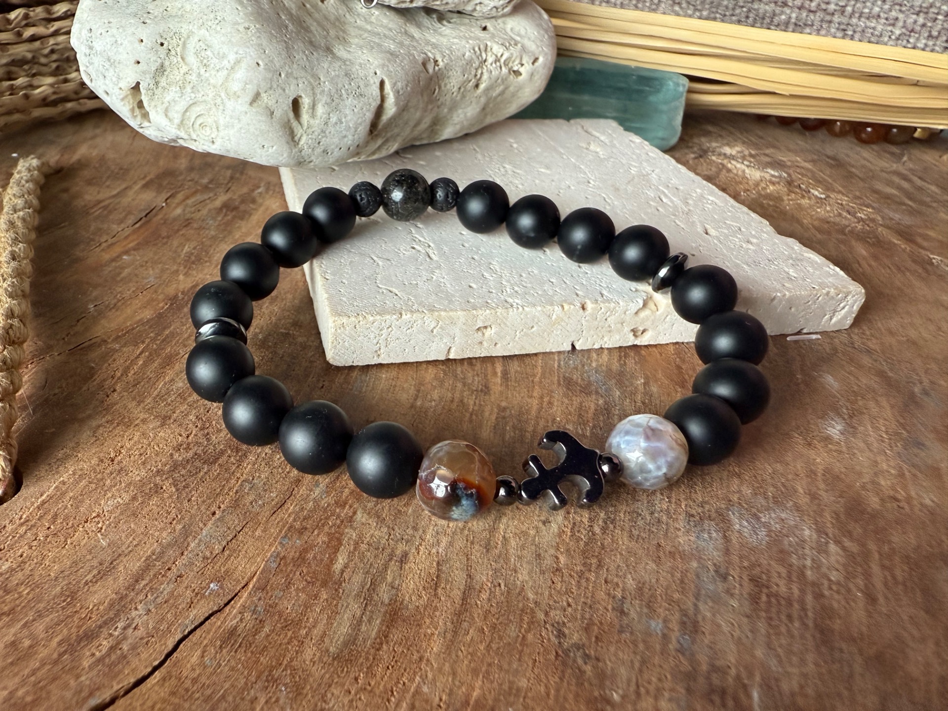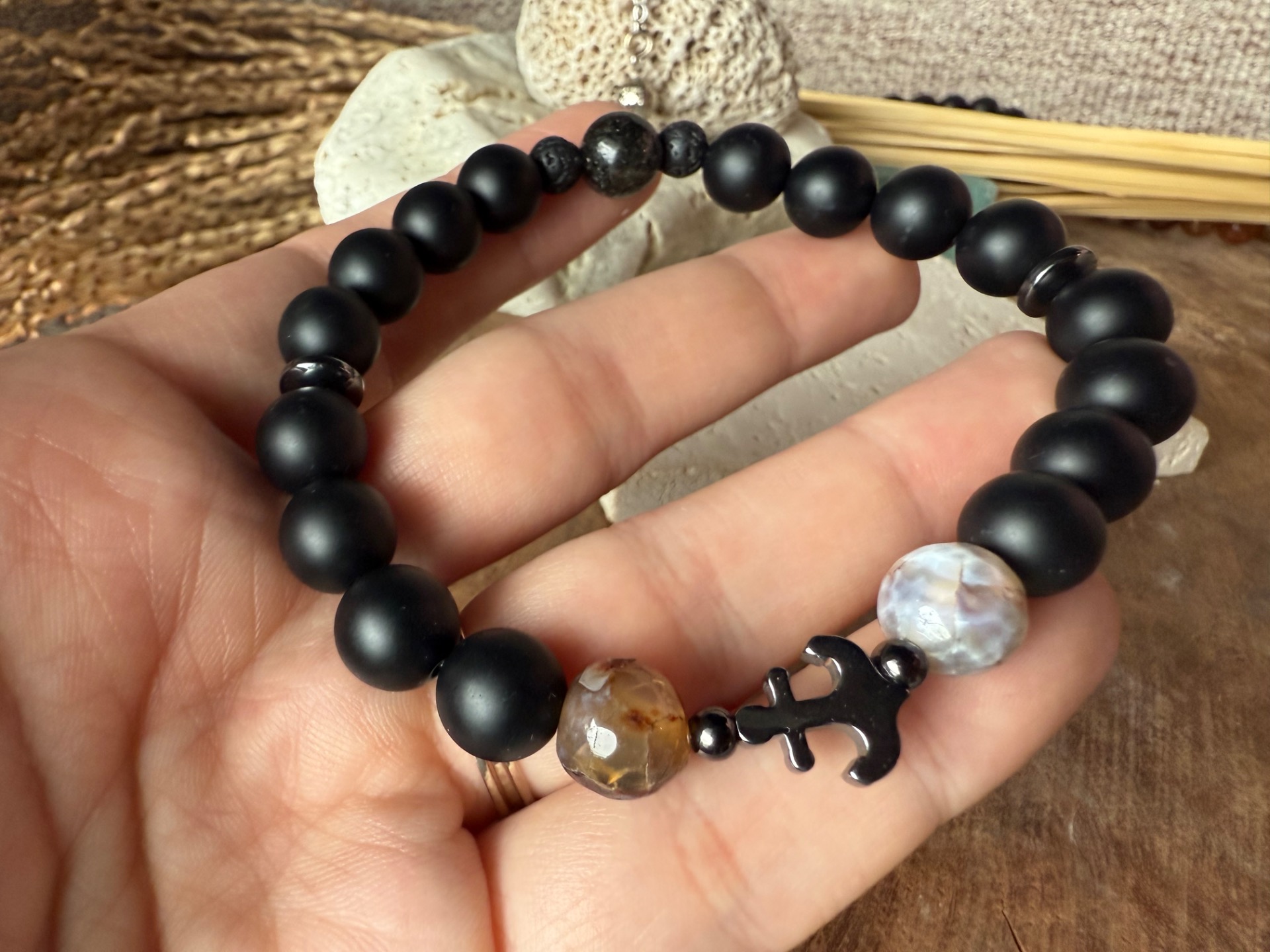 Silný a elegantný náramok, ktorý kombinuje matný a krajkový achát s prírodnou lávou, aby podporil stabilitu, vnútornú rovnováhu a odolnosť. Vpredu zdobí náramok čierna kotva, symbol sily, istoty a pevného ukotvenia.