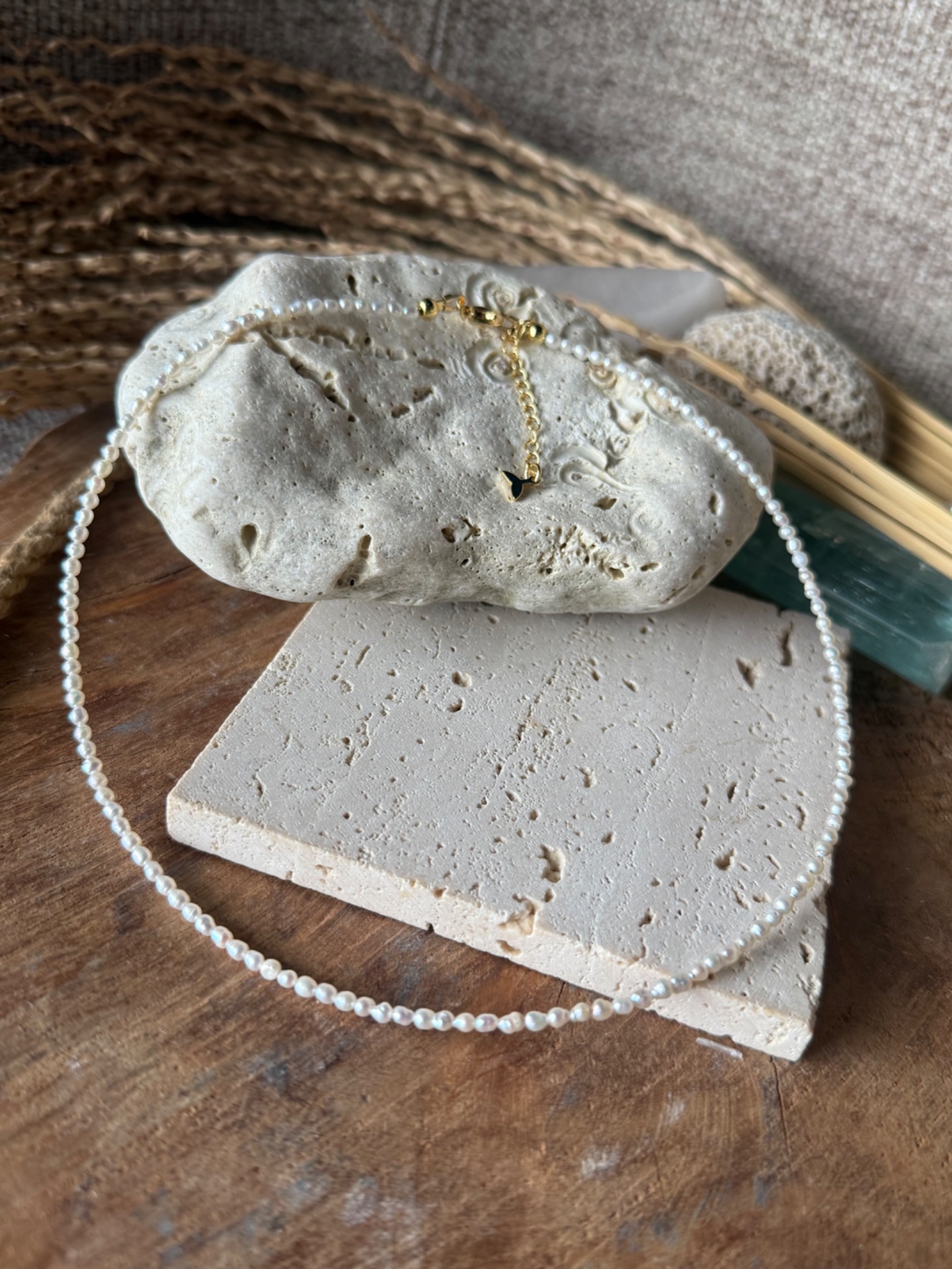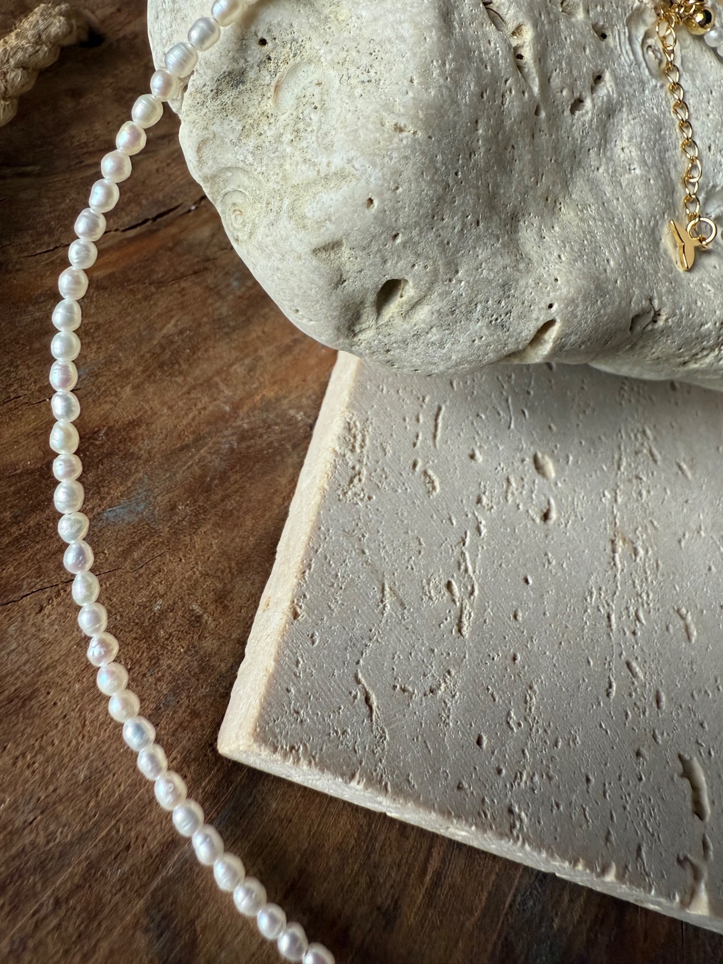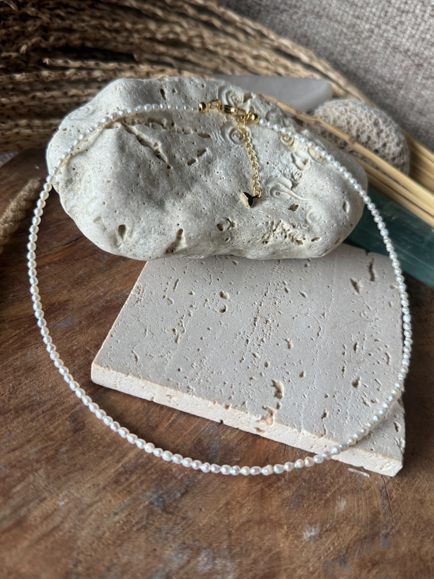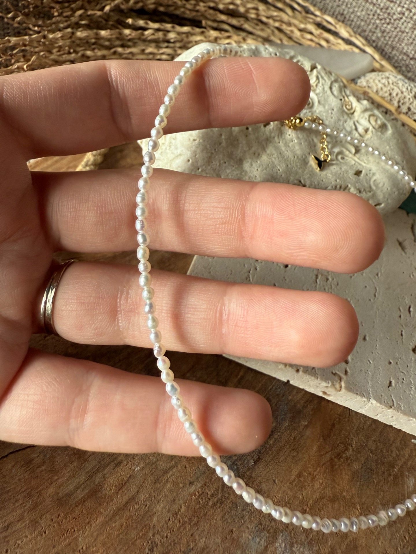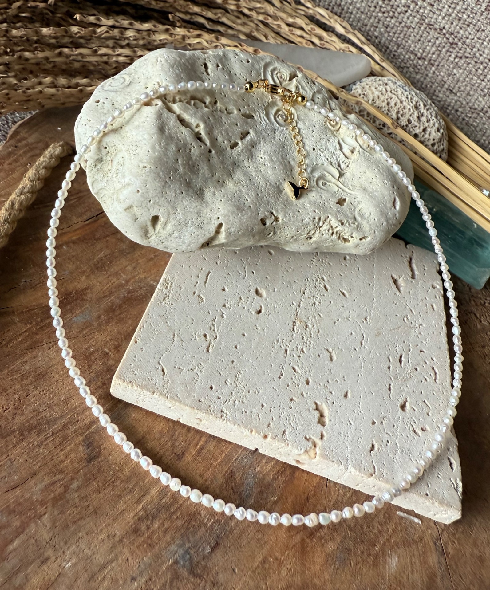 Jemný, nežný a nadčasový náhrdelník z mini riečnych perál, ktorý pôsobí prirodzene a žensky. Drobné perly s veľkosťou 2–3 mm krásne splývajú s pokožkou a dodávajú outfitu čistú eleganciu . Ideálny na každodenné nosenie aj na vrstvenie s ďalšími náhrdelníkmi.