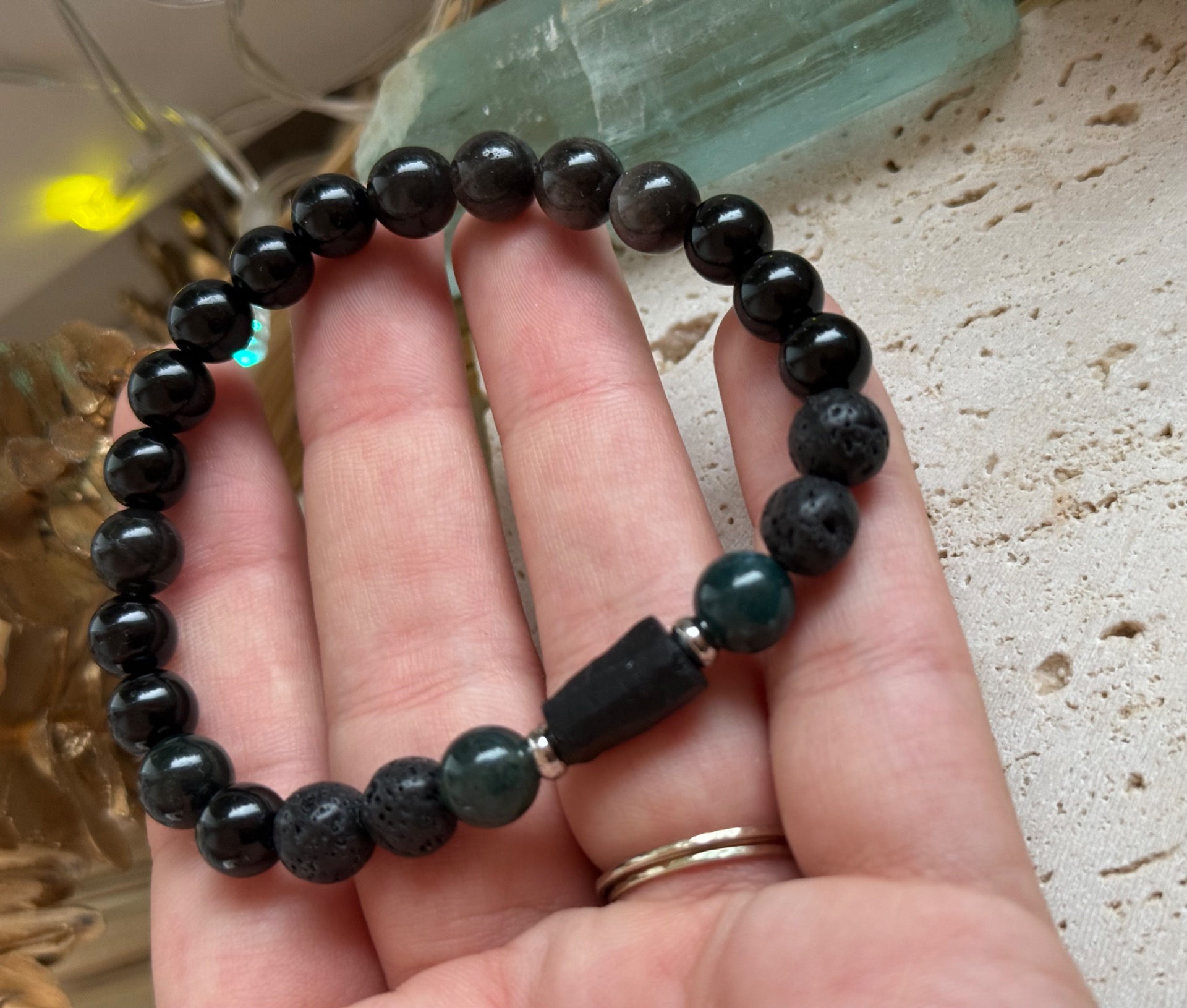 Minimalistický, no výrazný pánsky náramok spájajúci energiu štyroch silných minerálov. Ónyx, láva, achát a surový turmalín vytvárajú harmonickú kombináciu ochrany, stability a uzemnenia. Dominantný surový turmalín dodáva náramku prirodzený, neopracovaný charakter a robí z každého kusu originál.