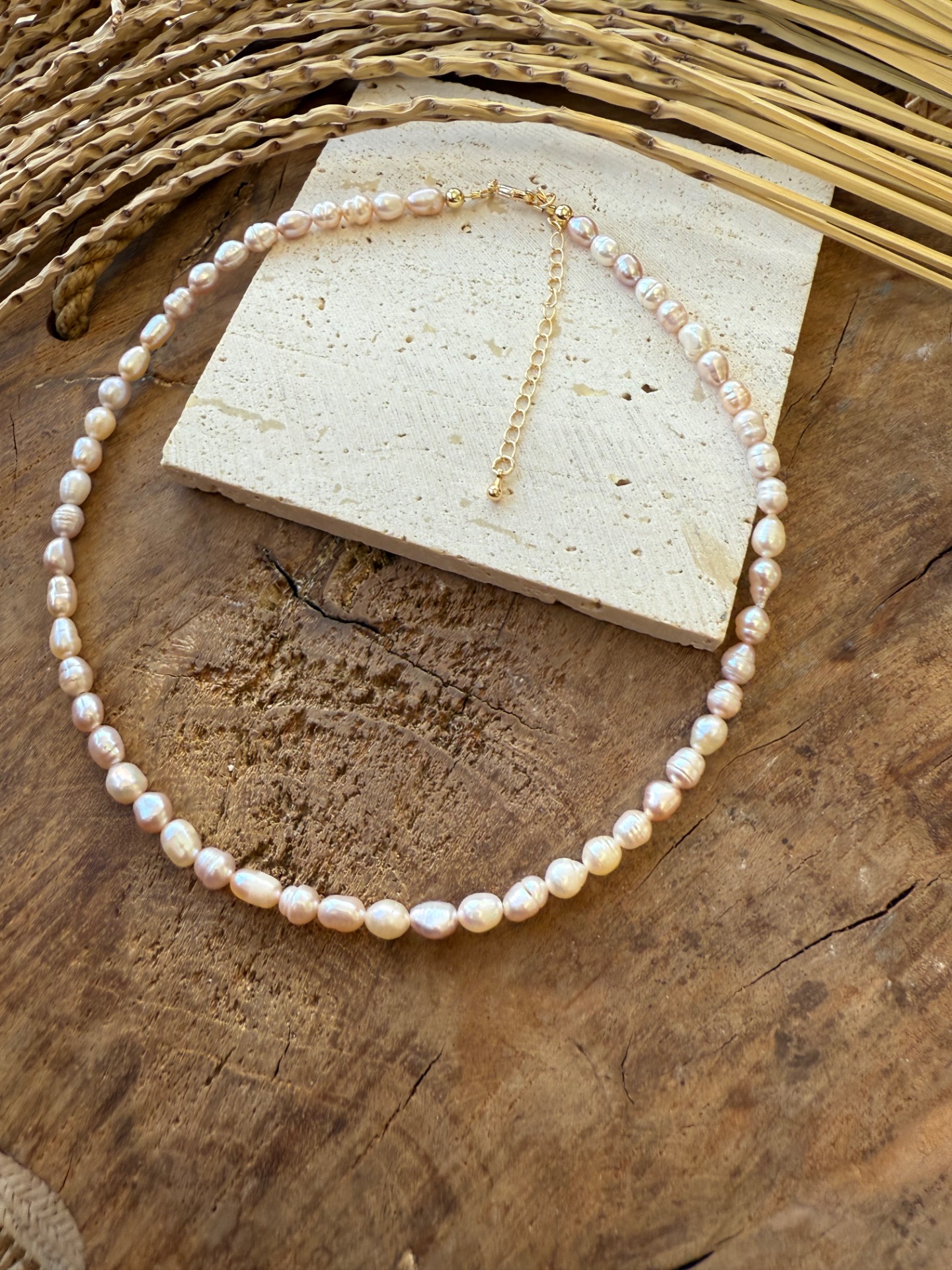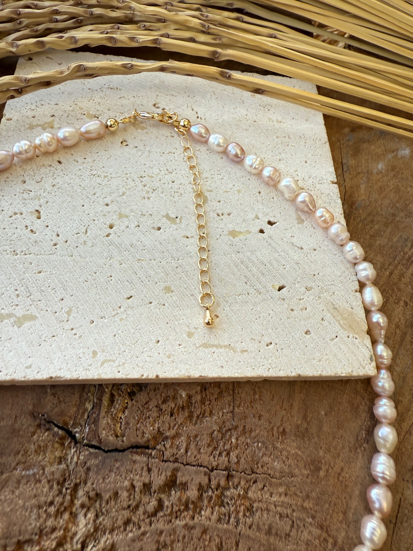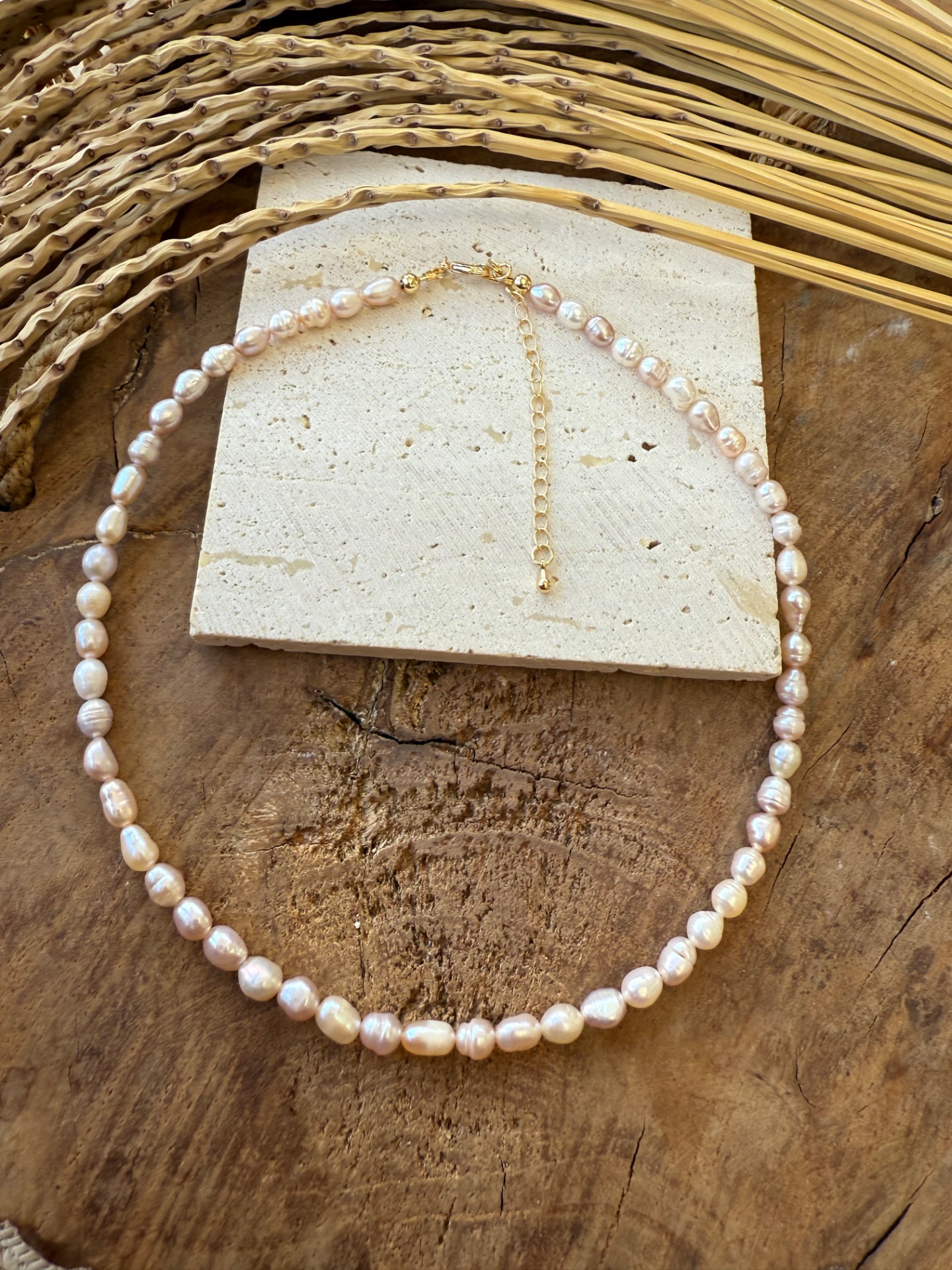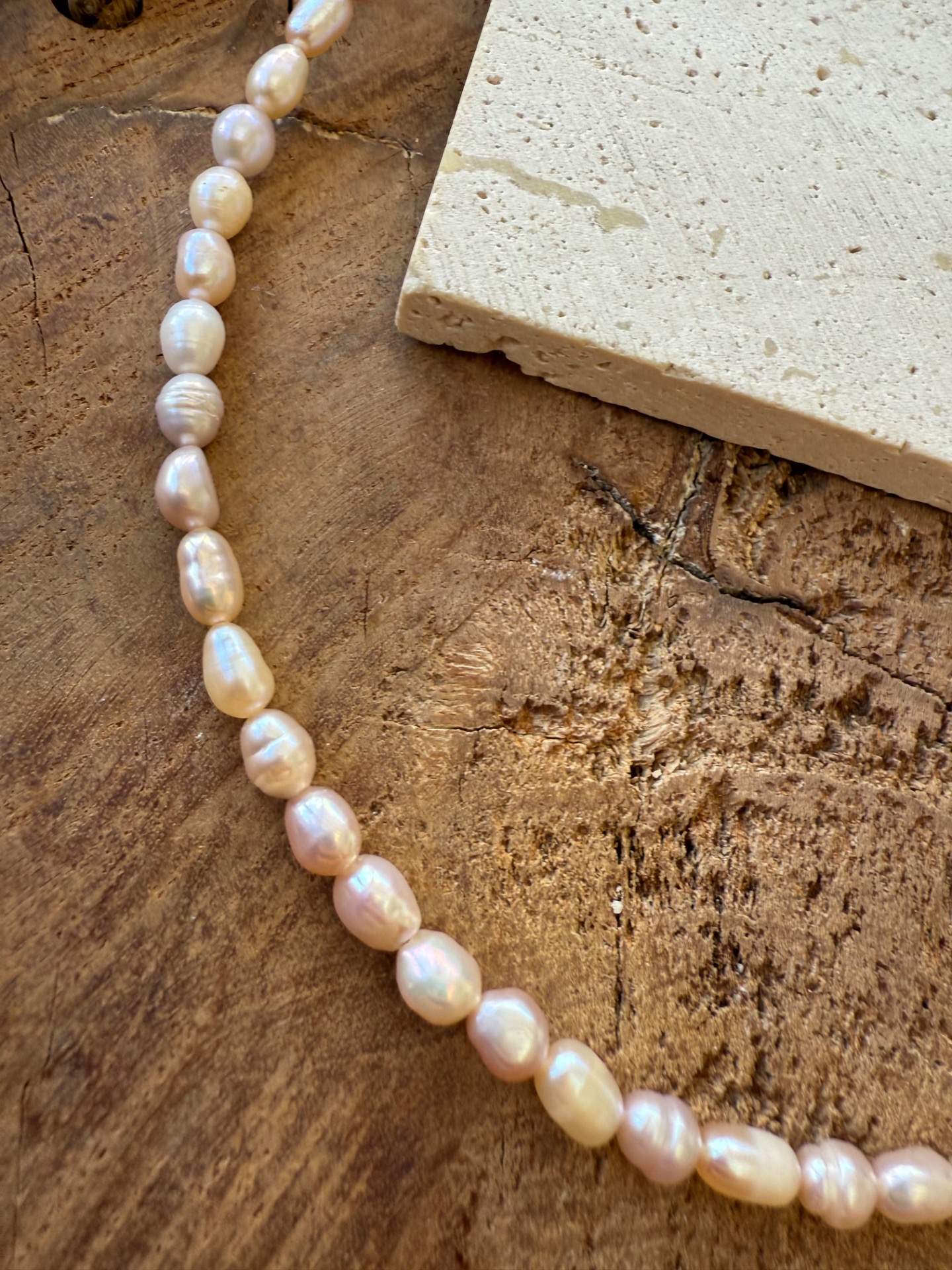 Tento náhrdelník je oslavou prírodnej krásy, nežnosti a jemnej elegancie. Každá perla je jedinečná, nepravidelného oválneho tvaru a nesie v sebe jemný marhuľovo-ružový nádych, ktorý pôsobí harmonicky a ženským spôsobom.