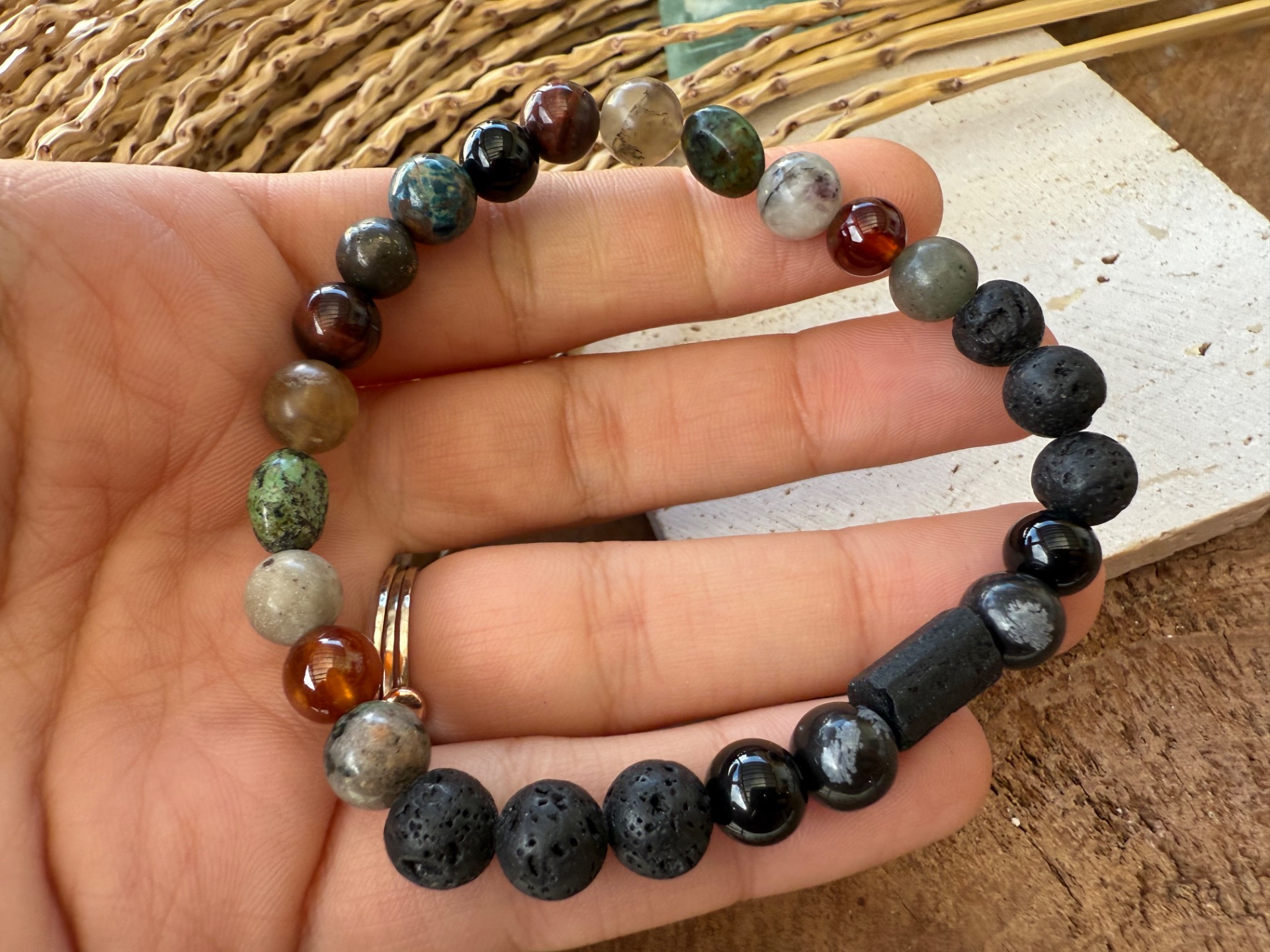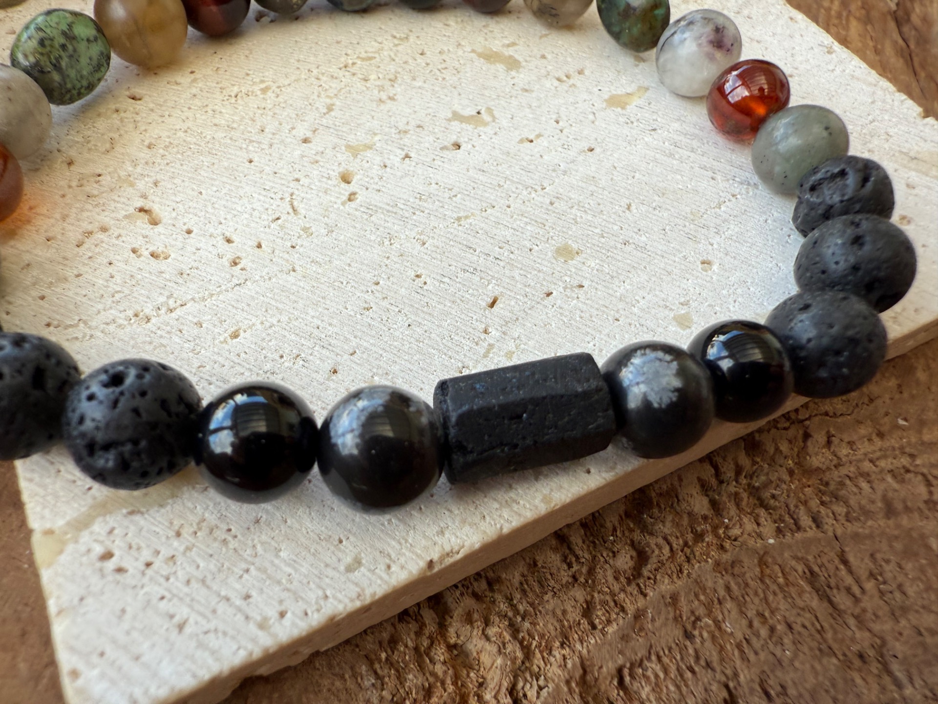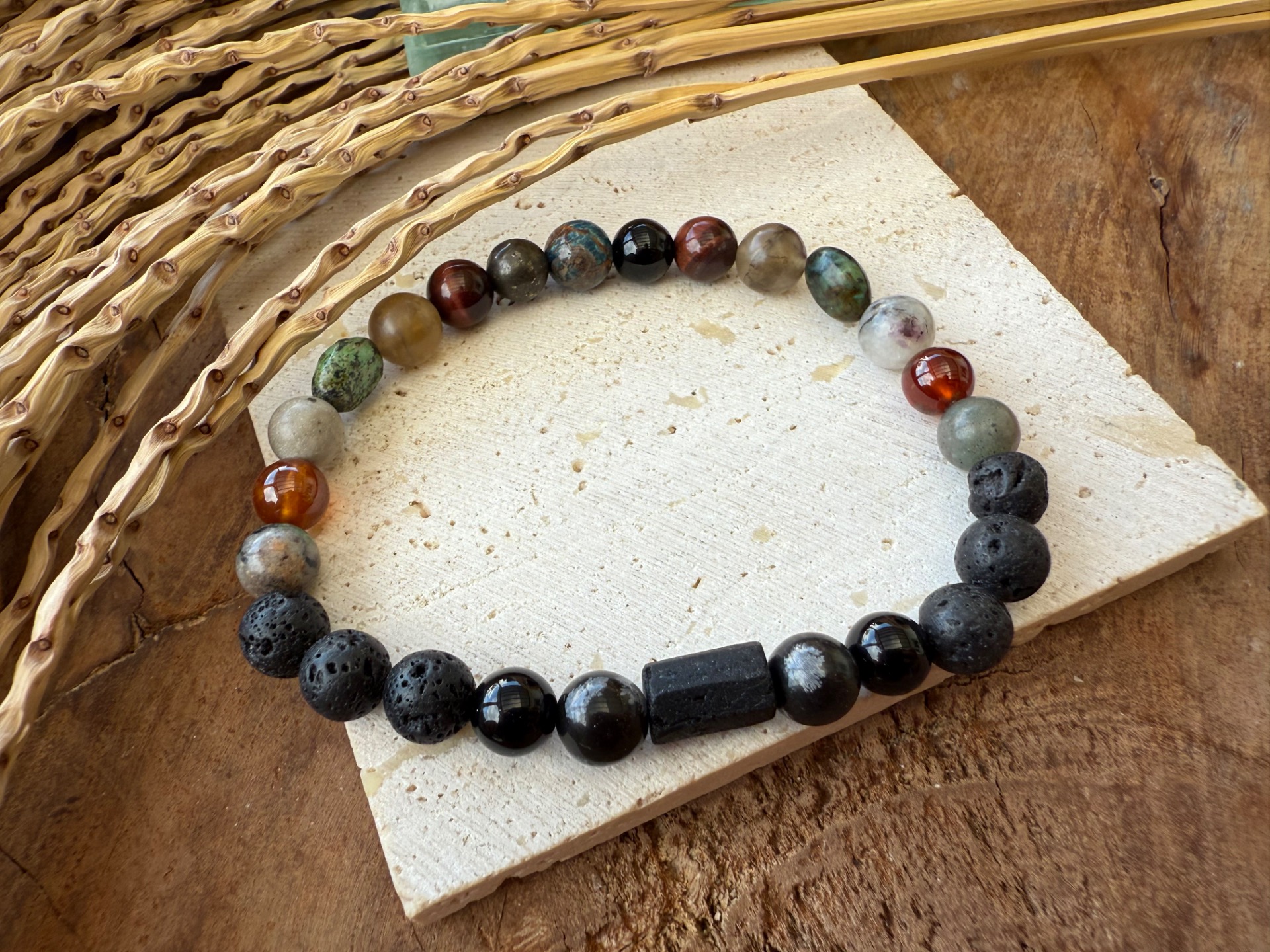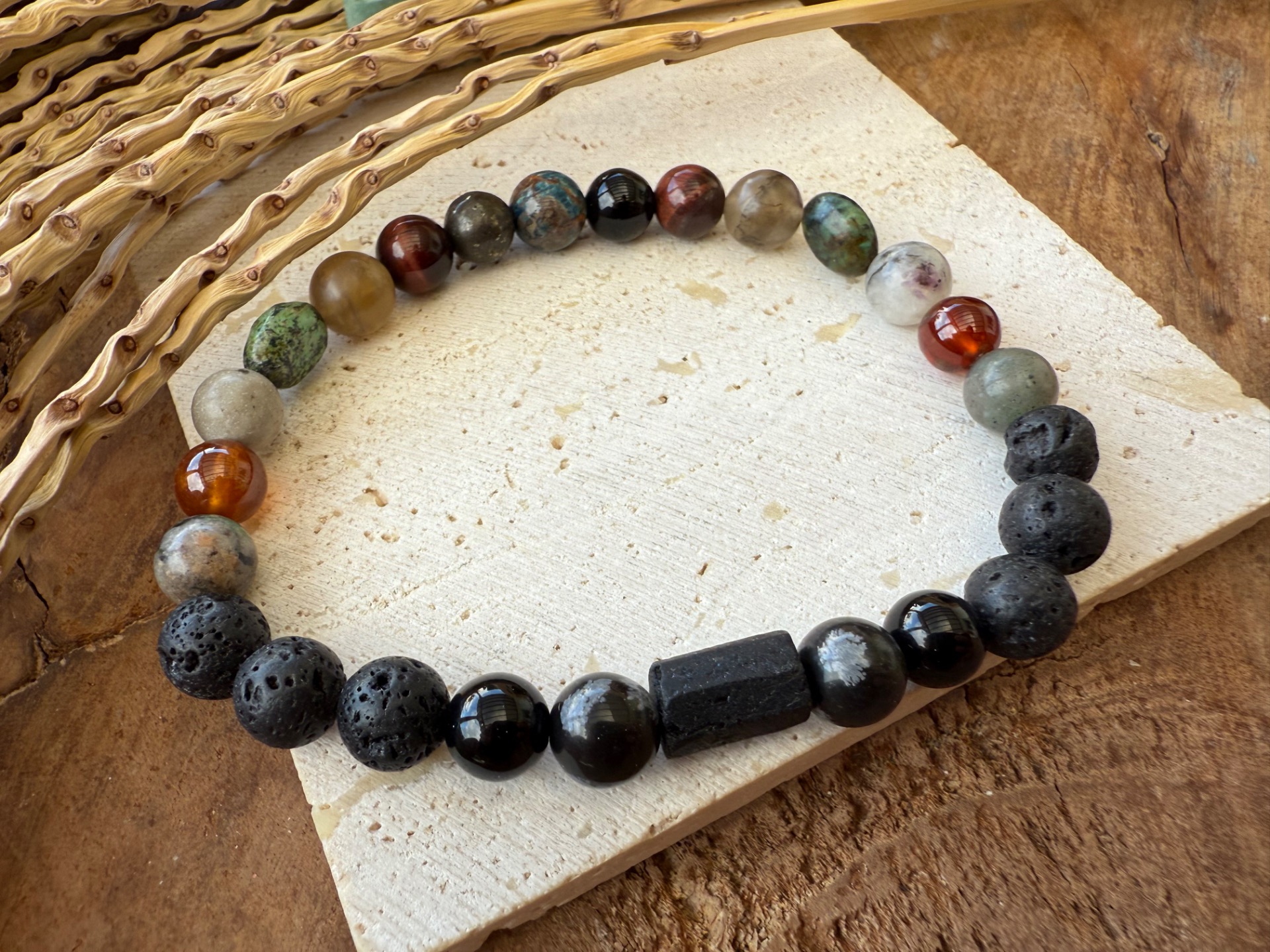 Tento náramok je spojením zeme, ohňa a odvahy. Je určený mužovi, ktorý hľadá vnútorný pokoj, sebadôveru a jasný smer. Kombinácia surového turmalínu a zemitých kameňov vytvára silné ochranné pole, zatiaľ čo teplé tóny karneolu a býčieho oka dodávajú energiu a vášeň pre život.