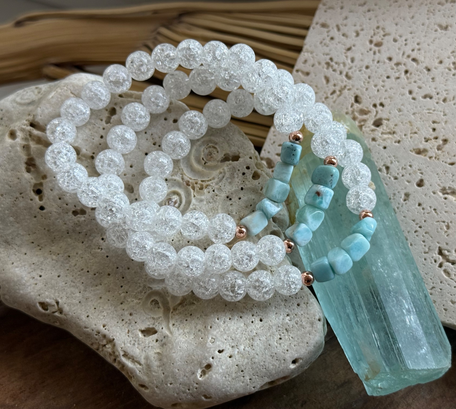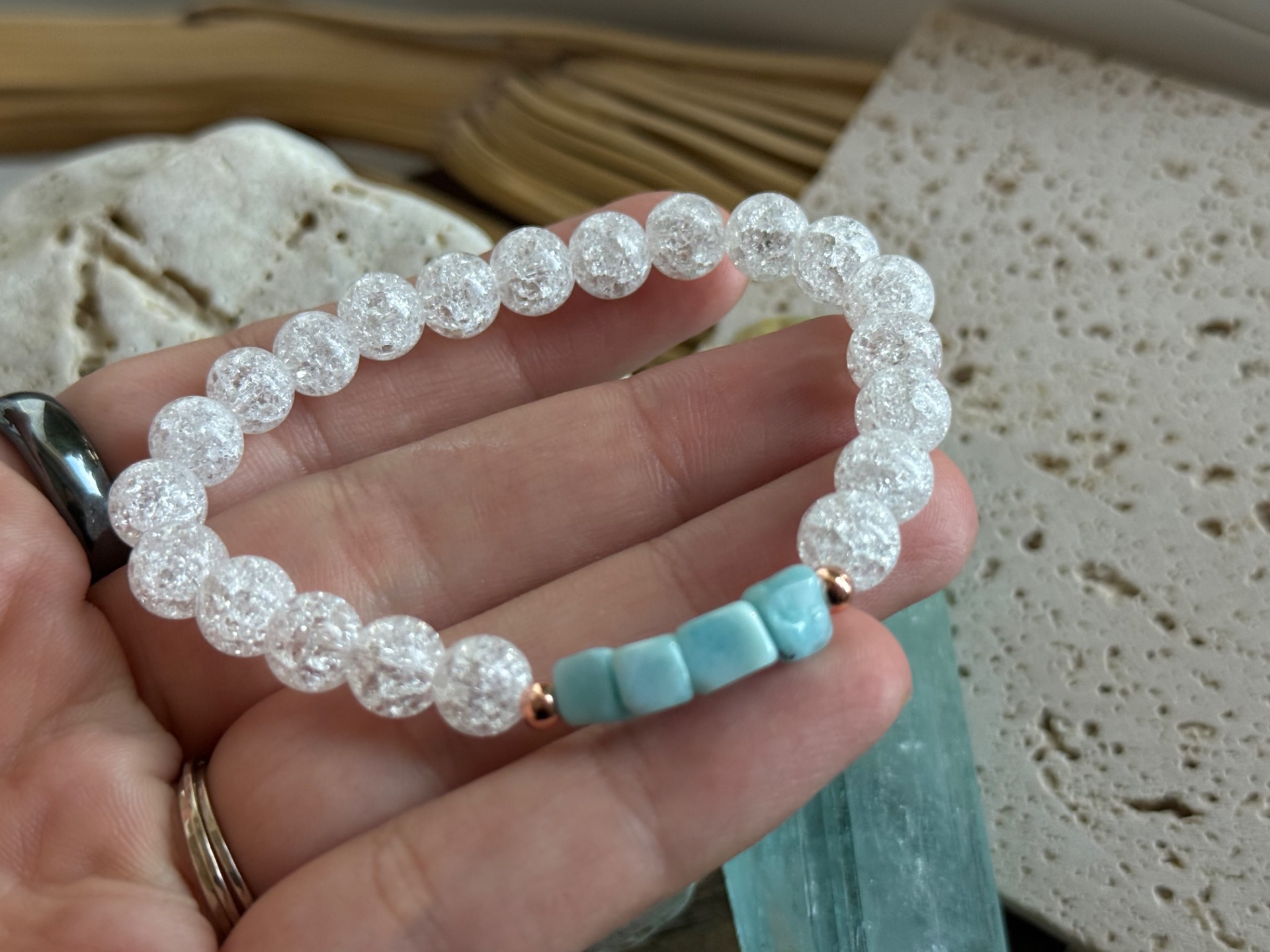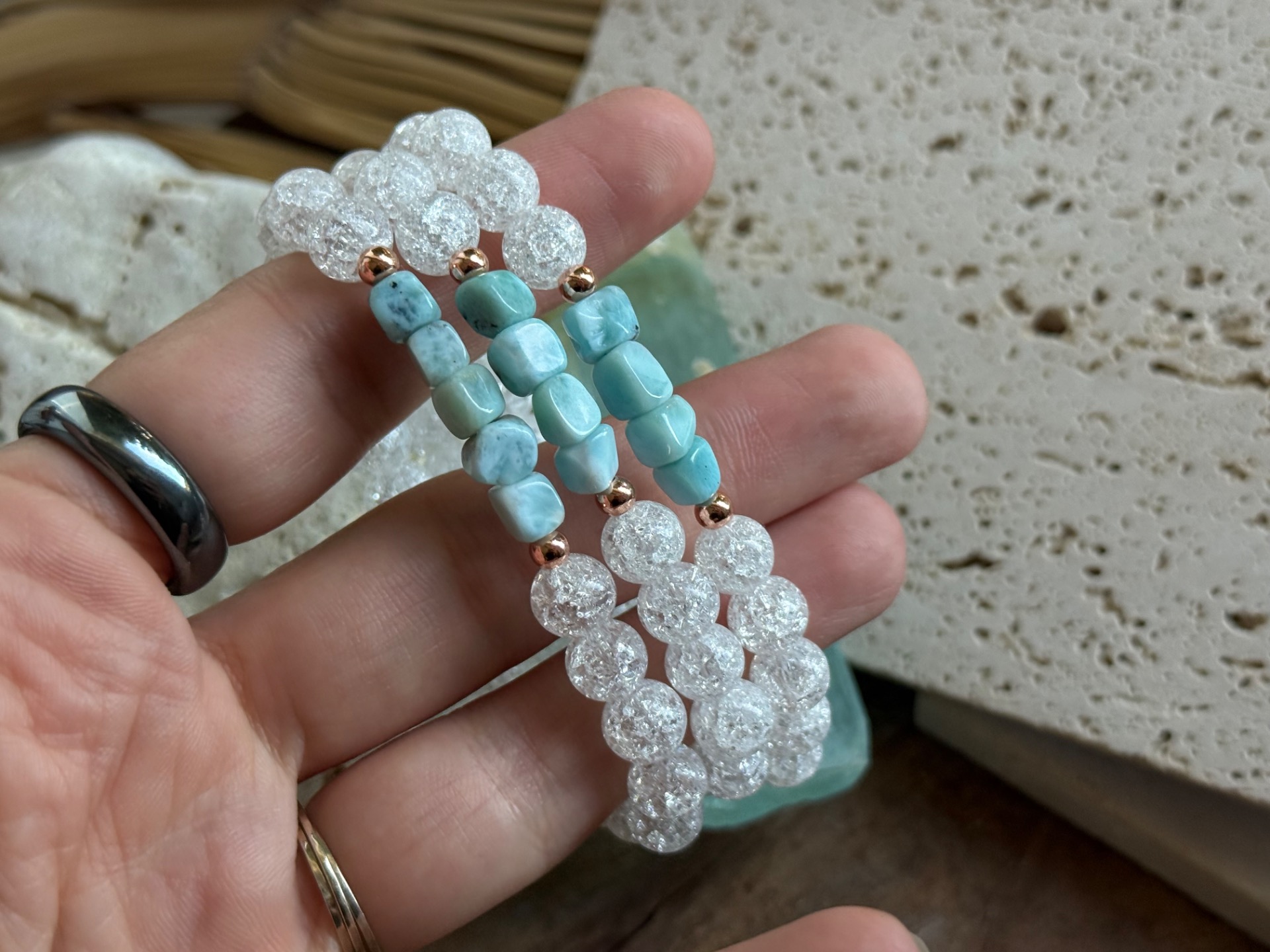 "Odpustenie" je ručne vyrobený náramok z praskaného krištáľu a larimaru – dvoch minerálov, ktoré spoločne otvárajú srdce, čistia vnútorný priestor a pomáhajú zjemniť všetko, čo ešte bolí.