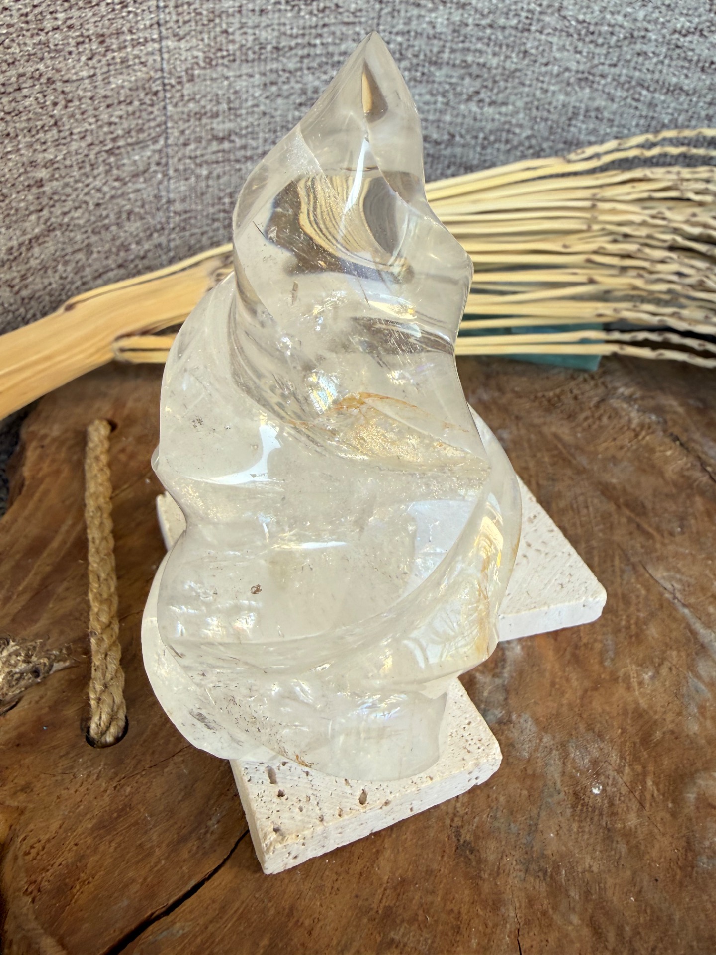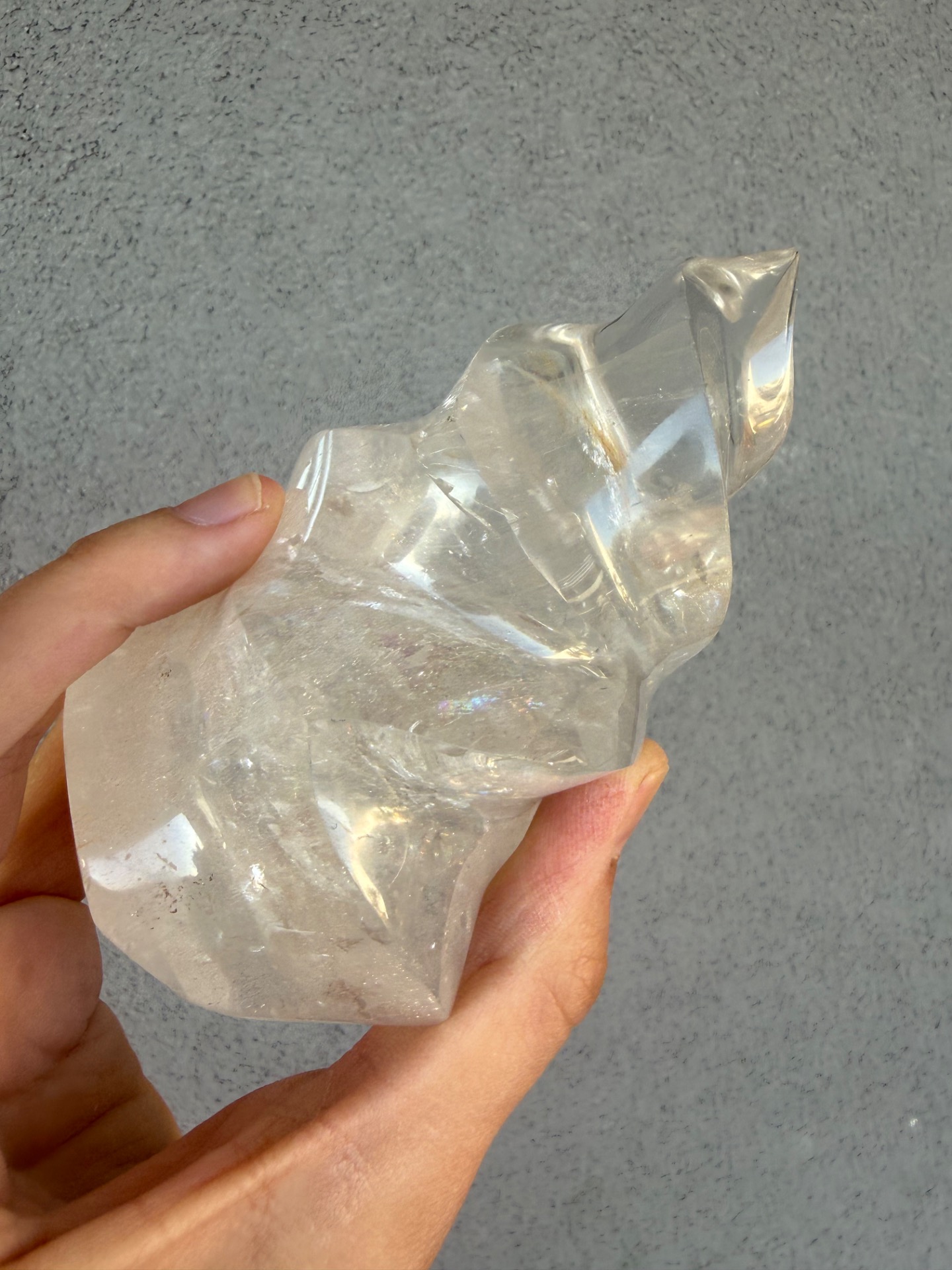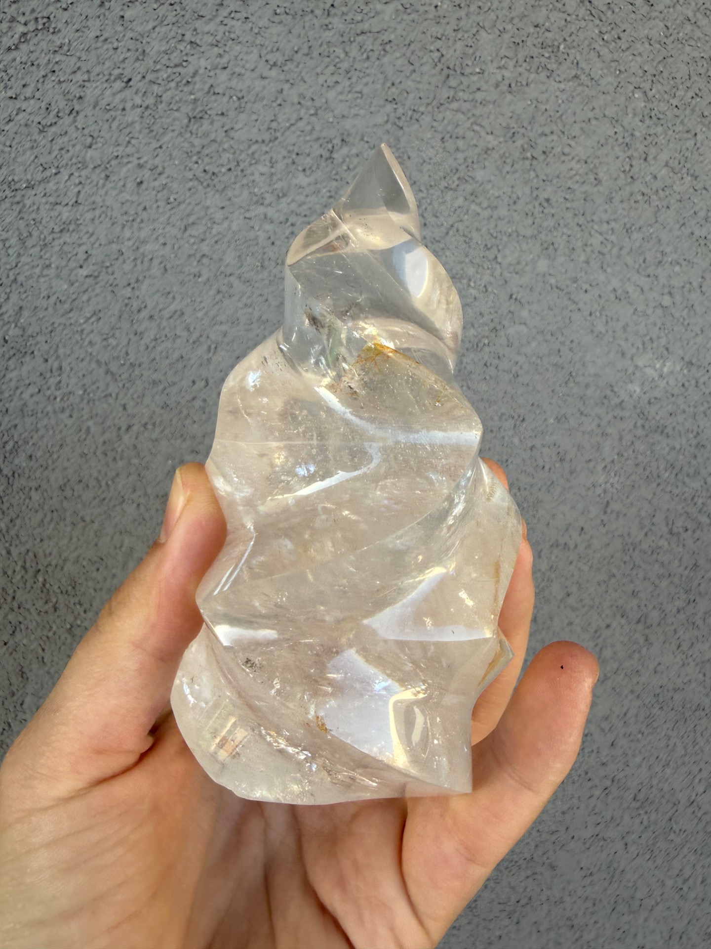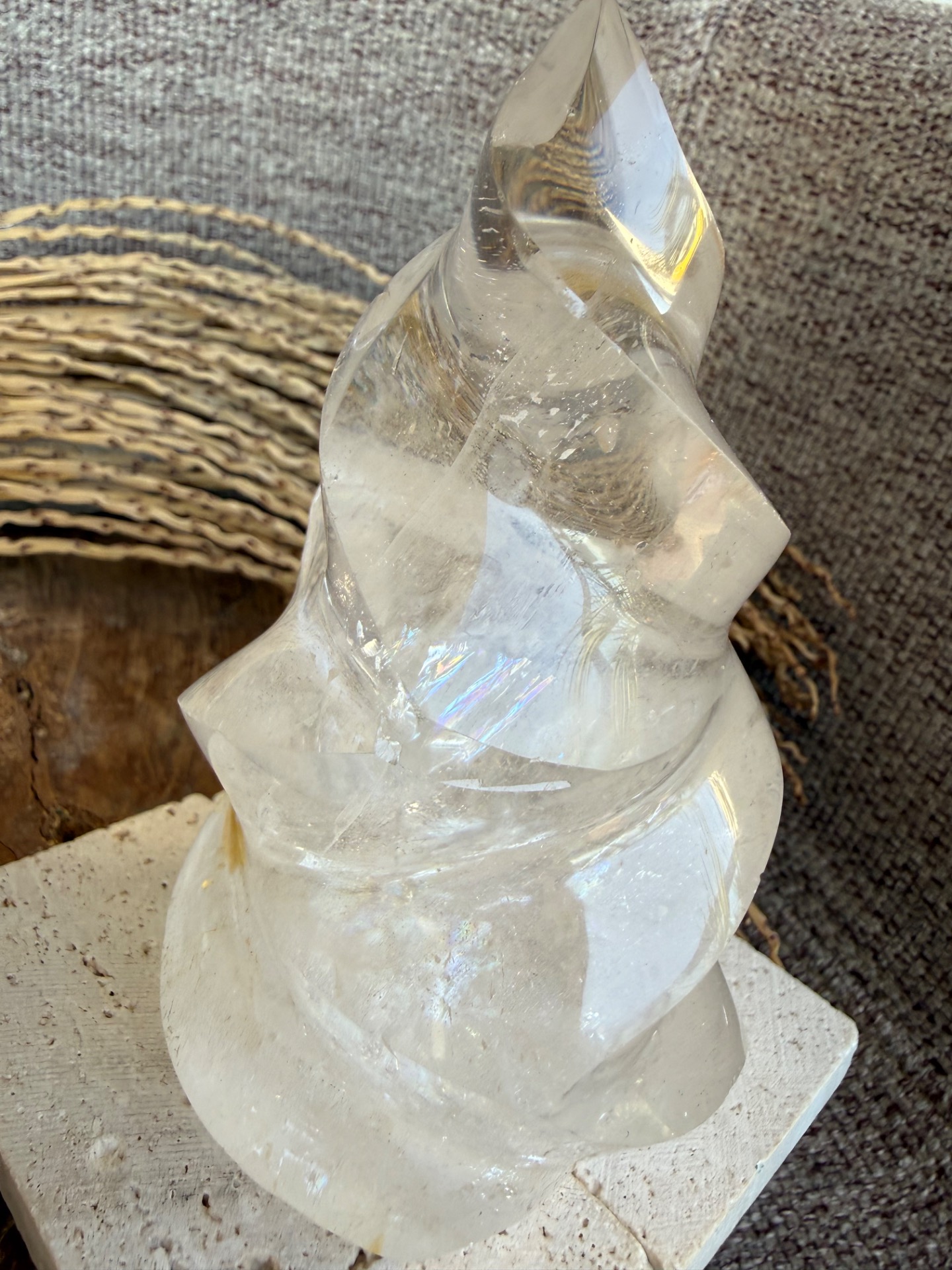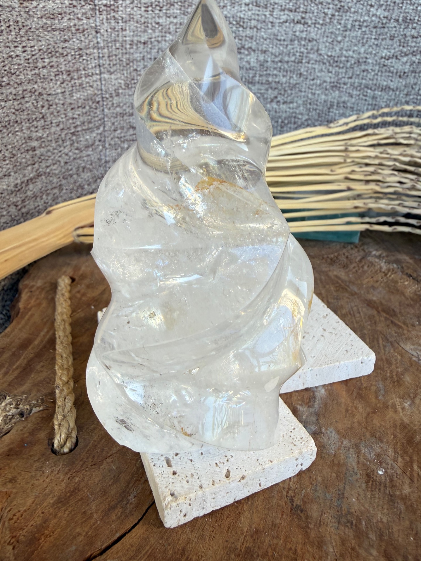 Tento nádherný horský krištáľ z Madagaskaru je precízne vybrúsený do tvaru plameňa, ktorý symbolicky pripomína neustále sa meniacu, živú energiu svetla. Ide o výnimočný, čistý a výrazný kúsok, ktorý v priestore pôsobí ako silný energetický bod.