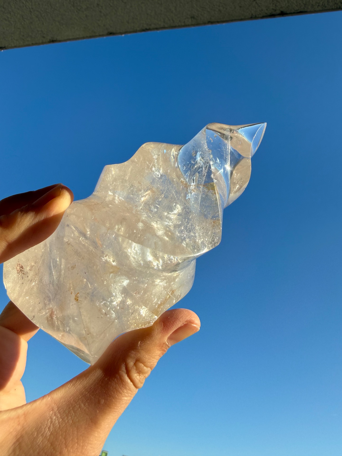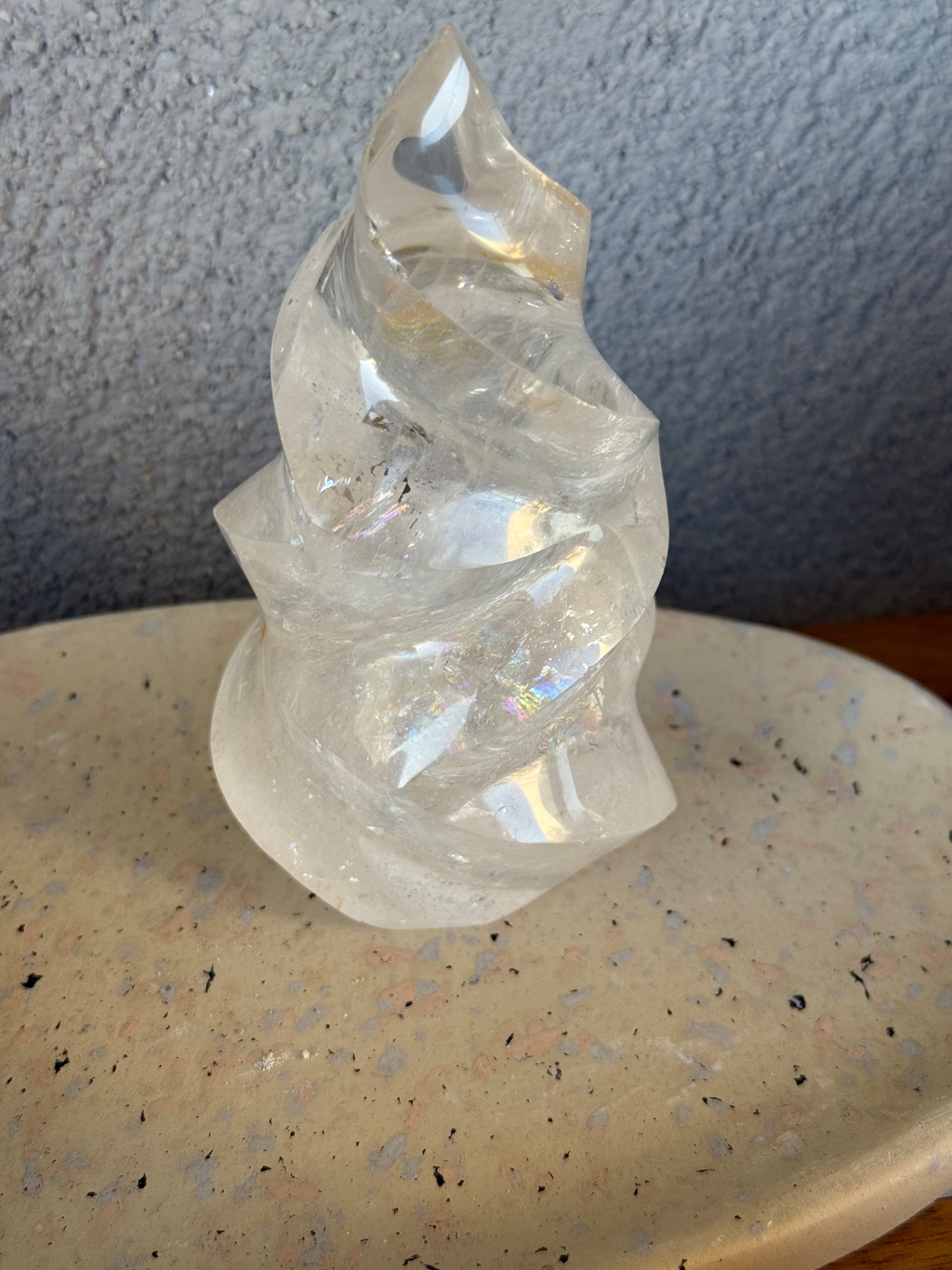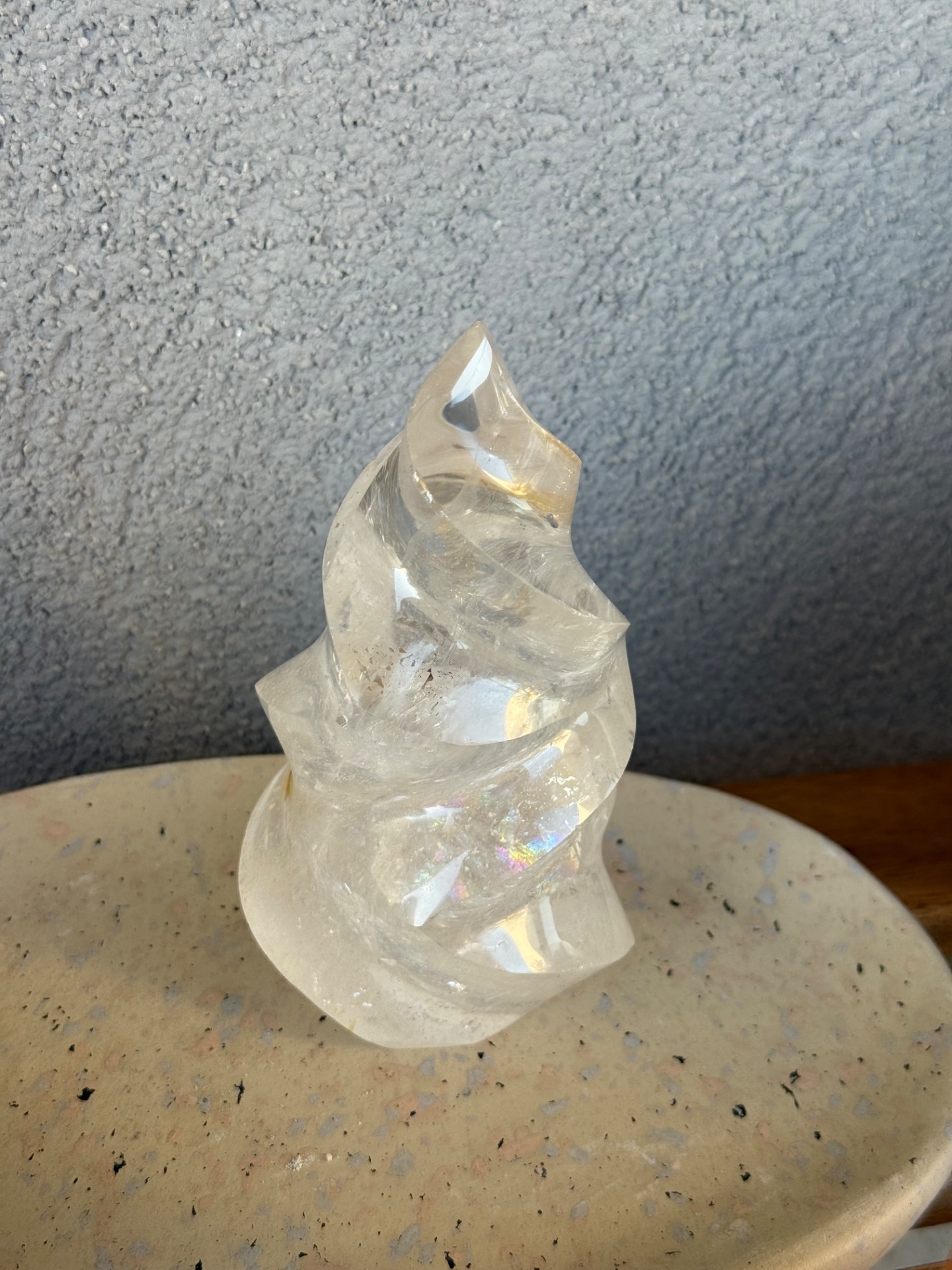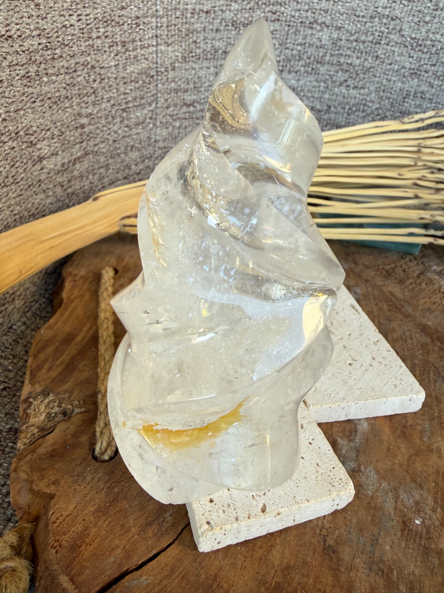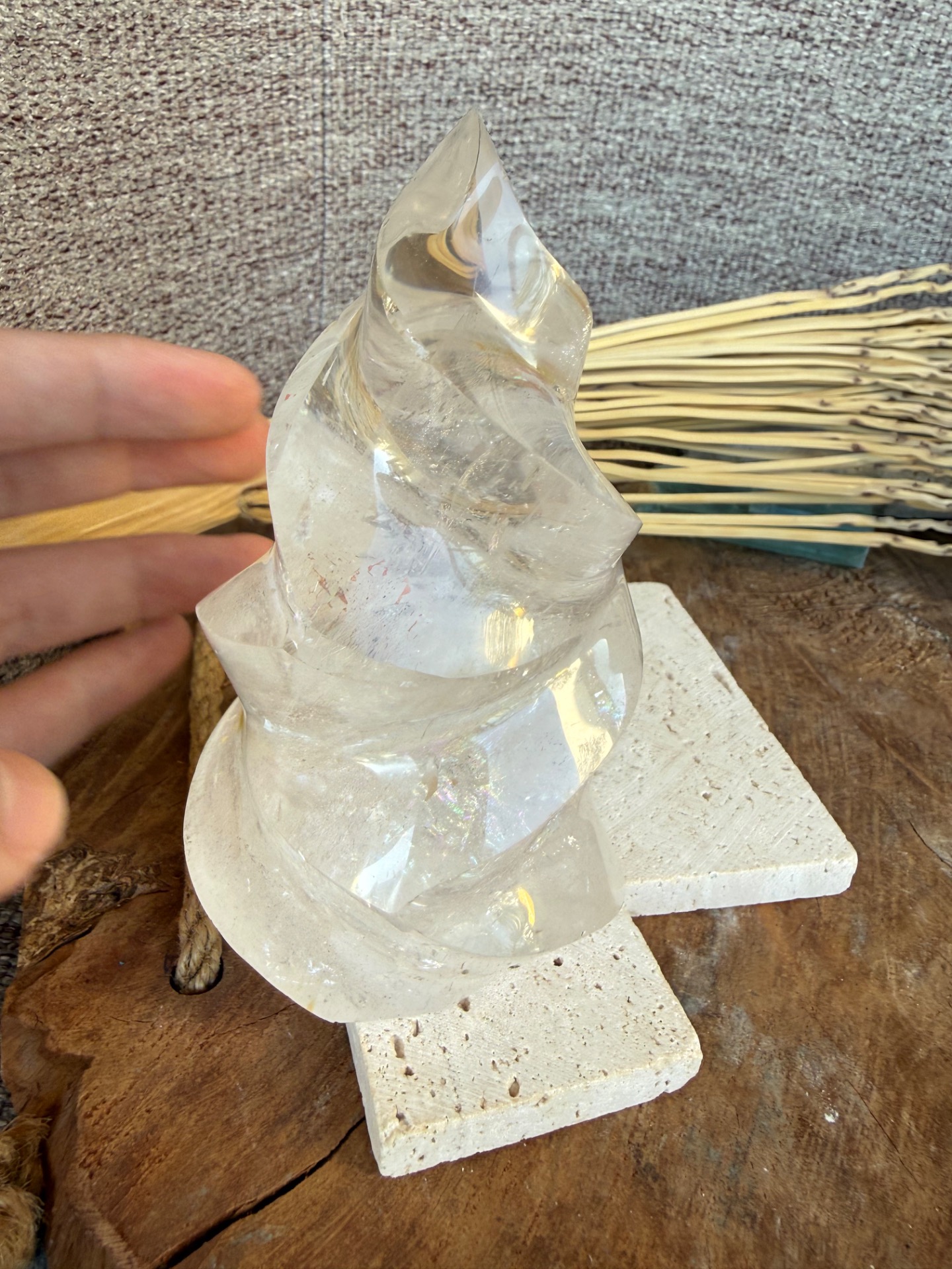 Tento nádherný horský krištáľ z Madagaskaru je precízne vybrúsený do tvaru plameňa, ktorý symbolicky pripomína neustále sa meniacu, živú energiu svetla. Ide o výnimočný, čistý a výrazný kúsok, ktorý v priestore pôsobí ako silný energetický bod.