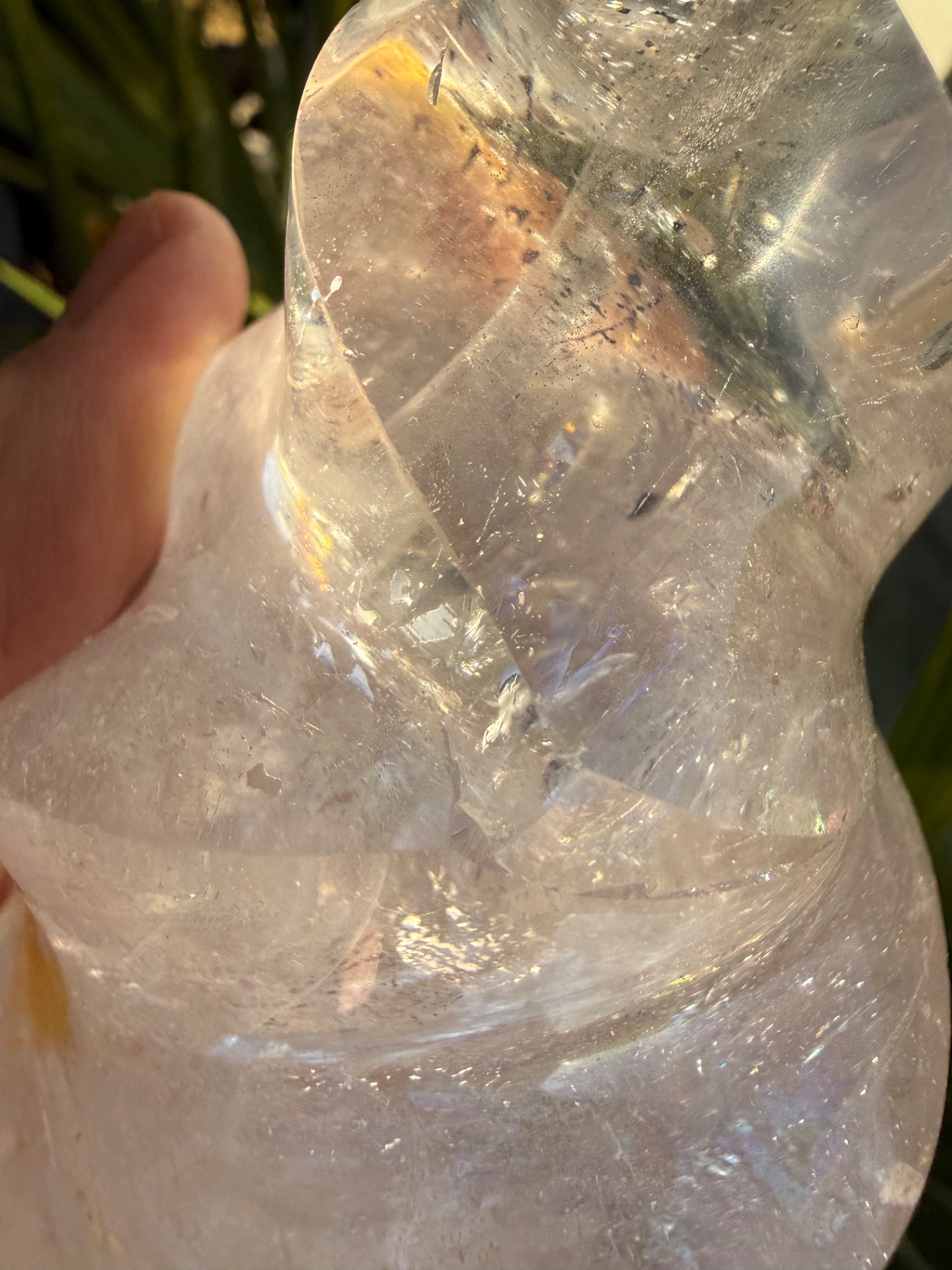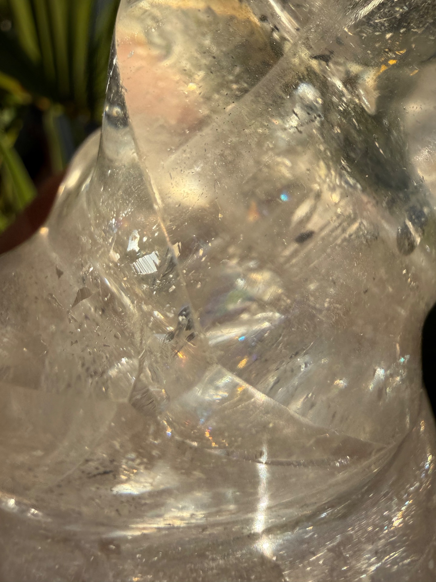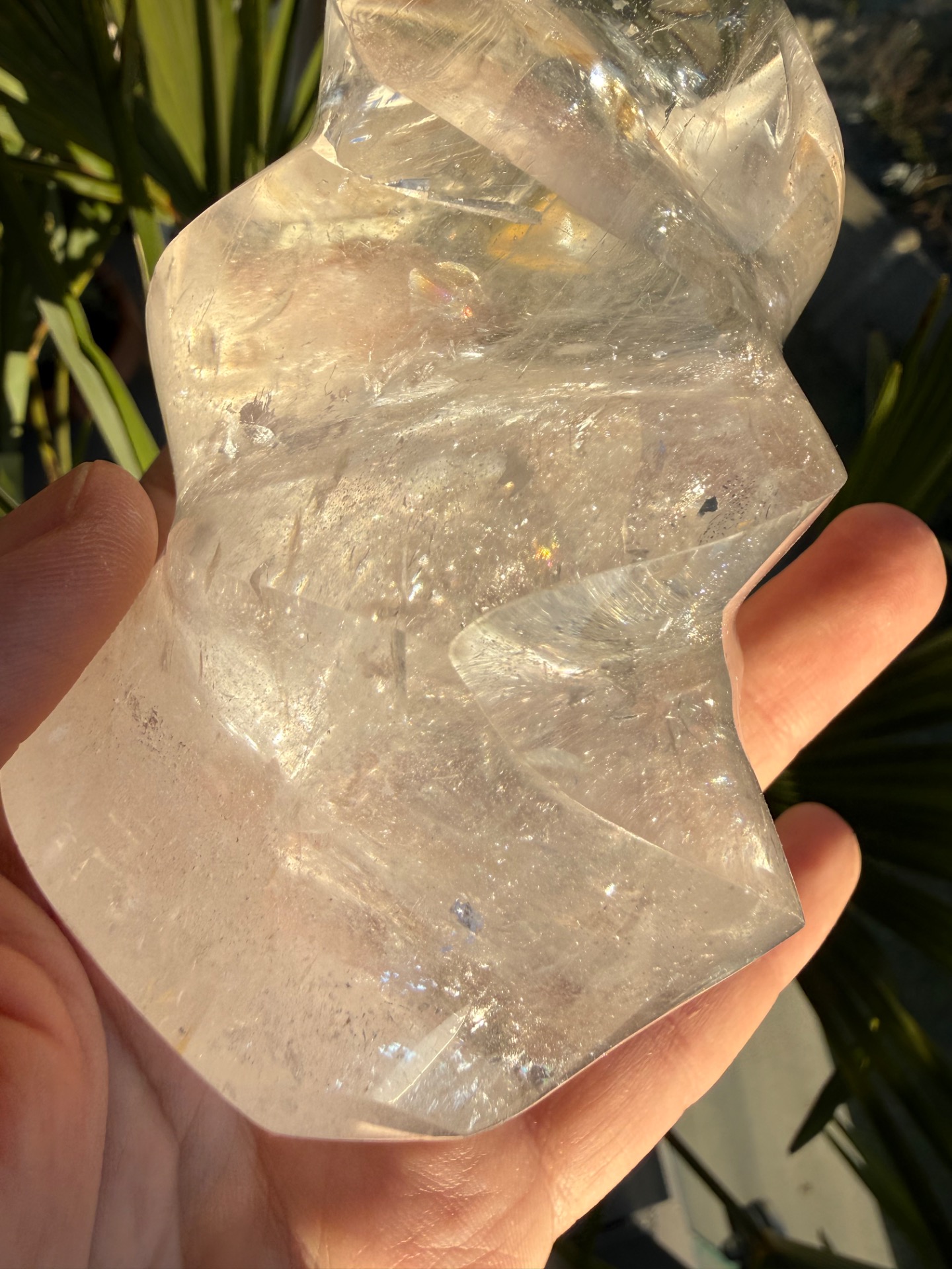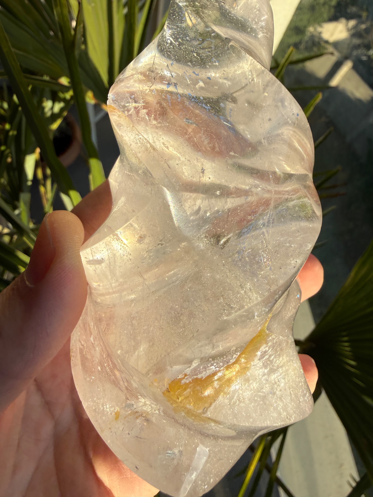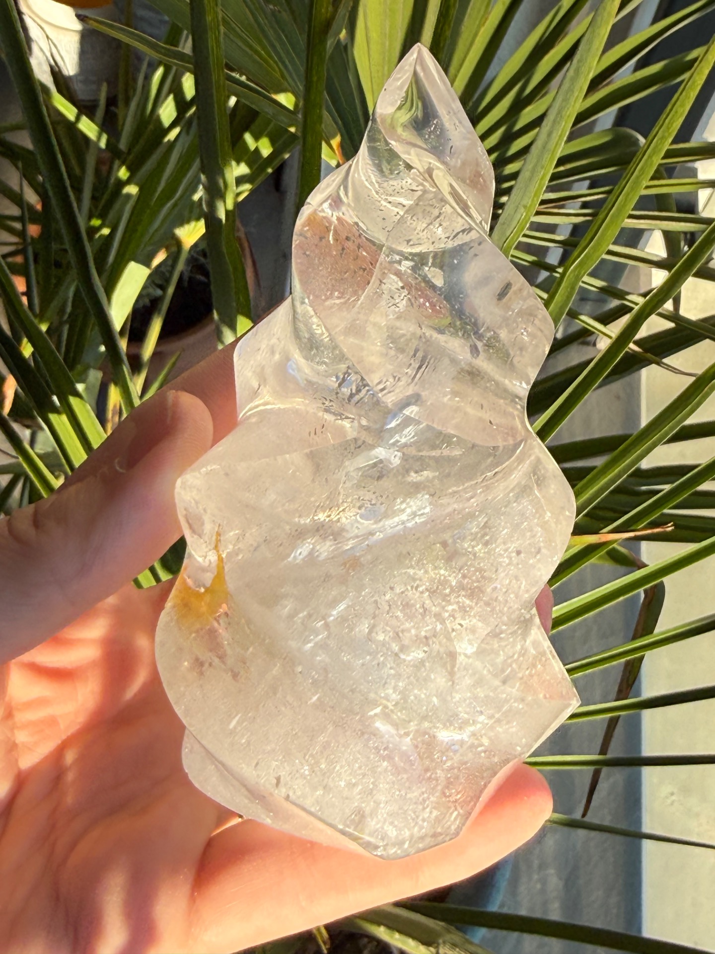 Tento nádherný horský krištáľ z Madagaskaru je precízne vybrúsený do tvaru plameňa, ktorý symbolicky pripomína neustále sa meniacu, živú energiu svetla. Ide o výnimočný, čistý a výrazný kúsok, ktorý v priestore pôsobí ako silný energetický bod.