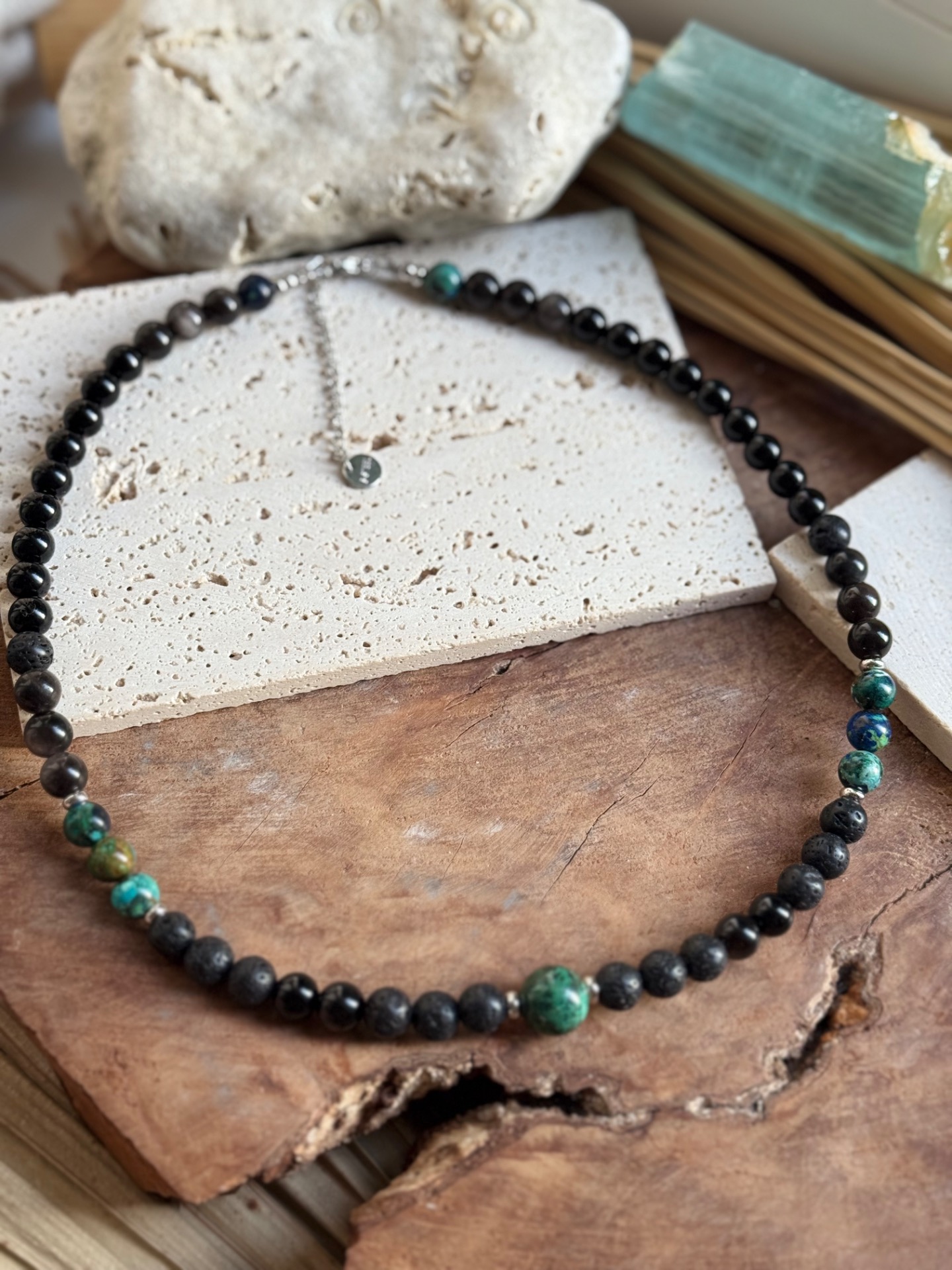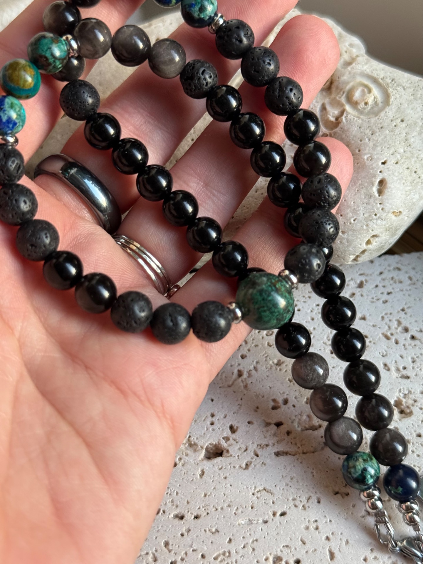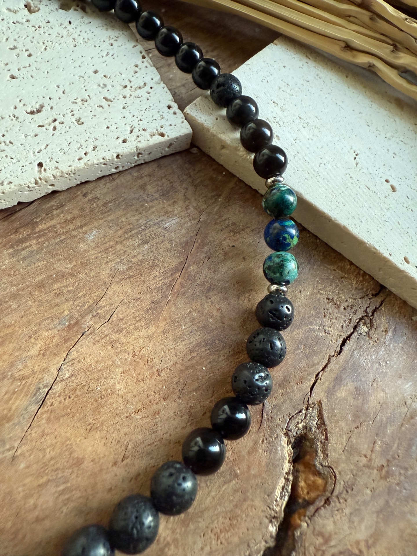 "Hlboká transformácia" – pánsky náhrdelník z azuritomalachitu, lávy, obsidiánu a ónyxu (8 mm)