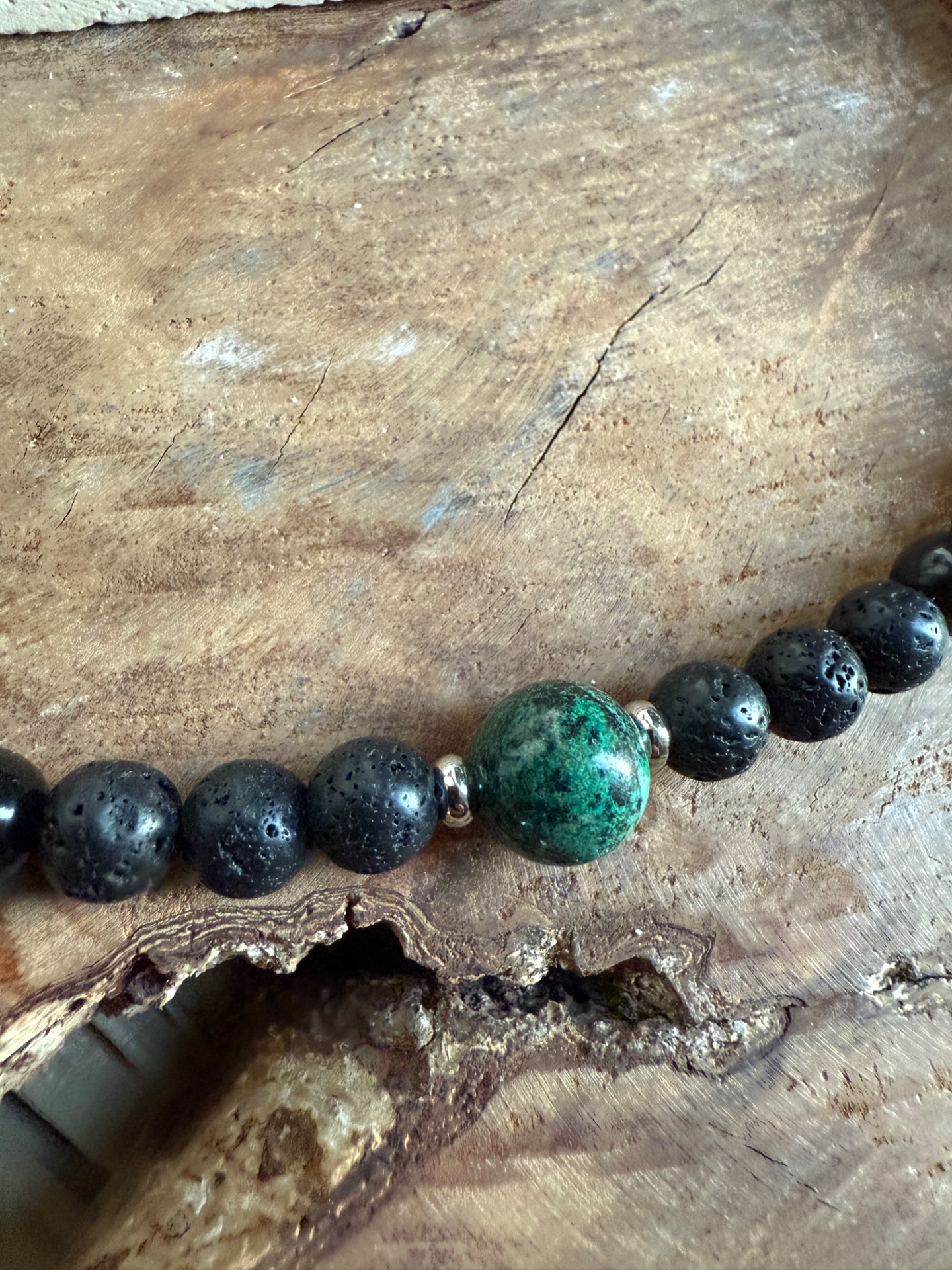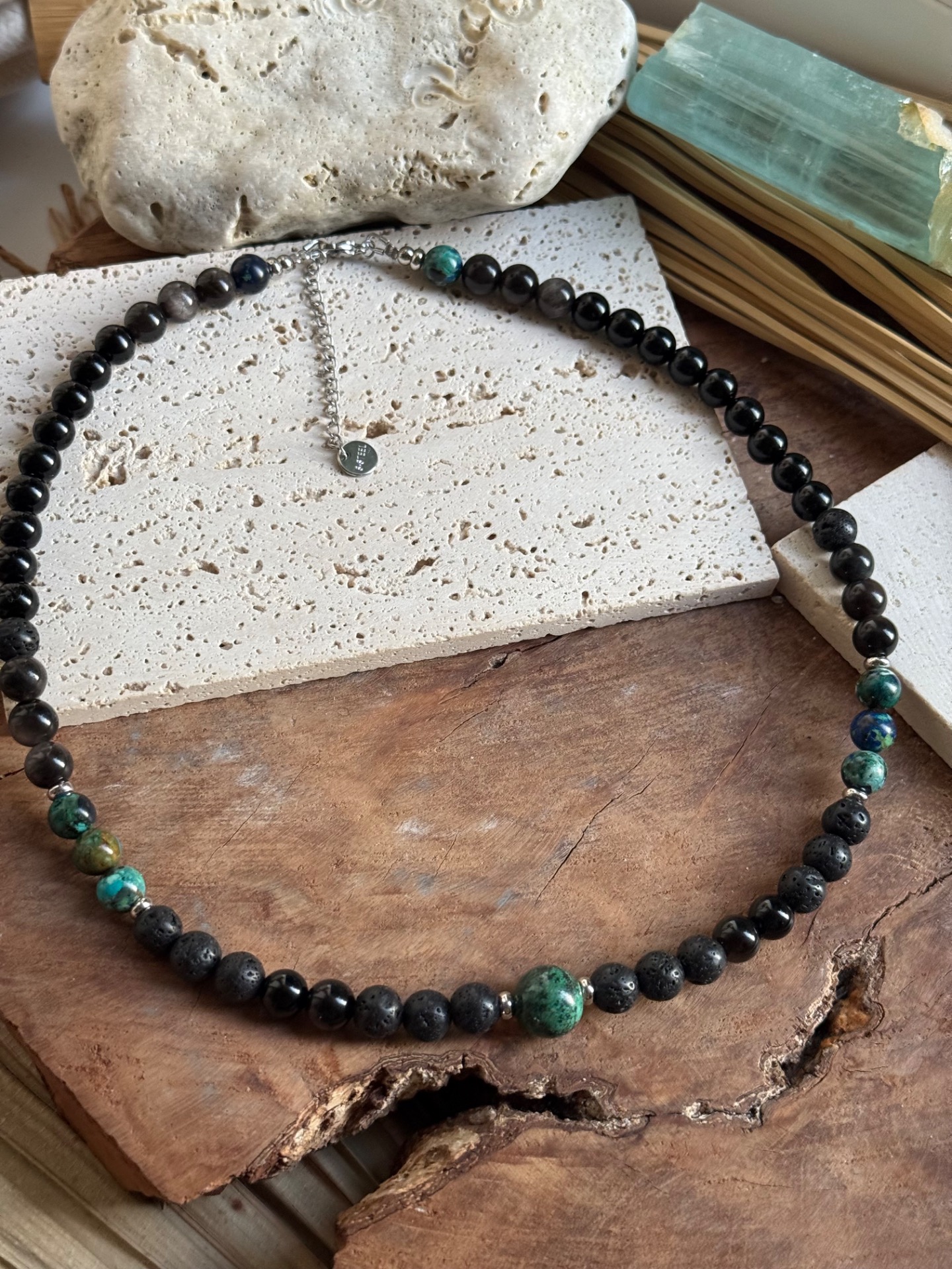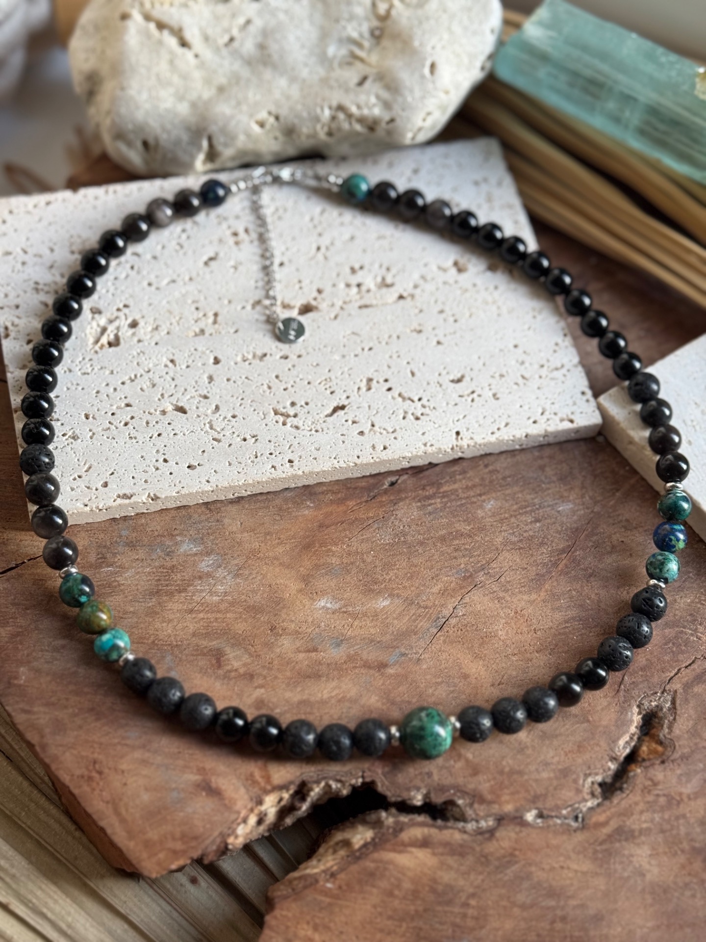 "Hlboká transformácia" – pánsky náhrdelník z azuritomalachitu, lávy, obsidiánu a ónyxu (8 mm)
