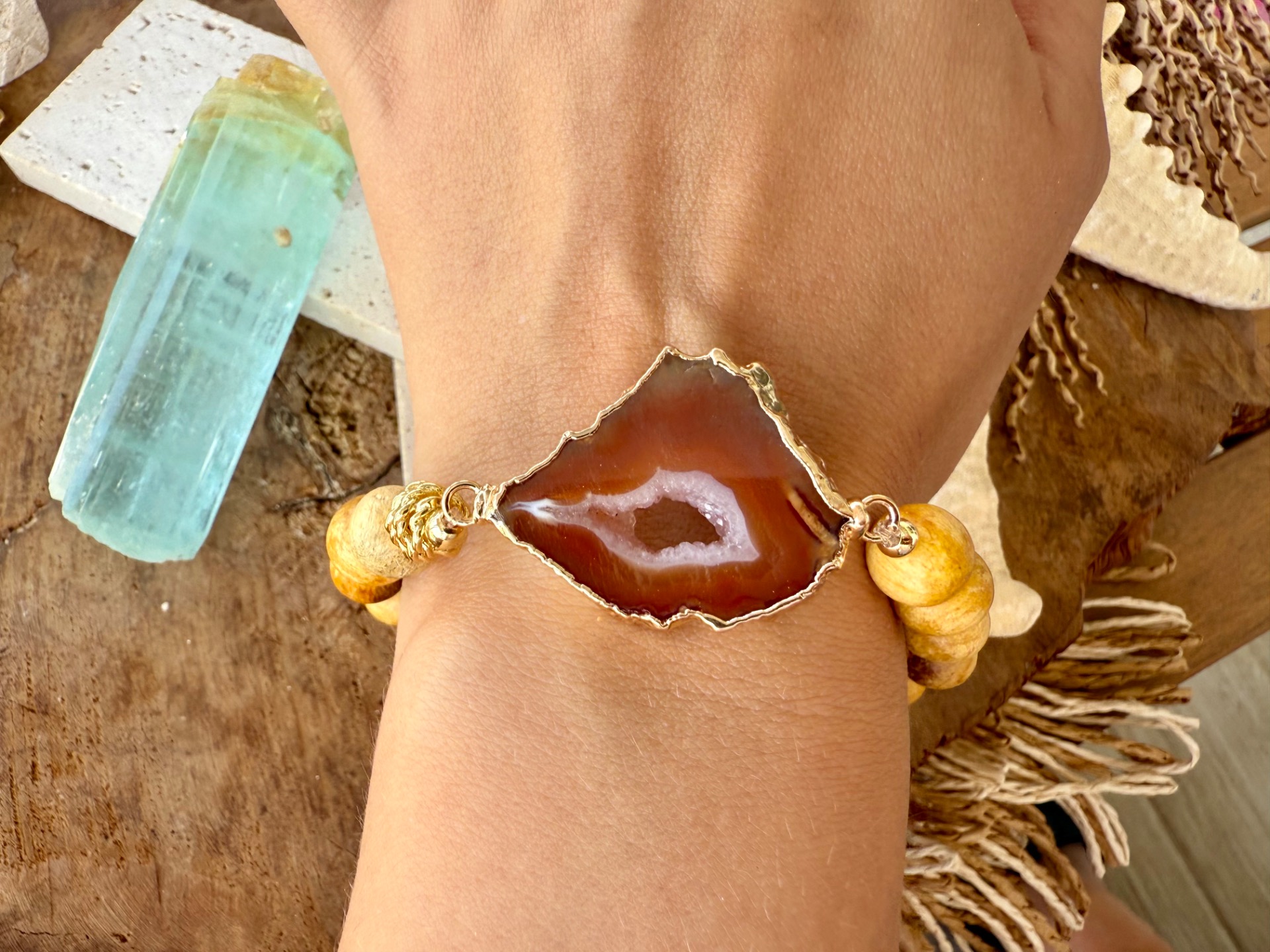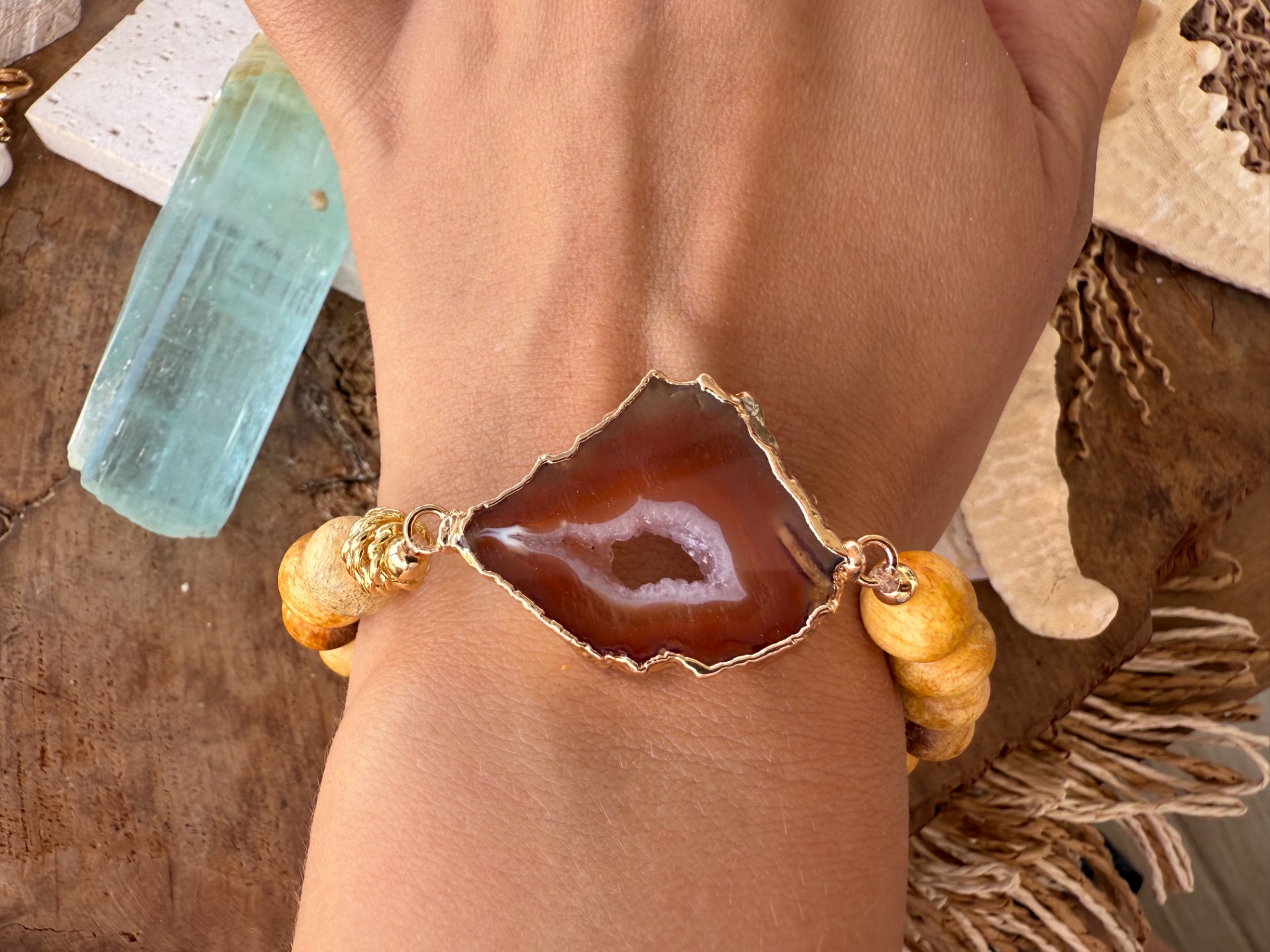 Energeticky silný a dizajnovo výnimočný náramok z kolekcie Sacra Tierra, ktorý spája silu zeme, ochranu a očistu. Dominantou náramku je sýtočervená achátová drúza v zlatom okove, symbol stability, uzemnenia a odvahy. Vedľa nej sa nachádza zdobená korálka s jemne zatočeným drôtikom – detail, ktorý nielen esteticky upúta, ale aj posilňuje energetické prúdenie šperku.